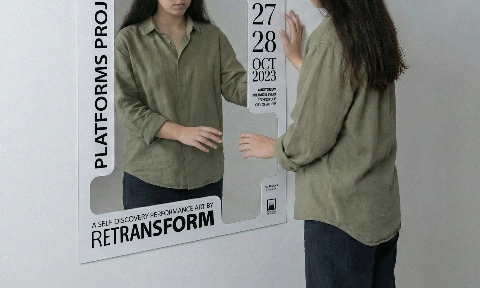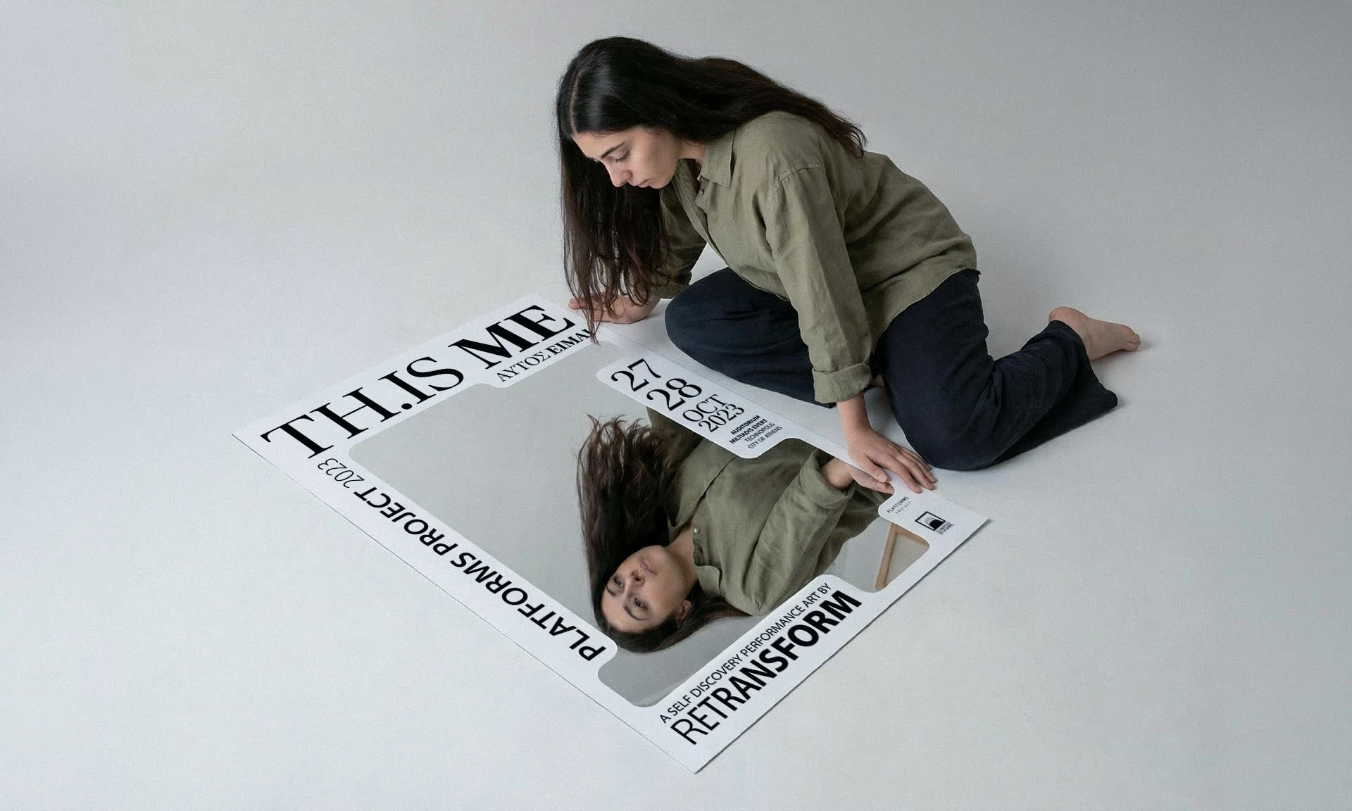 TH.IS ME (This is me) is the debut performance art of the group Retransform. The team composed and executed the project, as part of the independent art fair Platforms Project 2023 in Athens–Greece. The performance rests on the idea, that stepping away from daily routines fosters true self-discovery. The poster aims to capture this notion, arousing curiosity in the viewers and inviting them to embark on their own journey of self-discovery. The mirror as the composition’s centerpiece, manifests the concept of self-reflection. Serving as a visual metaphor, its placement is deliberate, thus encouraging viewers to engage in a symbolic dialogue with their own reflections. This immersive experience creates a lasting impression that extends beyond the obvious, reaching into the realm of personal contemplation.