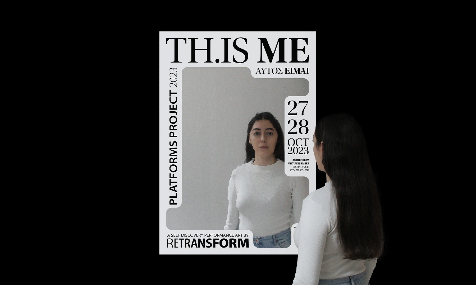 TH.IS ME (This is me) is the debut performance art of the group Retransform. The team composed and executed the project, as part of the independent art fair Platforms Project 2023 in Athens–Greece. The performance rests on the idea, that stepping away from daily routines fosters true self-discovery. The poster aims to capture this notion, arousing curiosity in the viewers and inviting them to embark on their own journey of self-discovery. The mirror as the composition’s centerpiece, manifests the concept of self-reflection. Serving as a visual metaphor, its placement is deliberate, thus encouraging viewers to engage in a symbolic dialogue with their own reflections. This immersive experience creates a lasting impression that extends beyond the obvious, reaching into the realm of personal contemplation.
