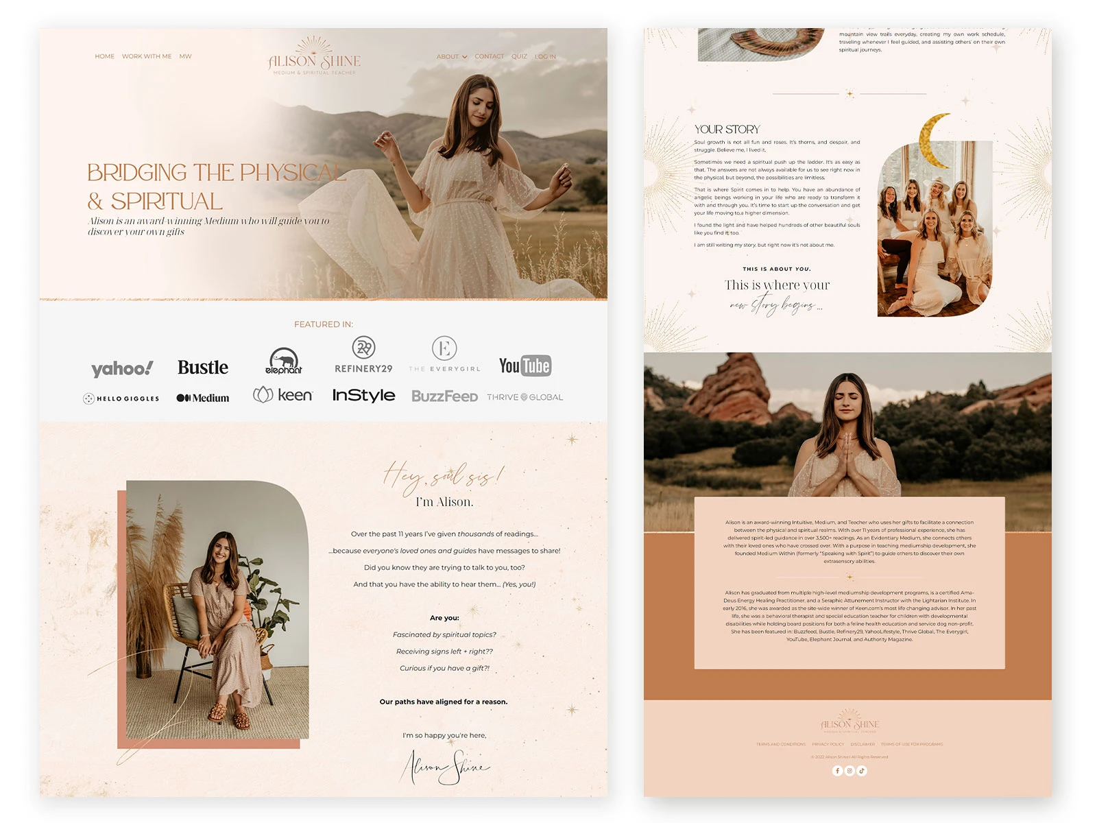 The project involved redesigning her entire website on Kajabi with a soft, feminine, and mystical theme, enhanced by gold graphic elements.