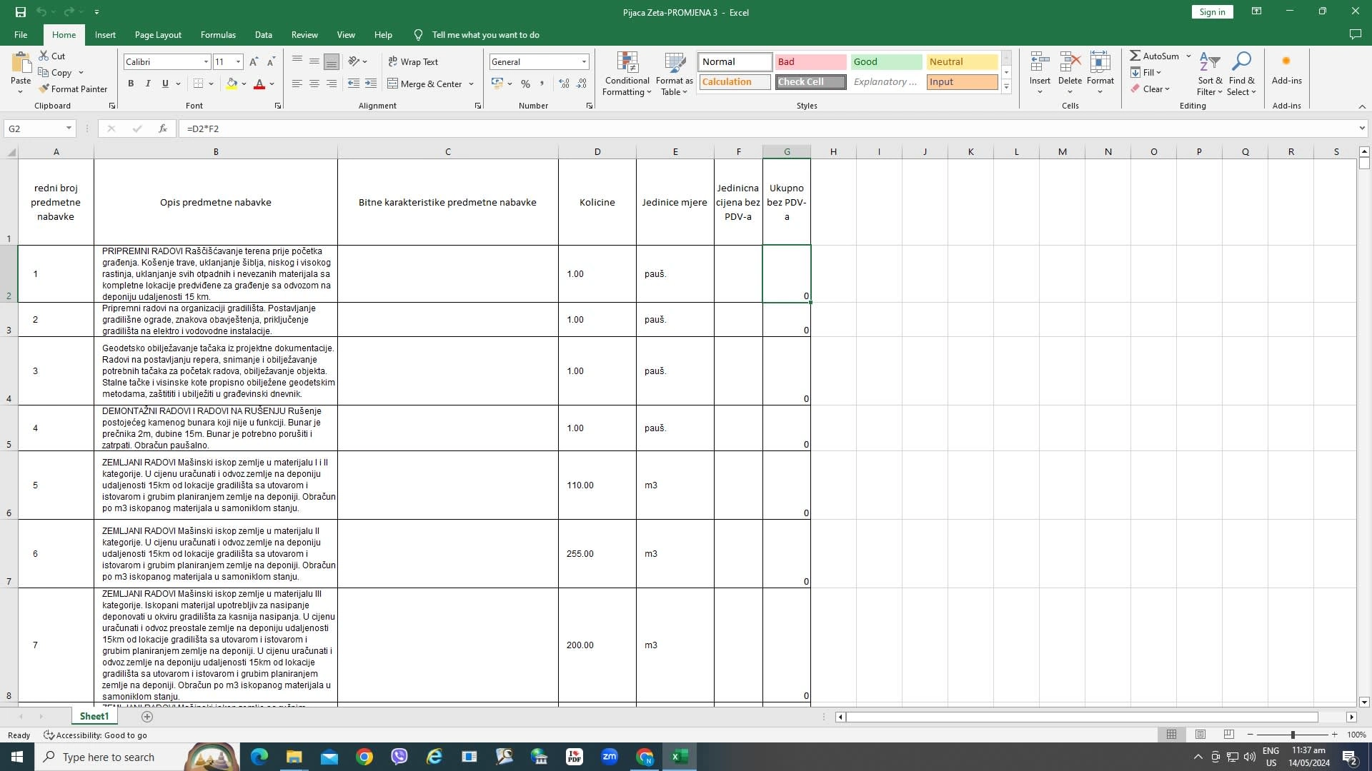 Transferring data from a pdf file to Excel, with the addition of formulas. The project was created for the purposes of drafting tender documentation