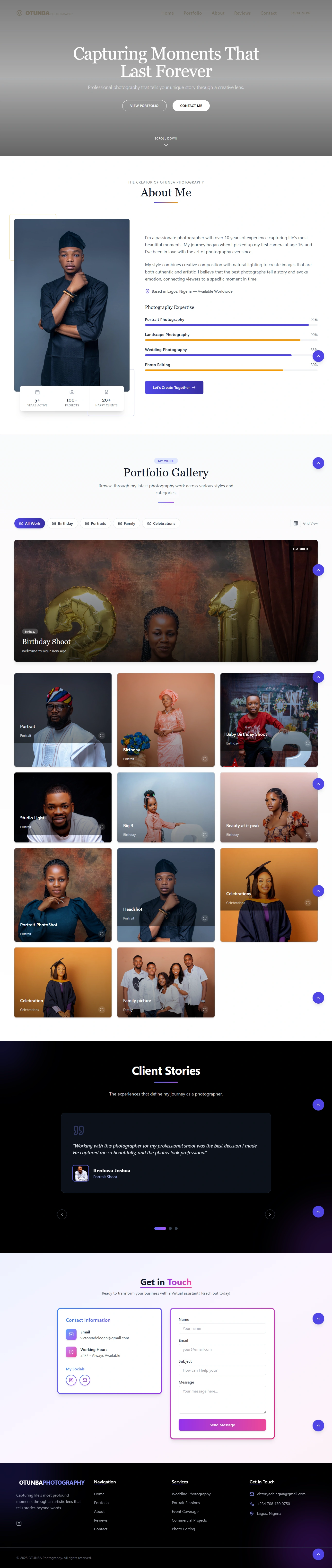 This project involved creating a modern, responsive portfolio website for a professional photographer. The site was designed to showcase the photographer’s work in an elegant, organized, and engaging way while making it easy for potential clients to learn about the services offered and get in touch. Built with a clean UI and smooth animations, the design focuses on visual storytelling and user-friendly navigation.