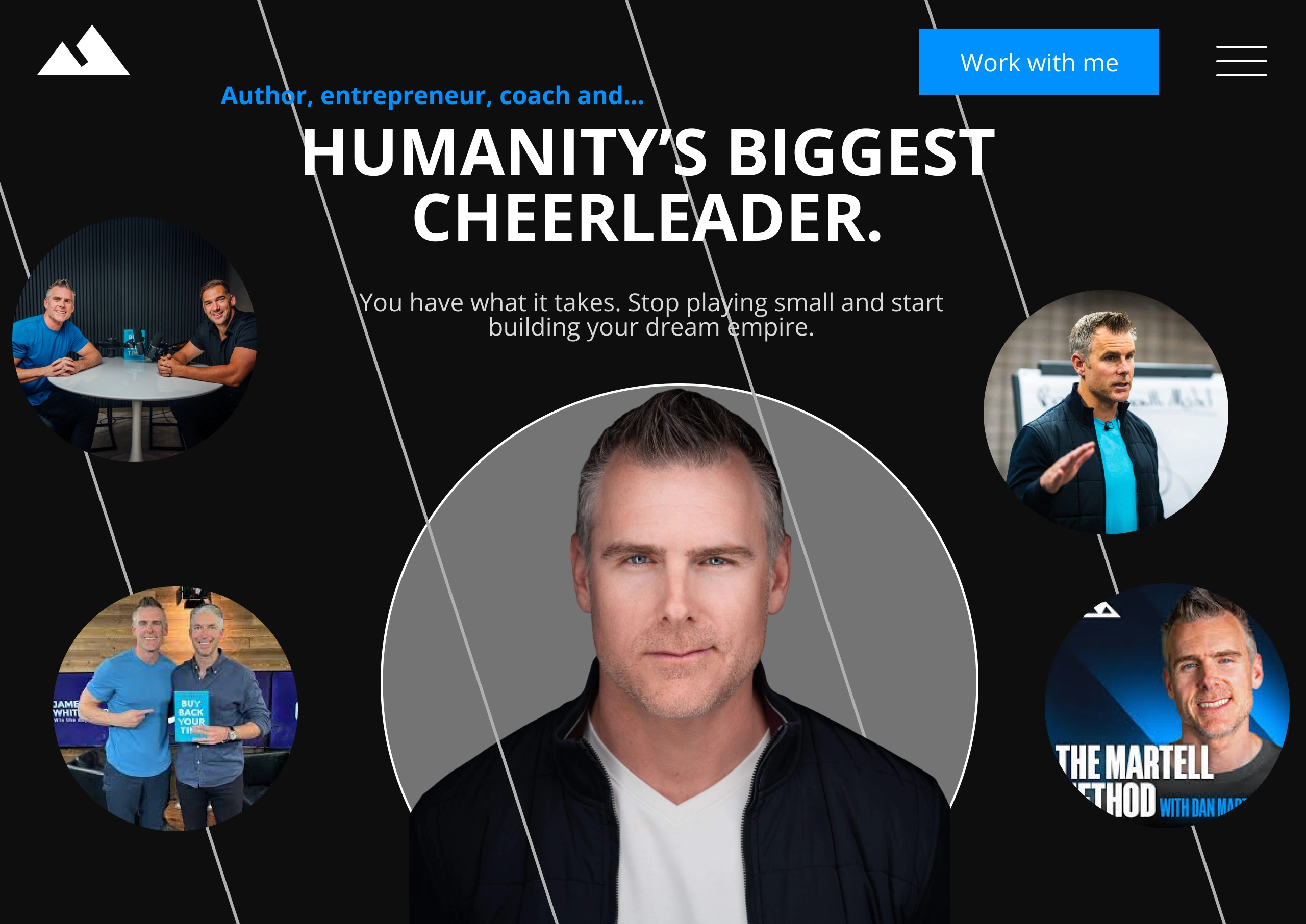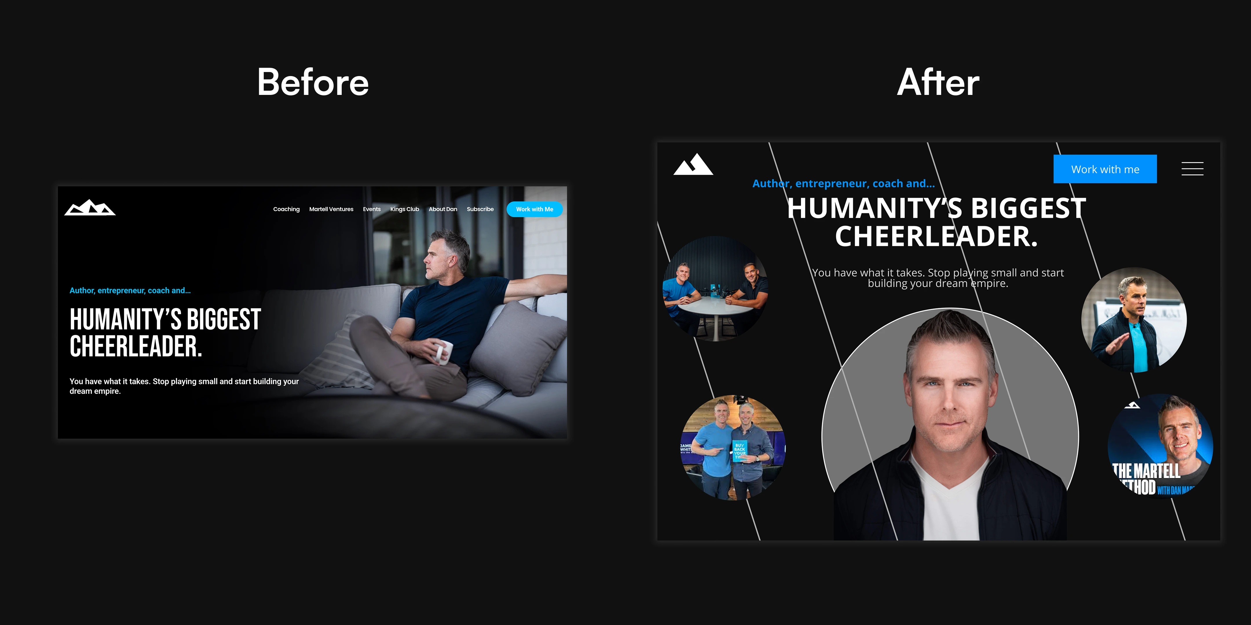 Dan Martell’s original site leaned heavily on a passive hero image and generic layout. My redesign restructured the hero section into a visually engaging experience that immediately centers Dan as the product and personality. Using angled dividers, circular imagery, and stronger text alignment, I turned a static presence into a high-energy, trust-building entry point. The “Work With Me” CTA is now visually and structurally anchored to improve conversion. Overall, this redesign better communicates Dan’s credibility while giving his brand a high-performance edge.