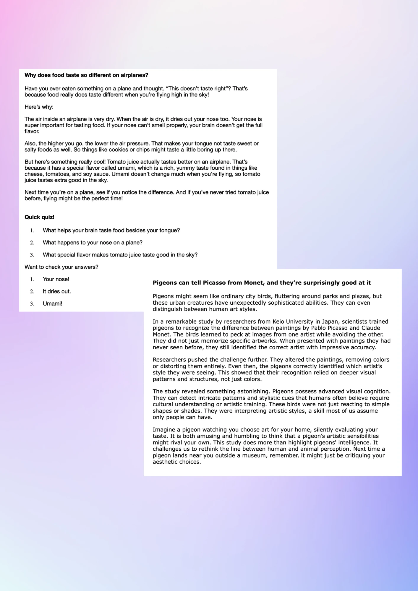I created two research-based English longform articles for a US-based client, combining scientific explanation with narrative flow. Why does food taste different on airplanes? breaks down a science topic in a simple, engaging way, using everyday language, clear cause and effect, and a light interactive element to keep the reader involved. Pigeons can tell Picasso from Monet takes a surprising study and turns it into an editorial style story, balancing credibility with curiosity and ending with a broader reflection on perception and intelligence.