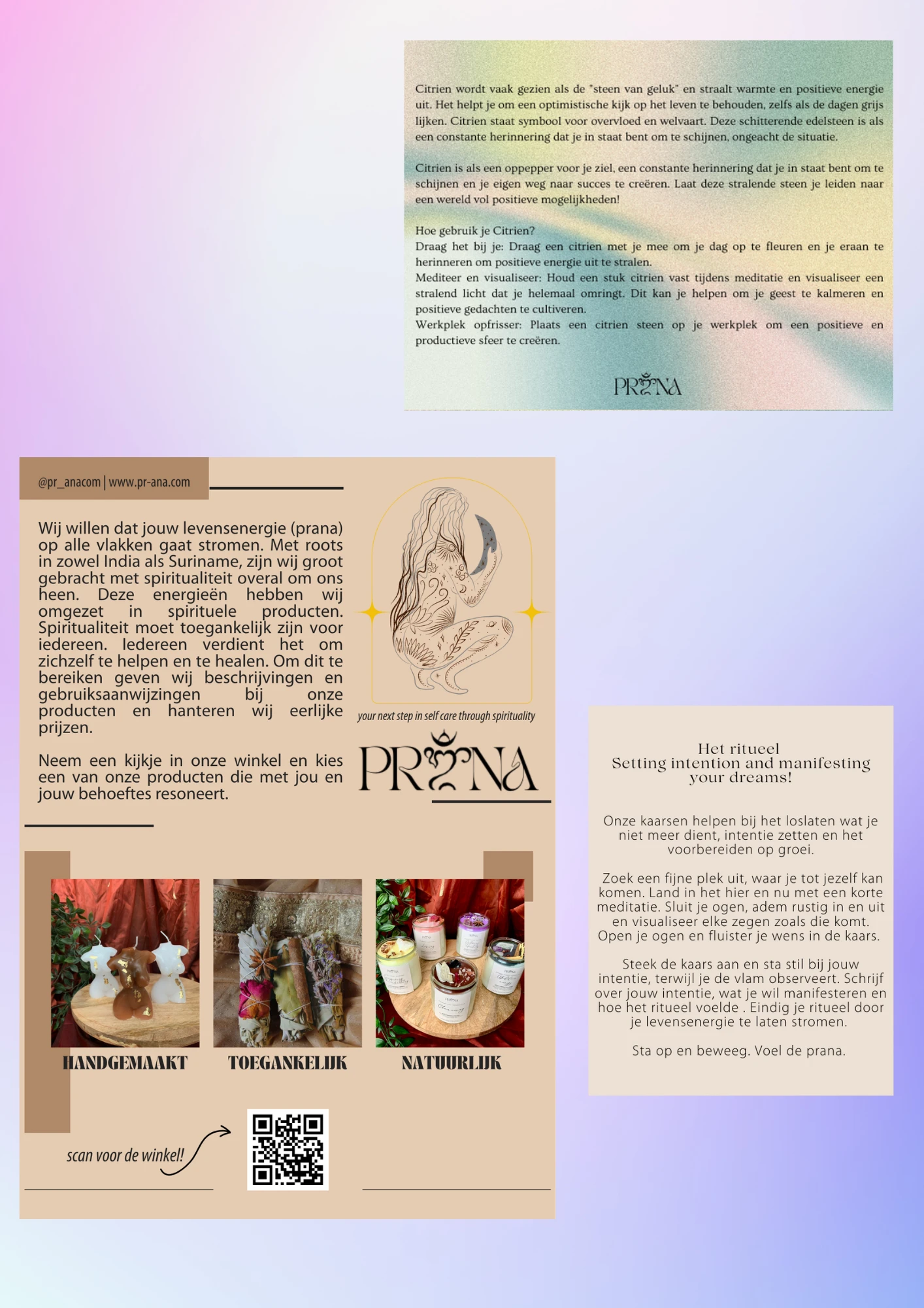For Prana, I wrote website copy, product descriptions and ritual texts for spiritual products such as crystals and candles. These texts combine symbolism with practical guidance, making spiritual practices feel approachable, grounded, and relevant to daily life. The copy is designed to guide, not instruct, and to support reflection and intention rather than push belief. Editorial and longform content