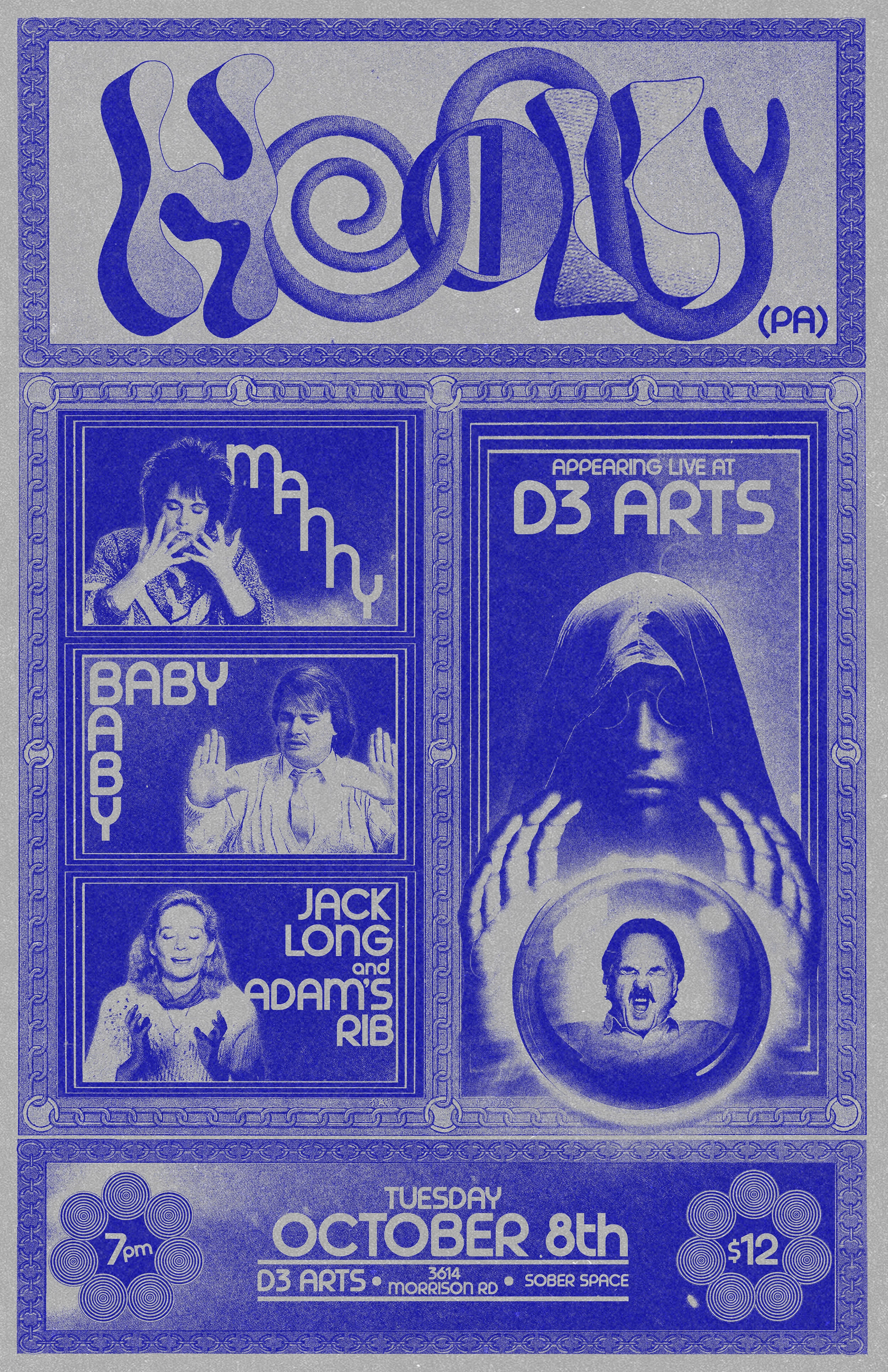 Psychedelic-inspired poster for a local show at D3 Arts, blending vintage print aesthetics with a touch of humor to match the lineup’s chaotic charm.