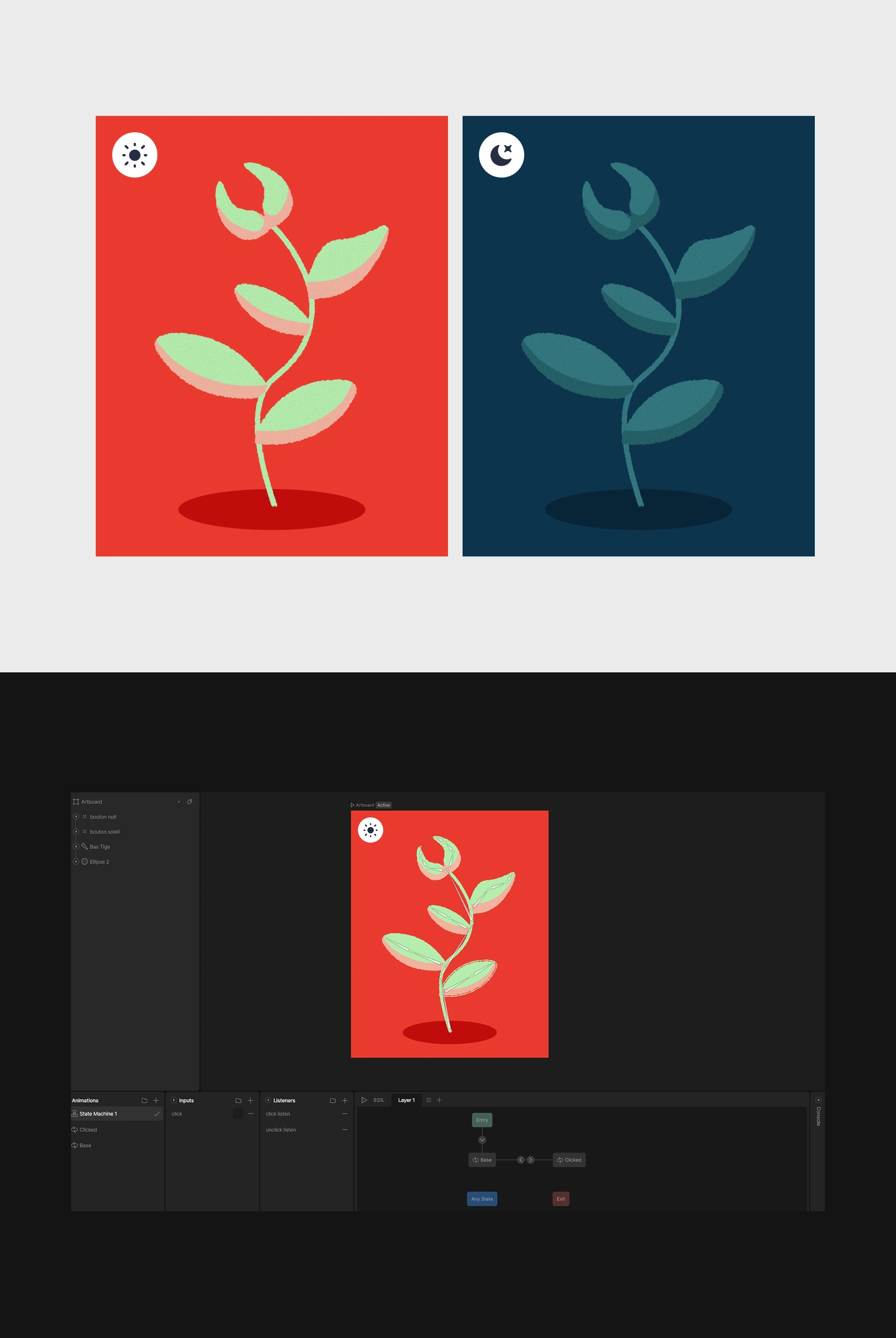 The goal was to play with interactivity and mimic a cute plant with its leaves slowly moving from the wind. It was a good occasion to test button triggers.