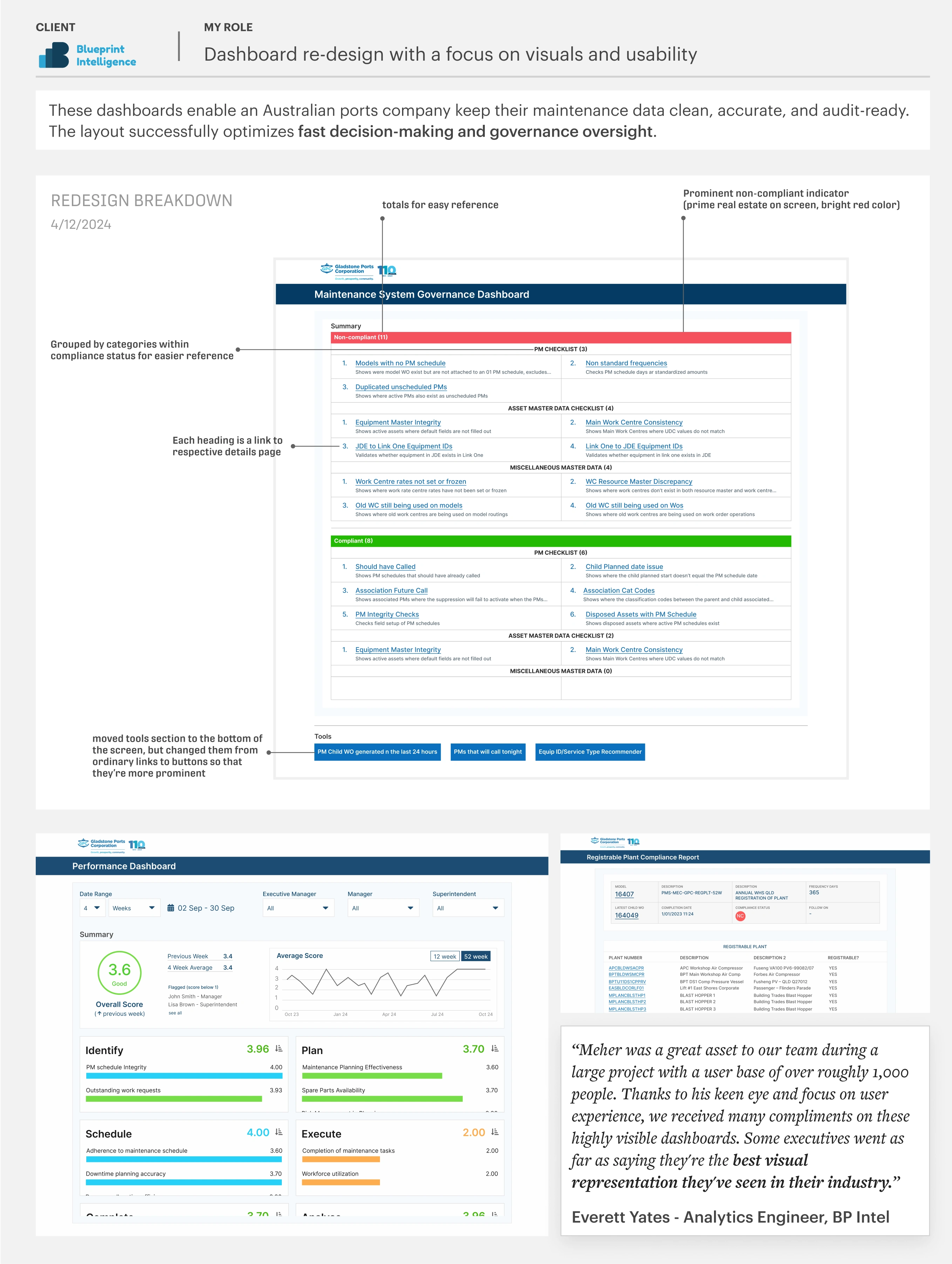 I led the redesign of a mission-critical maintenance and asset-management dashboard for an Australian ports organisation, as part of Blueprint Intelligence’s Clarity analytics ecosystem. The client’s legacy interface suffered from data fragmentation, lack of clarity in compliance reporting, and poor visibility into maintenance performance. These challenges inhibited fast, confident decision-making across multiple operational teams.