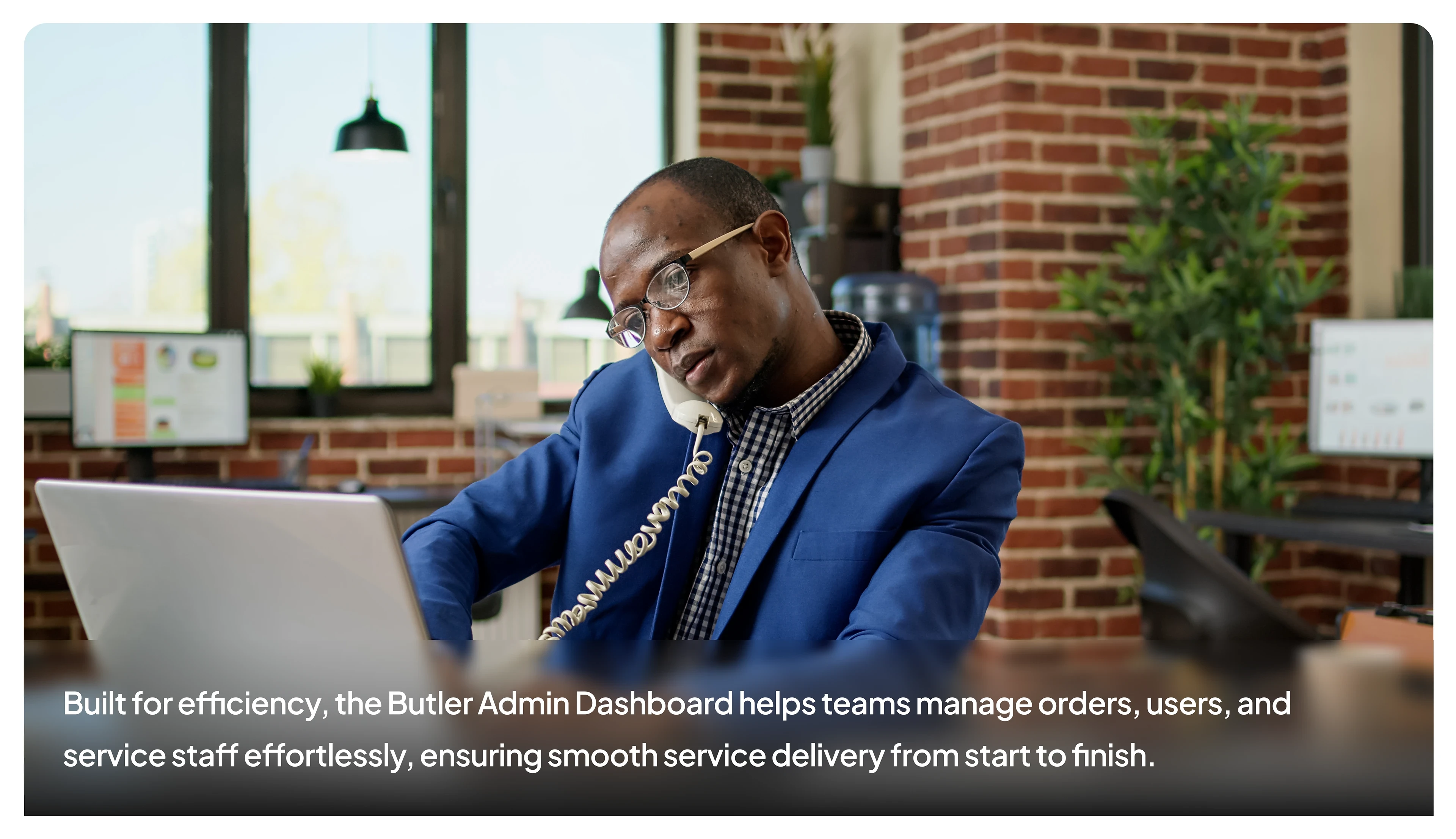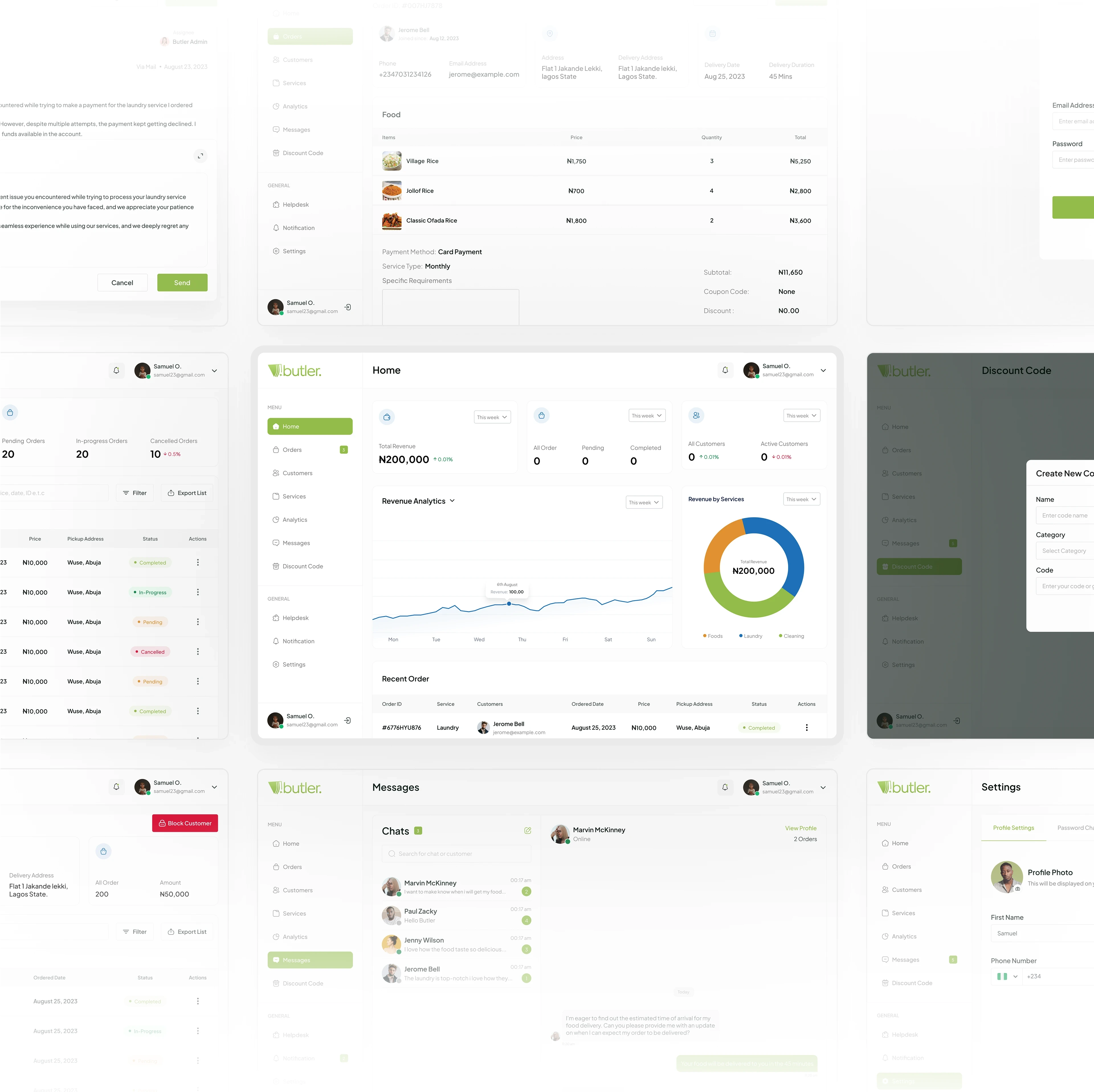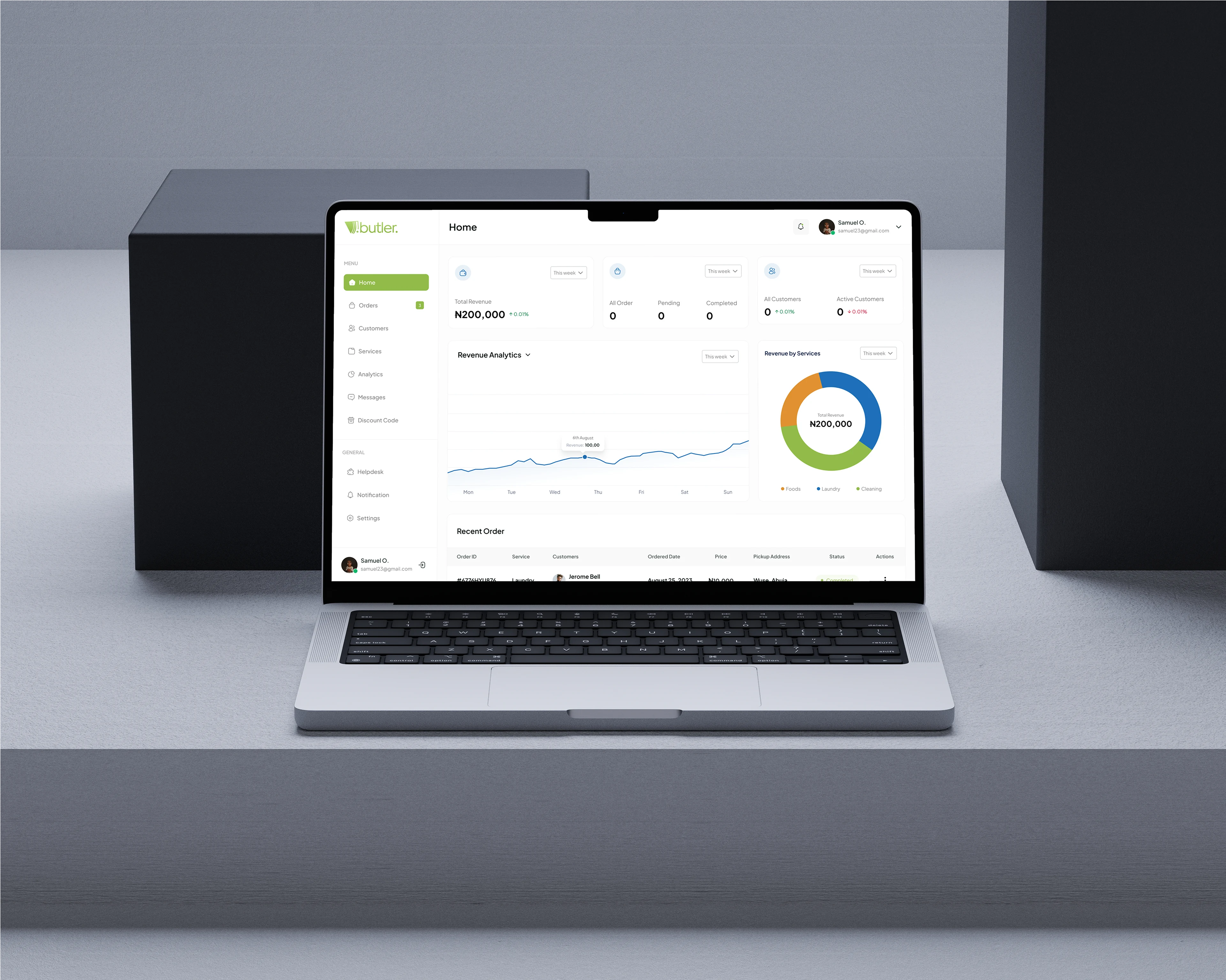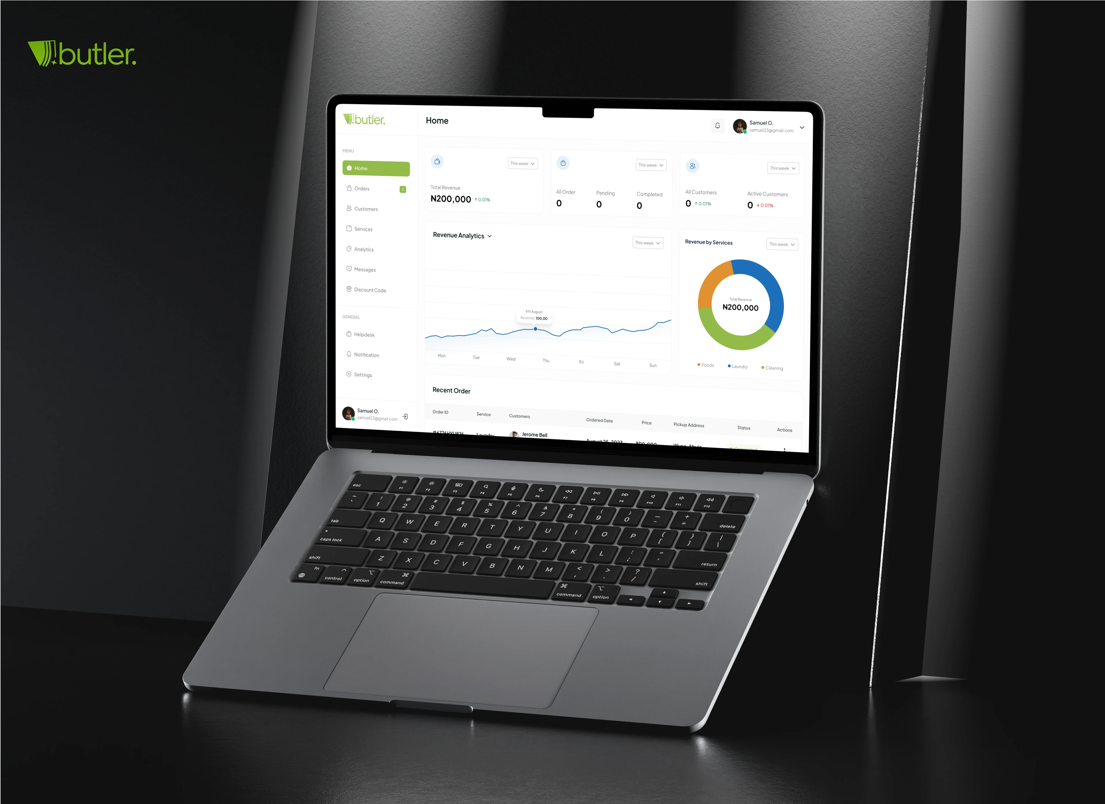 Butler Admin CRM Dashboard streamlines service management by enabling easy order tracking, user management, and insights for efficient business operations.
