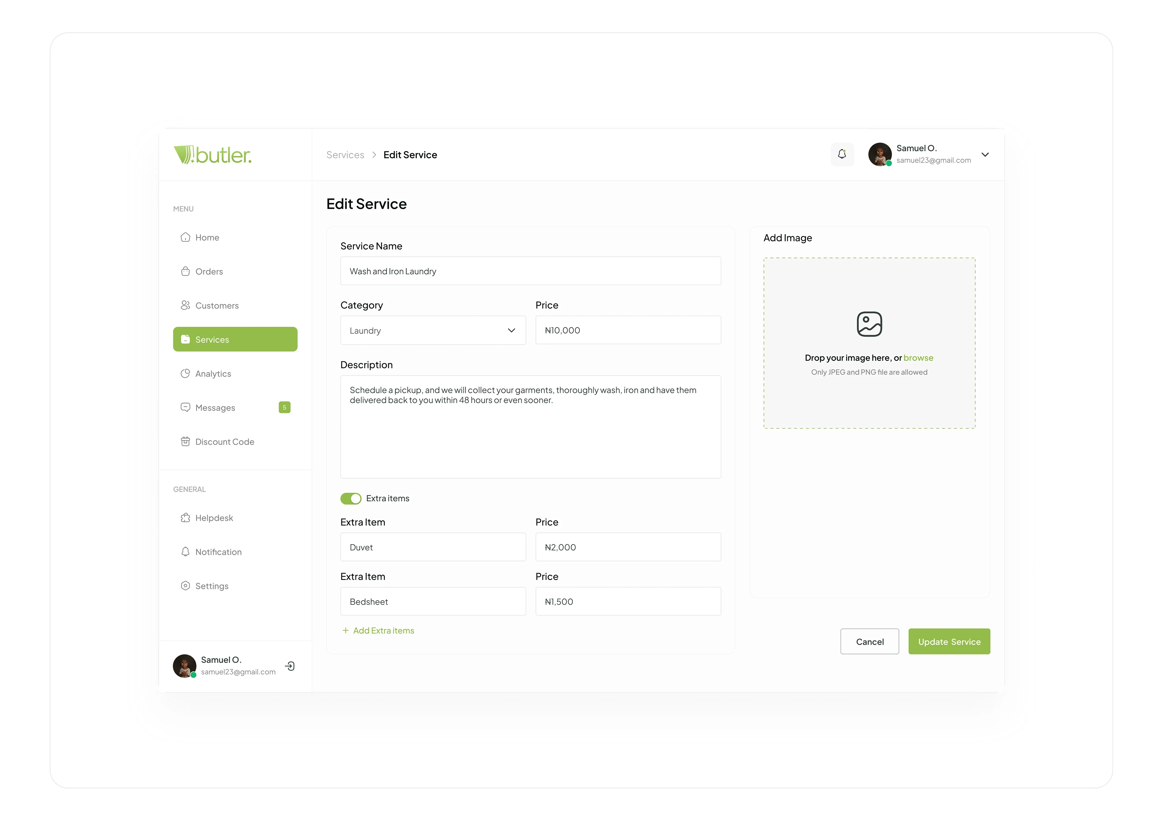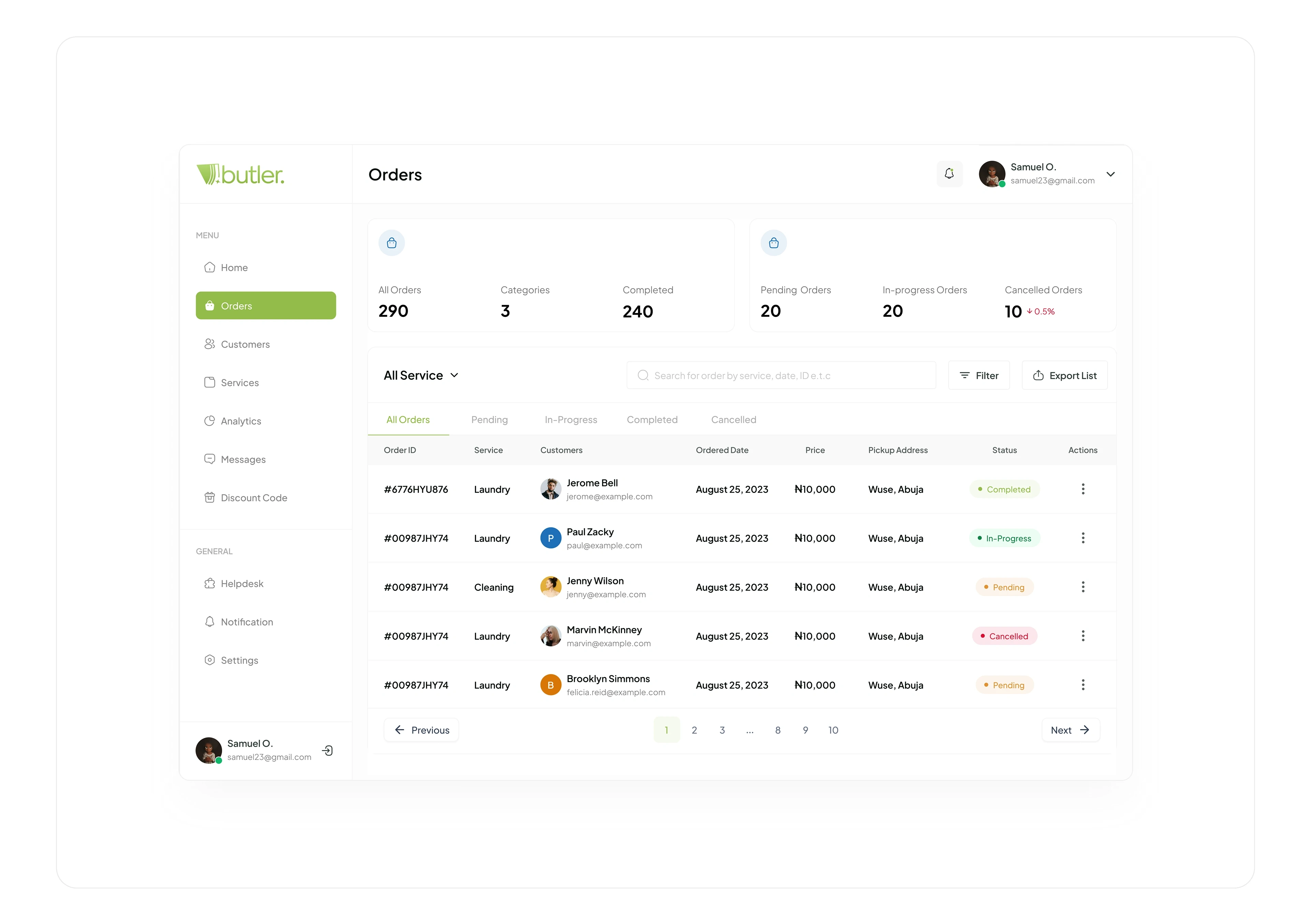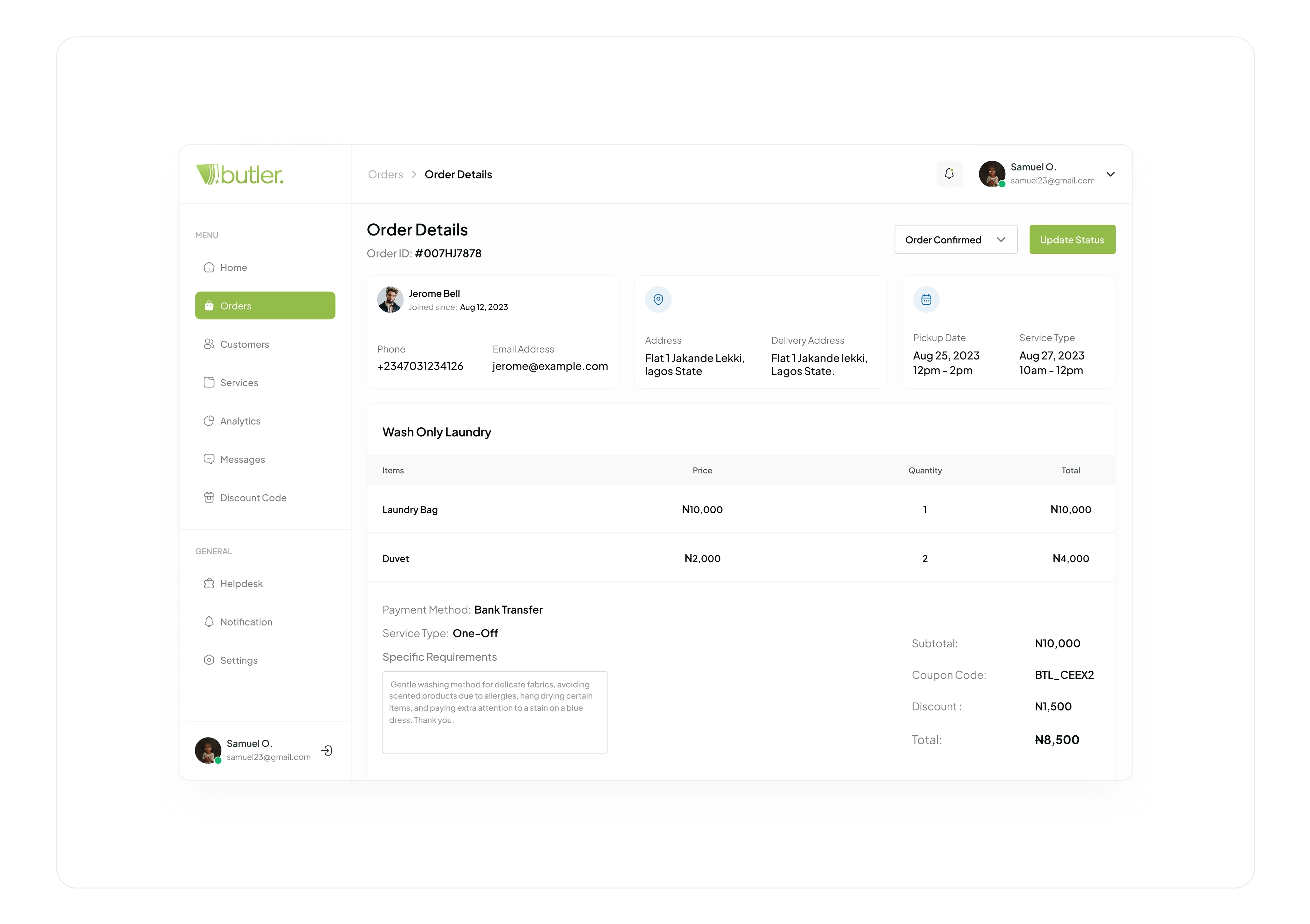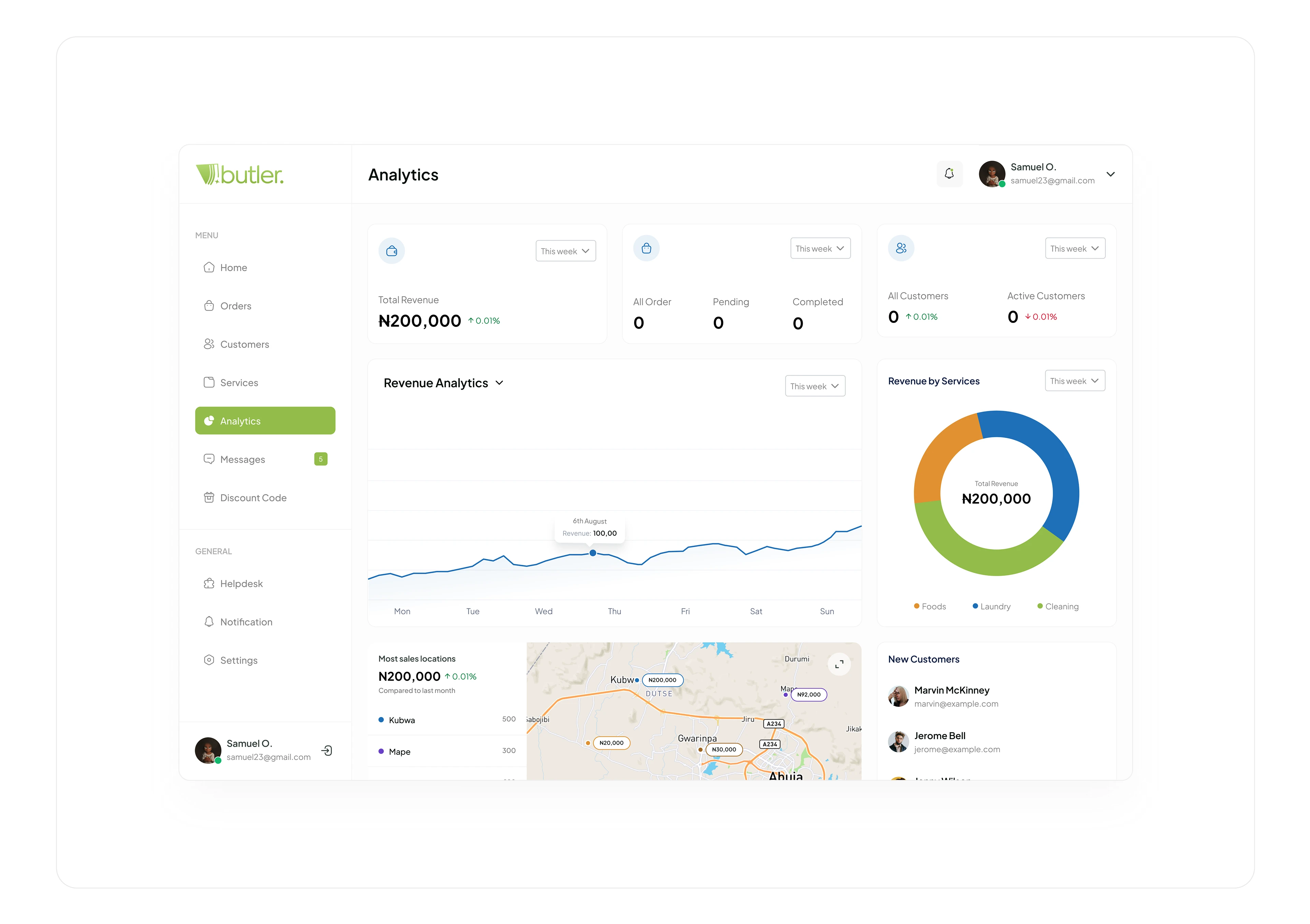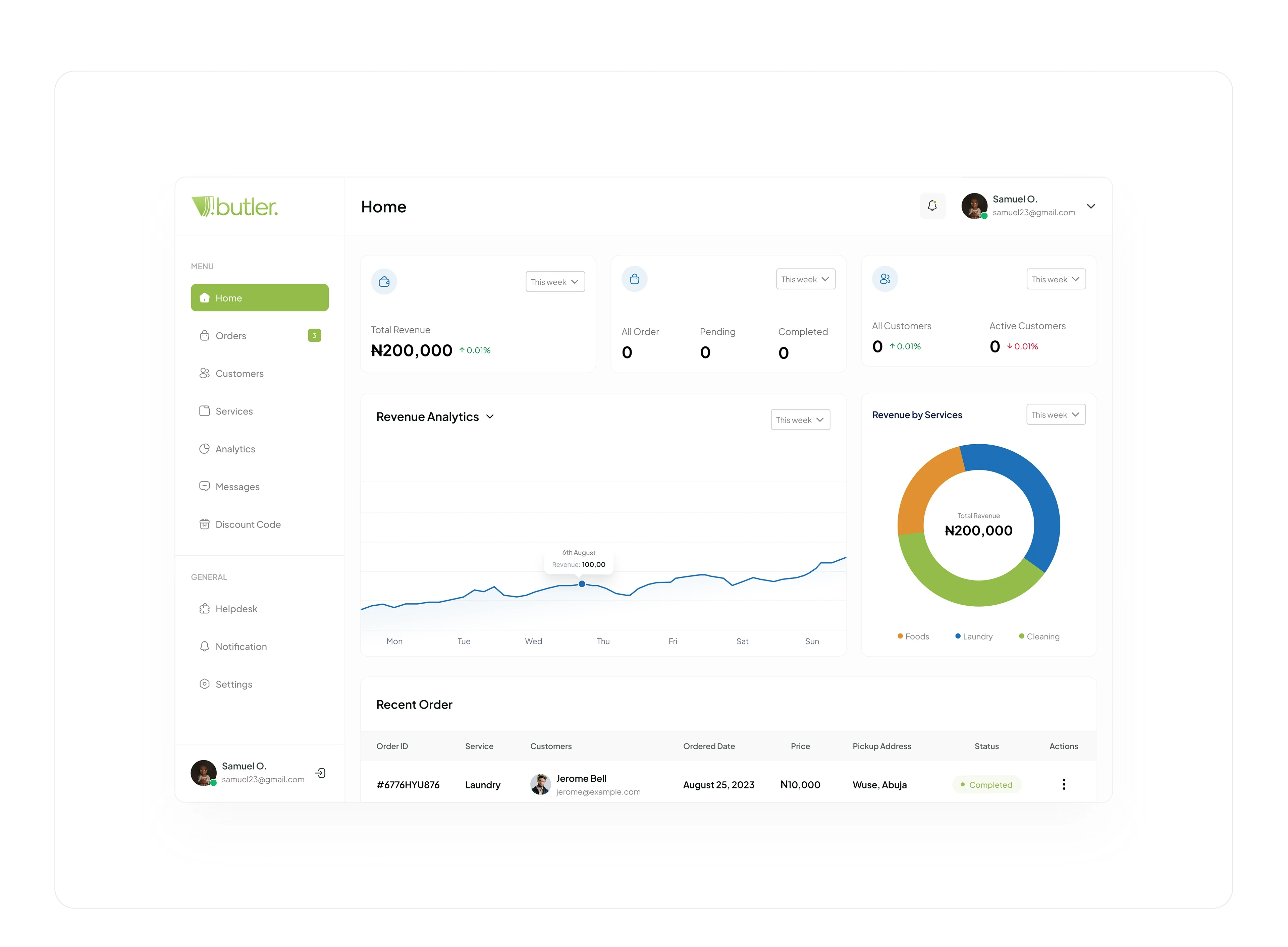 Butler Admin CRM Dashboard streamlines service management by enabling easy order tracking, user management, and insights for efficient business operations.