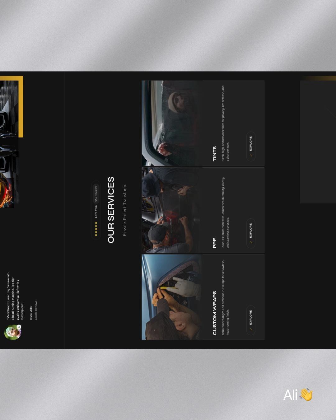 The objective was to create a website that reflects the brand’s high-end positioning while clearly presenting services like wraps, paint protection film (PPF), and tinting in a structured and conversion-oriented way.