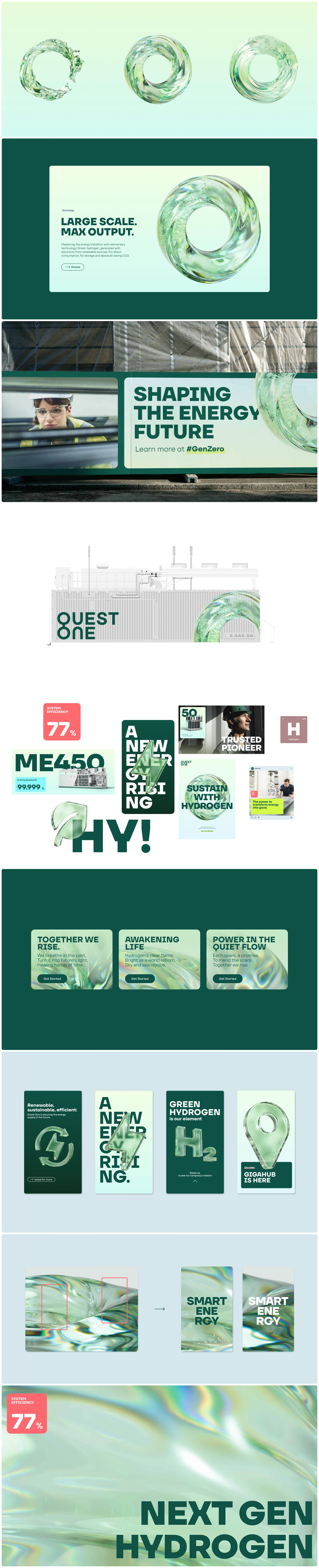 Strichpunkt, I developed the "Hydrogen Circle," a powerful 3D key visual that symbolizes QuestOne’s mission. This visual, which represents the cyclical nature of hydrogen energy, embodies the brand's forward-thinking approach and their quest for global environmental impact. Through extensive exploration of over 50 iterations, we refined key aspects such as twist, openness, and color gradients, ultimately crafting a dynamic, modular design that could be used flexibly across all channels, from digital platforms to large-scale print applications