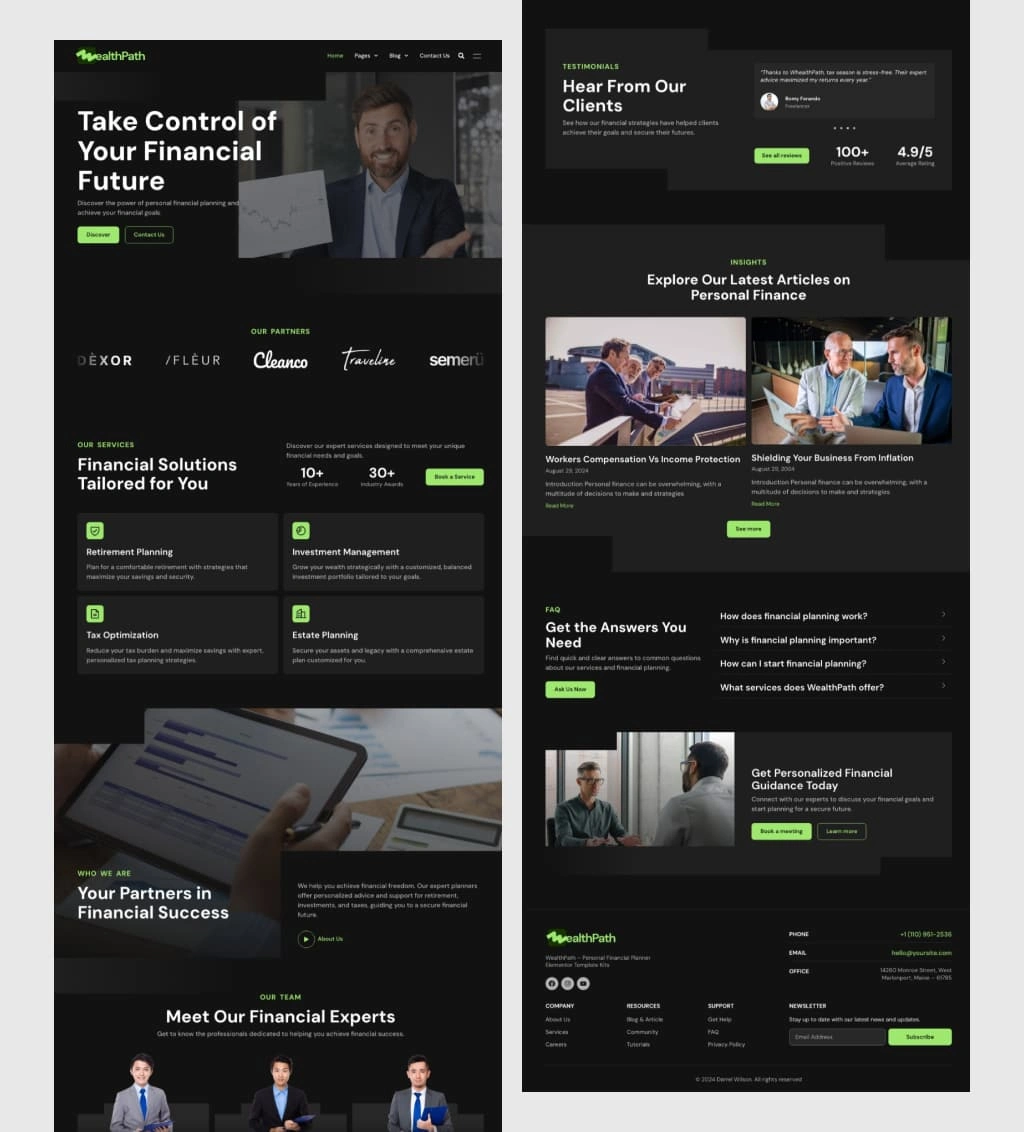 A refined WordPress web design built with Elementor, crafted for a personal financial planner template kit to enhance financial service experiences.
