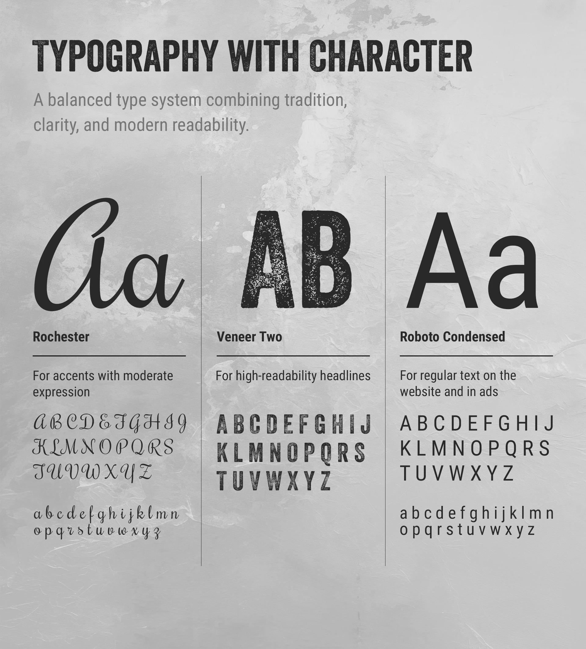 A three-typeface system was developed to balance expression and clarity: