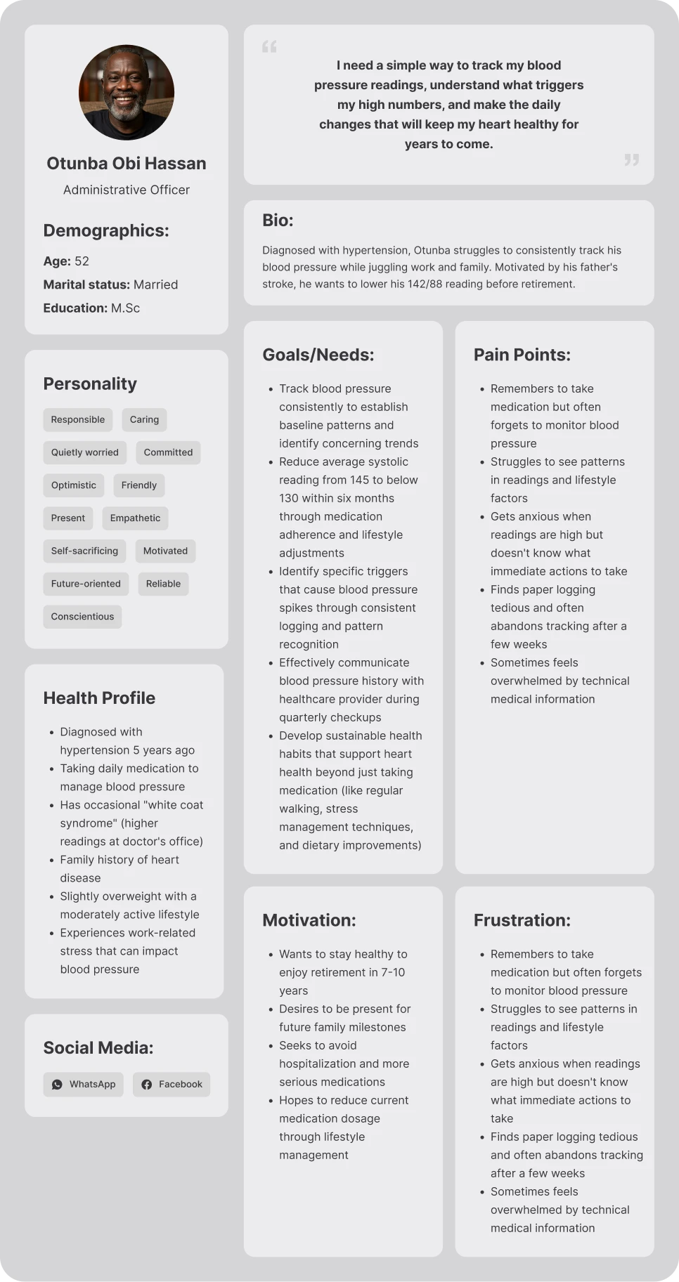 The persona clearly articulated Otunba's need for "a simpler way to monitor his heart health," indicating a desire for a more effective solution.