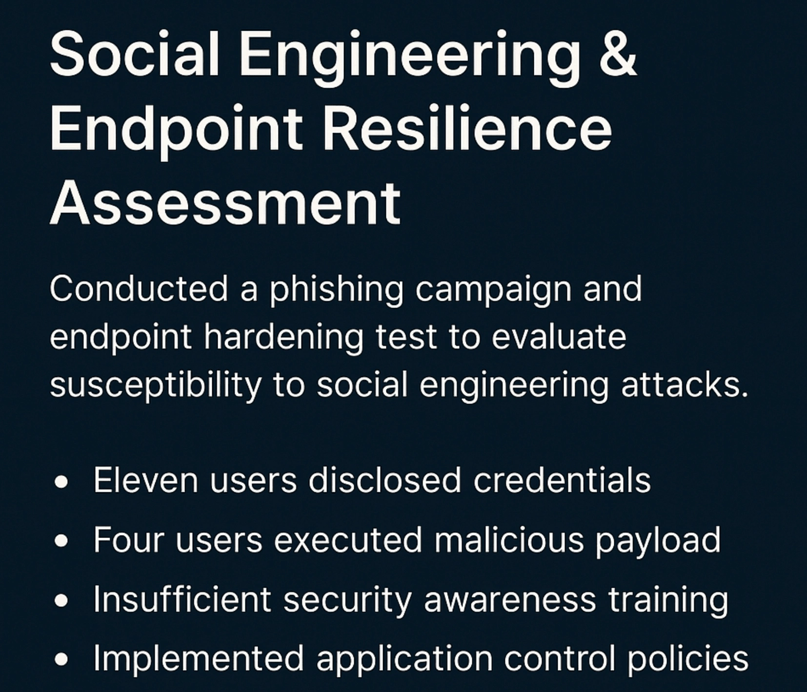 Ran a phishing simulation for 75 users to test awareness and defenses. Identified gaps in endpoint hardening, credential use, and user response.