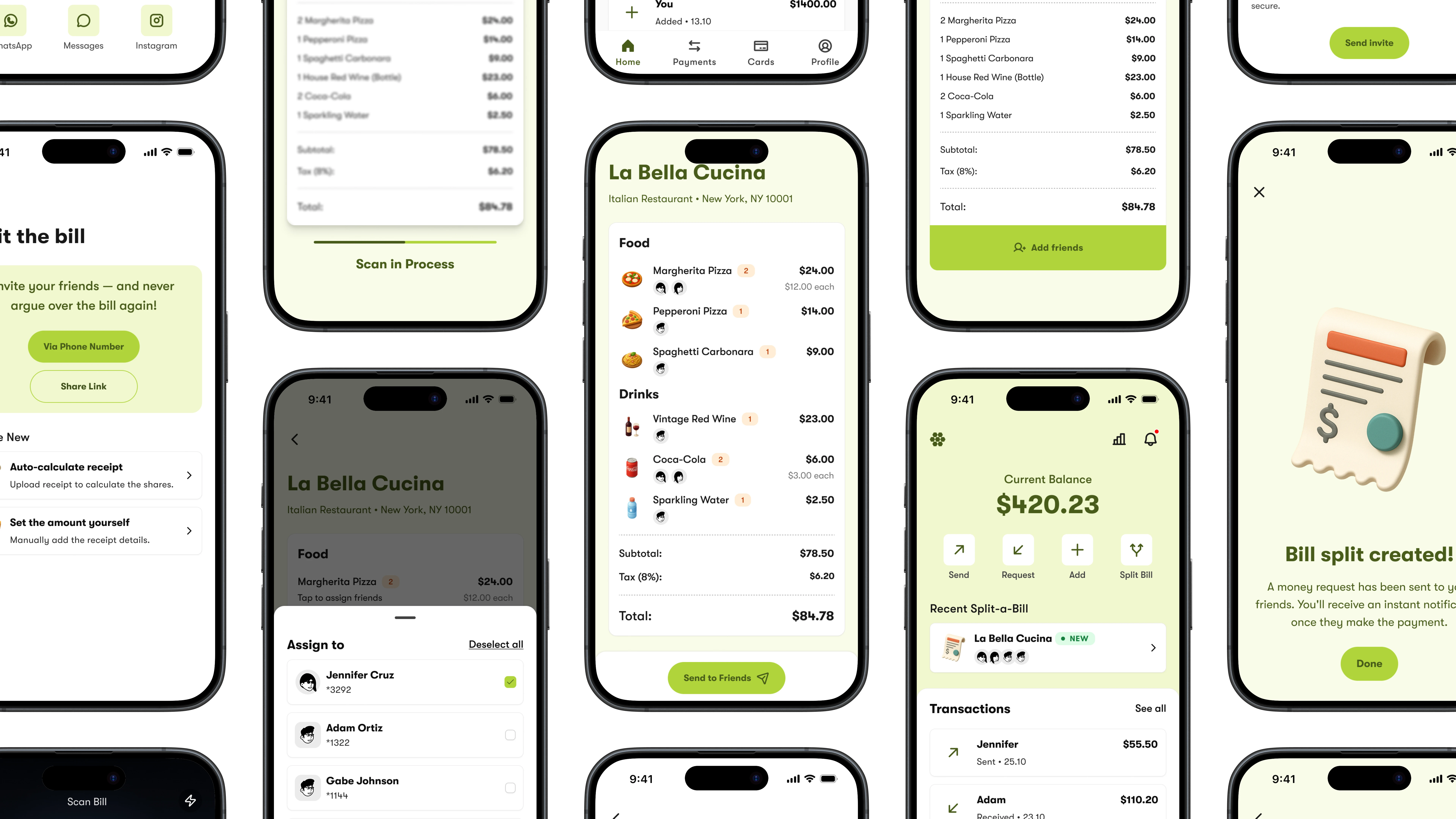 Concept design for a bill splitting app, making the end-of-night-out-dining experience less awkward & more engaging.