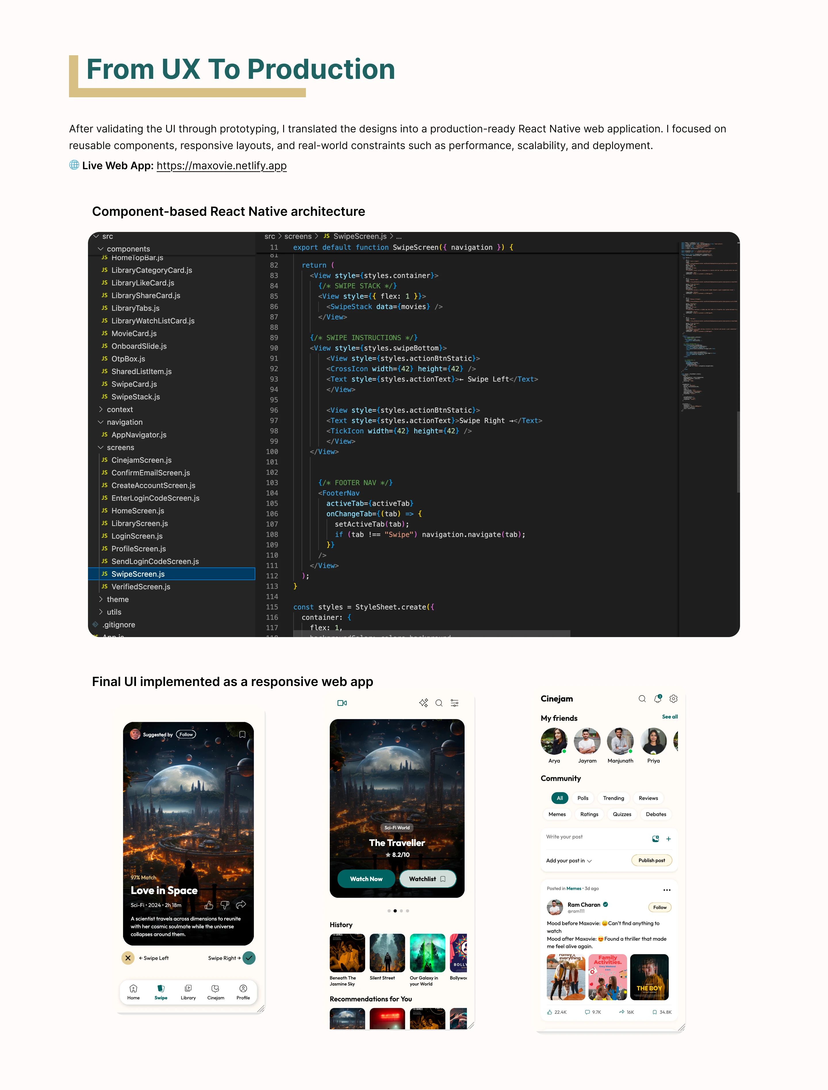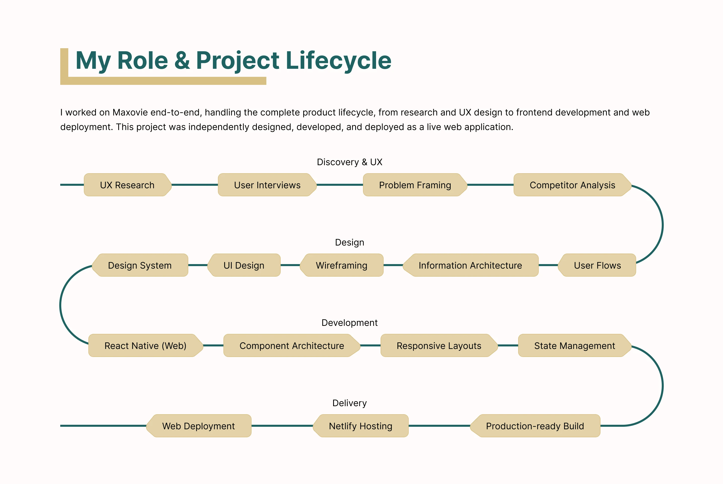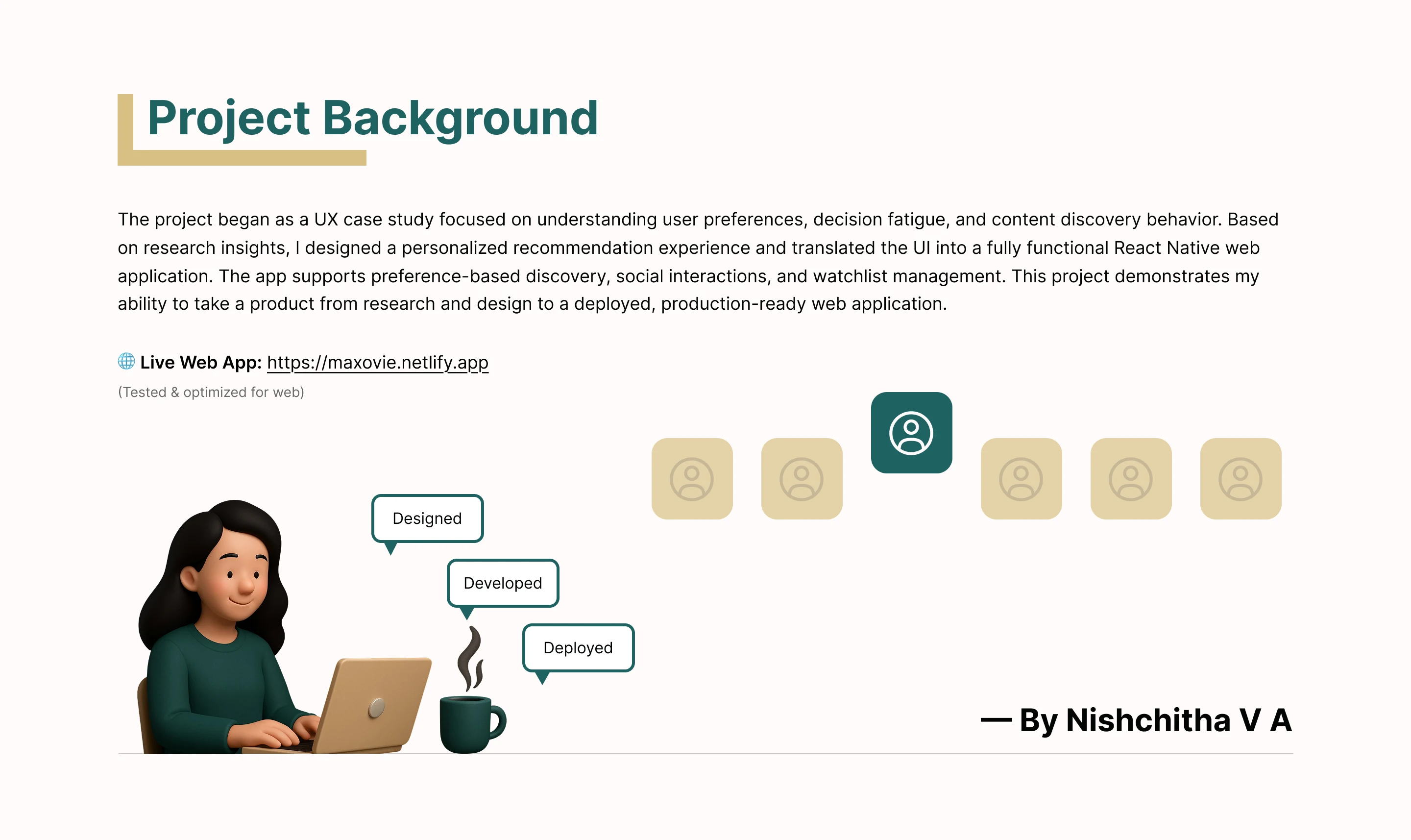 Maxovie is an end-to-end UX and front-end engineering project where I designed, developed, and deployed a production-ready movie recommendation web app.
