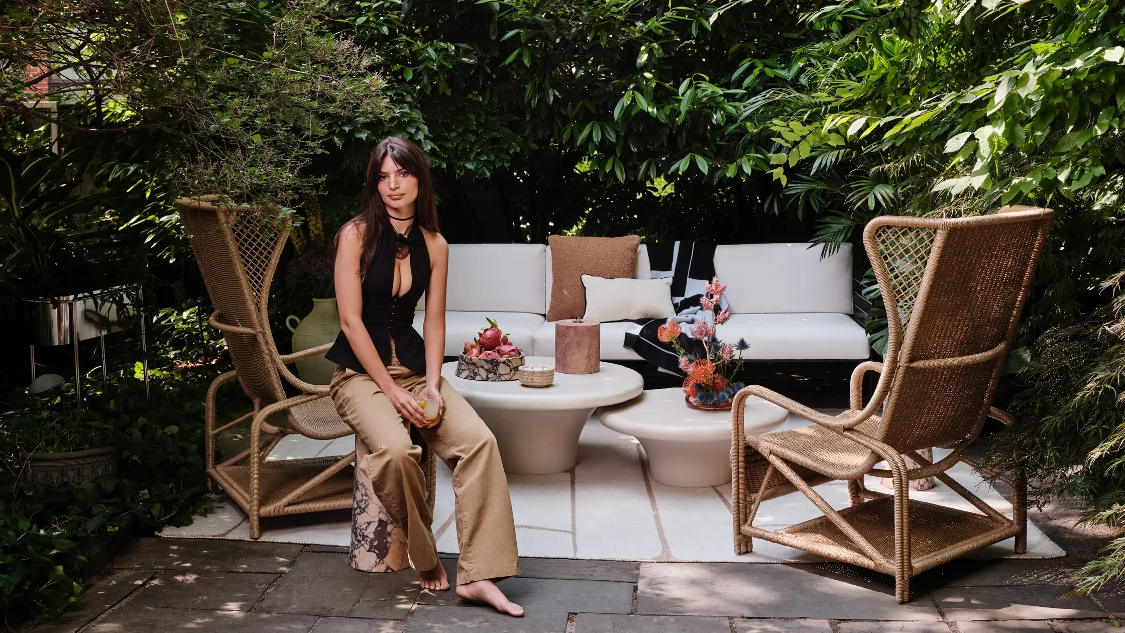 Emily Ratajkowski teamed up with CB2 to outfit the headquarters of Inamorata, the swimwear and clothing line she launched in 2017 with friend Kat Mendenhall. Inspired by the look and feel of an inviting domicile with a ’70s flair, the SoHo office’s vibe is closer to that of a comfy living room than a typical