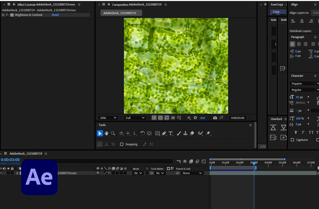 The chloroplast footage was sourced from Adobe Stock (in .mov format) and edited in After Effects to adjust brightness, timing, and length.