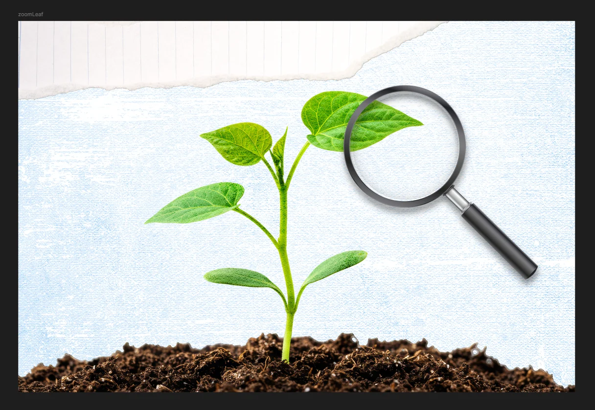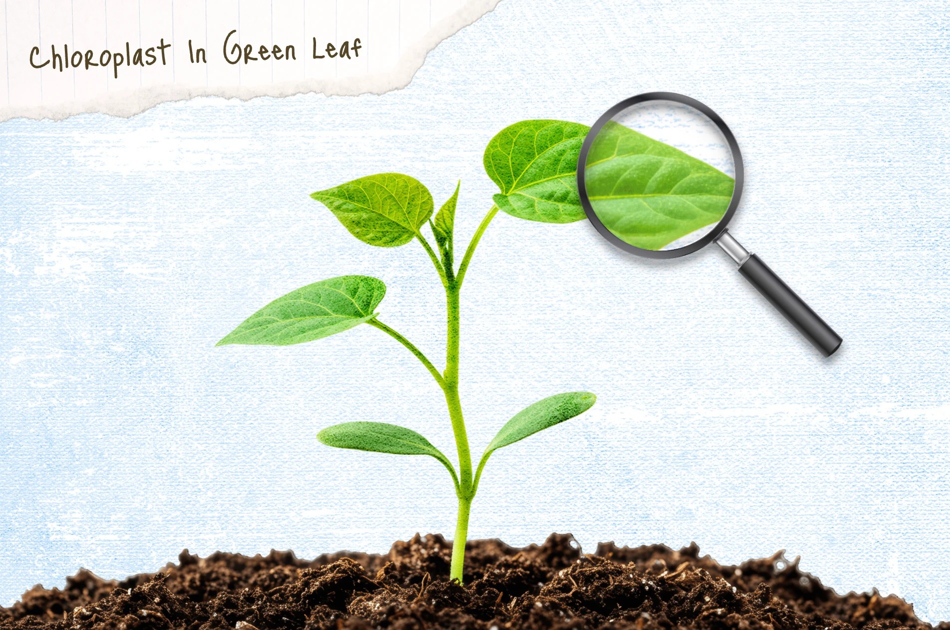 Learners can move a magnifying glass with their cursor to observe the surface of a leaf up close. By clicking, they can zoom in further to see a short looping video of chloroplasts moving inside the leaf cells.