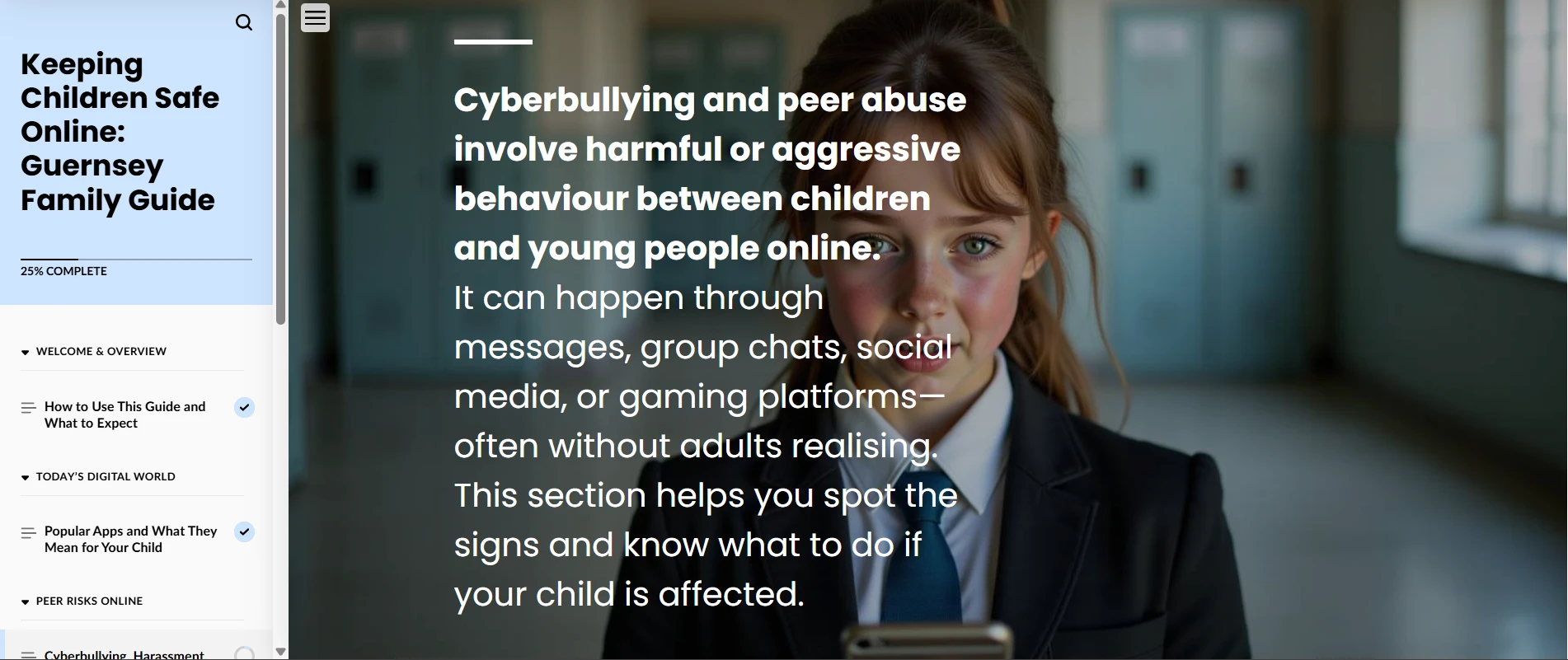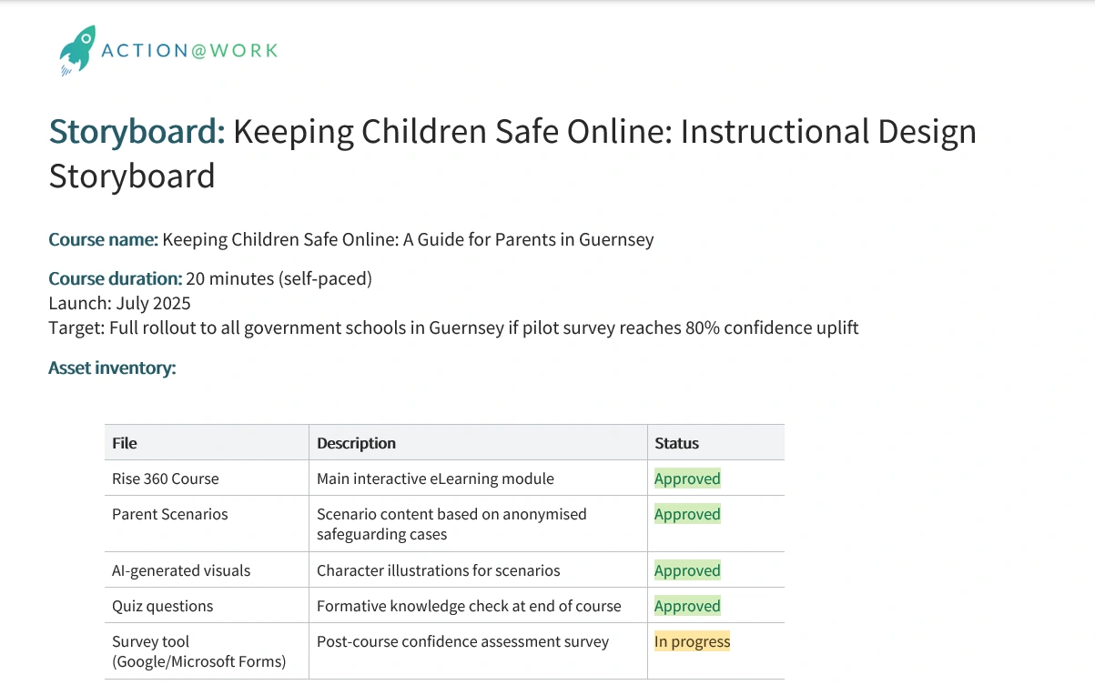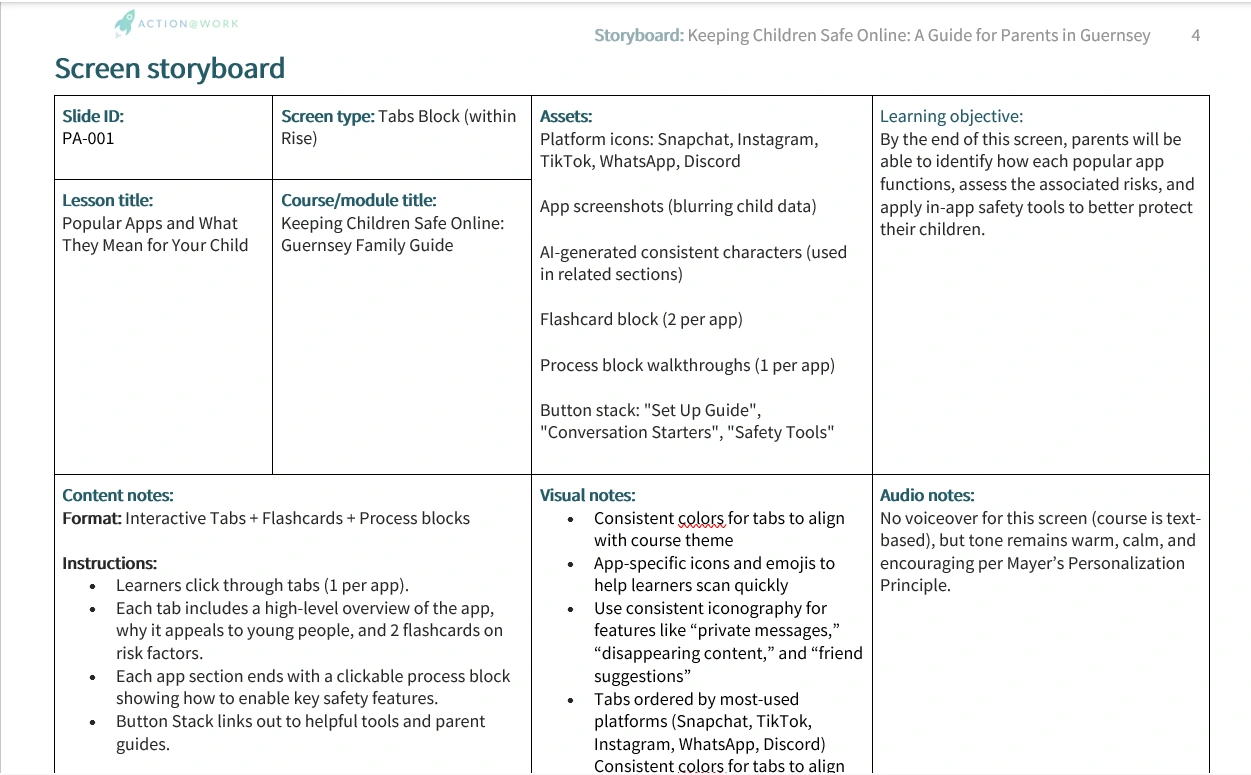 A scenario-driven, visually rich eLearning guide was developed using Articulate Rise 360. It focuses on real-world online dangers related to social apps like Snapchat, TikTok, Instagram, WhatsApp, and Discord. Each section includes interactive blocks, visual guides, and decisions points designed to engage and empower adults.