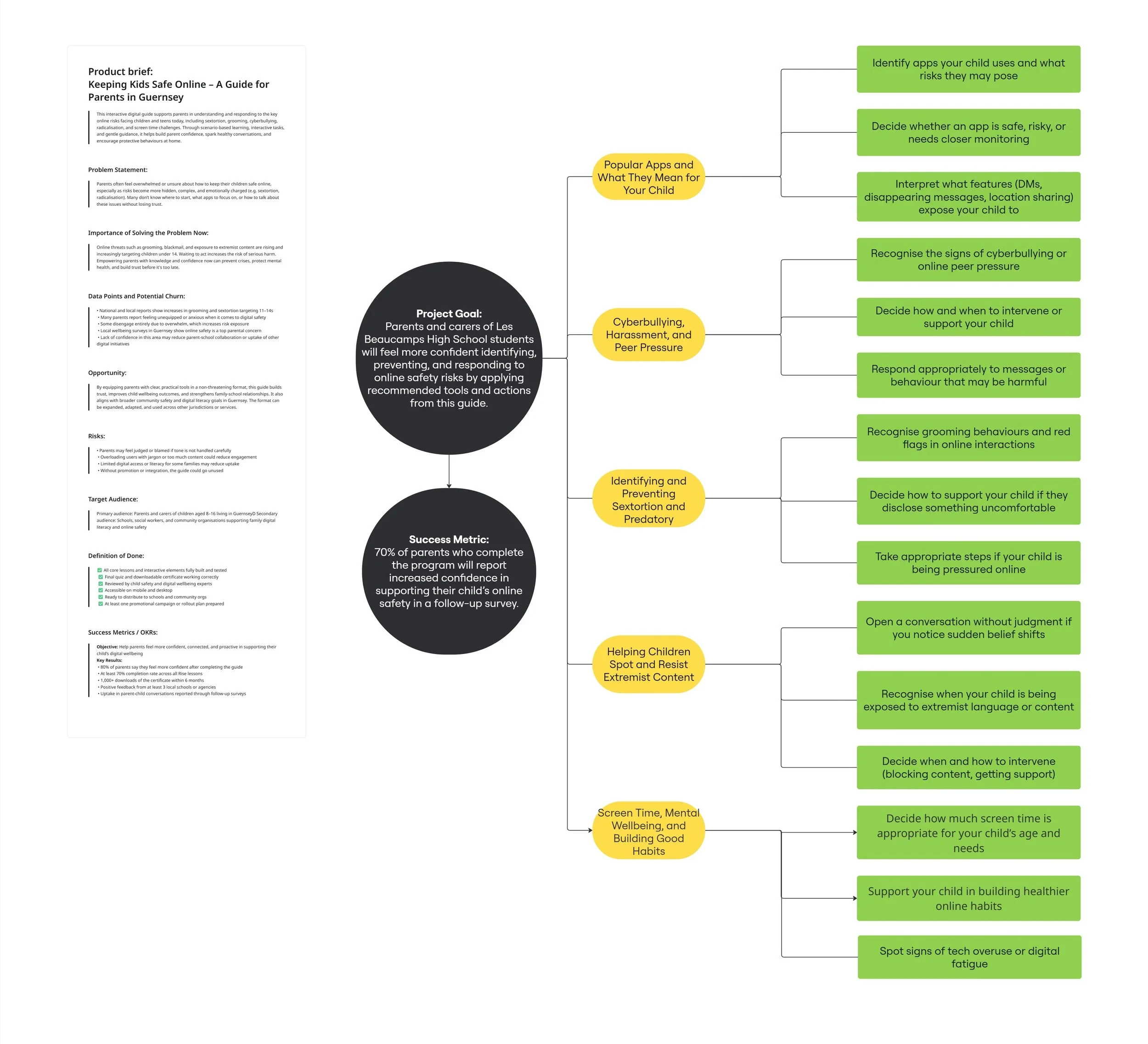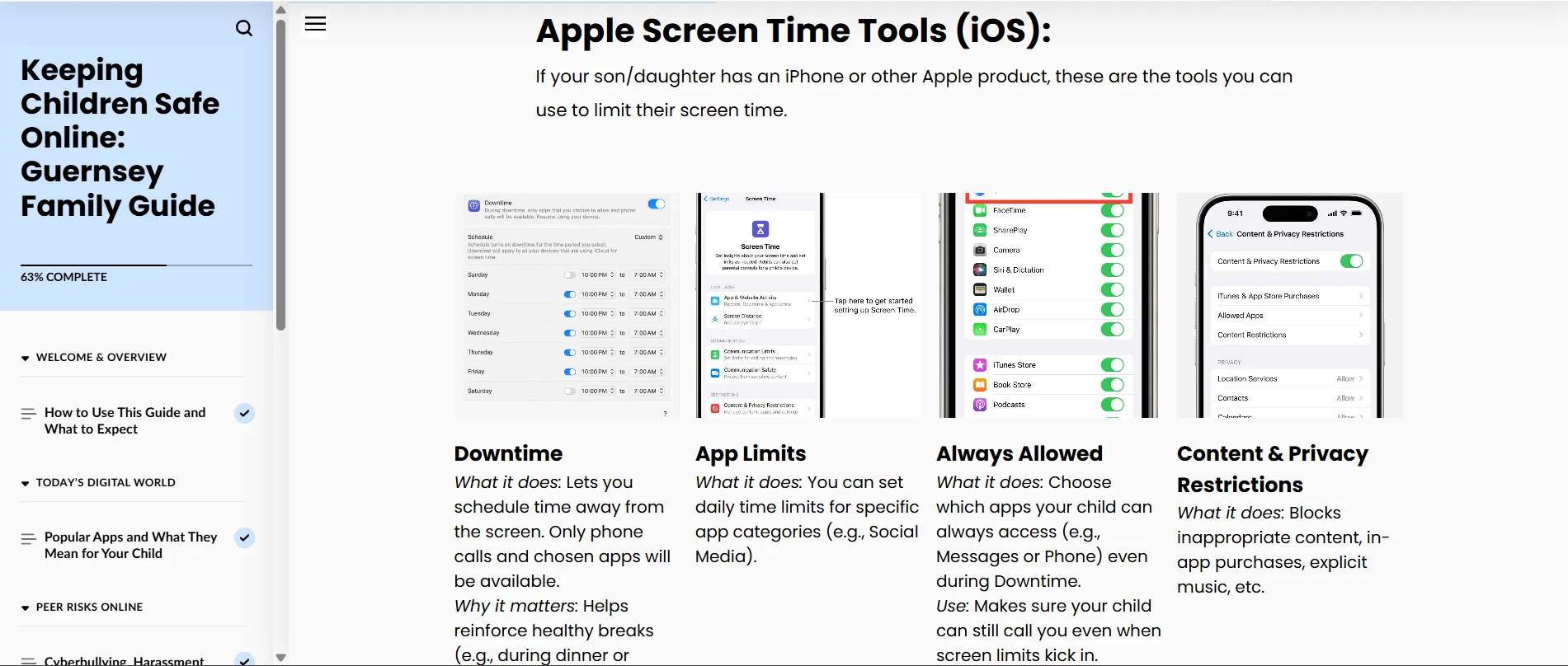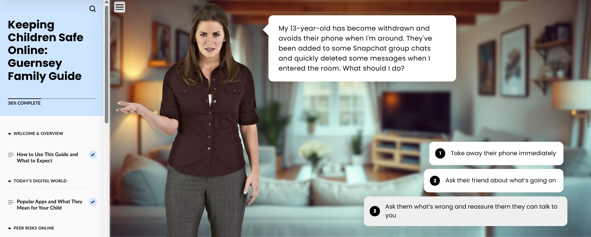 A scenario-driven, visually rich eLearning guide was developed using Articulate Rise 360. It focuses on real-world online dangers related to social apps like Snapchat, TikTok, Instagram, WhatsApp, and Discord. Each section includes interactive blocks, visual guides, and decisions points designed to engage and empower adults.