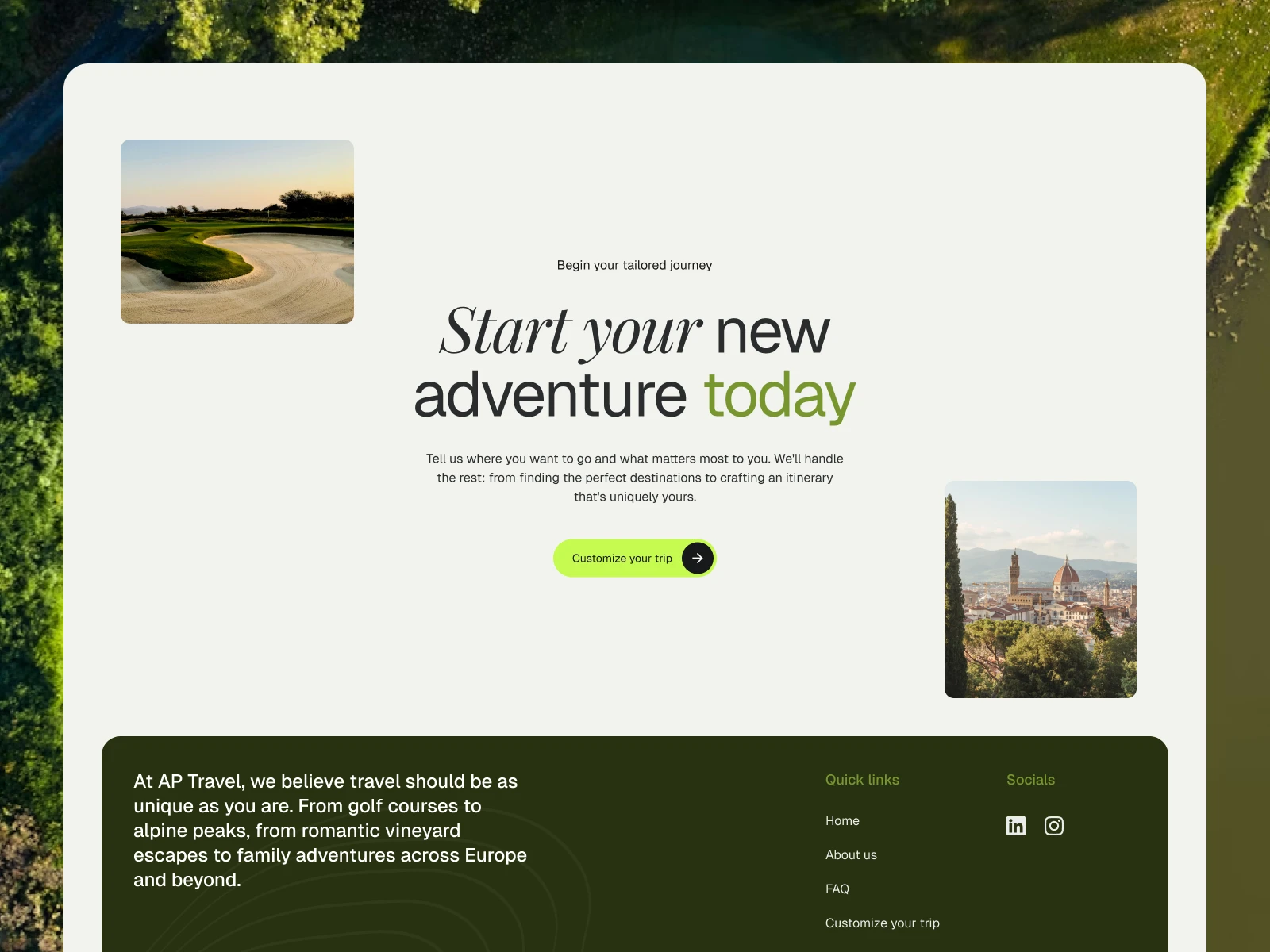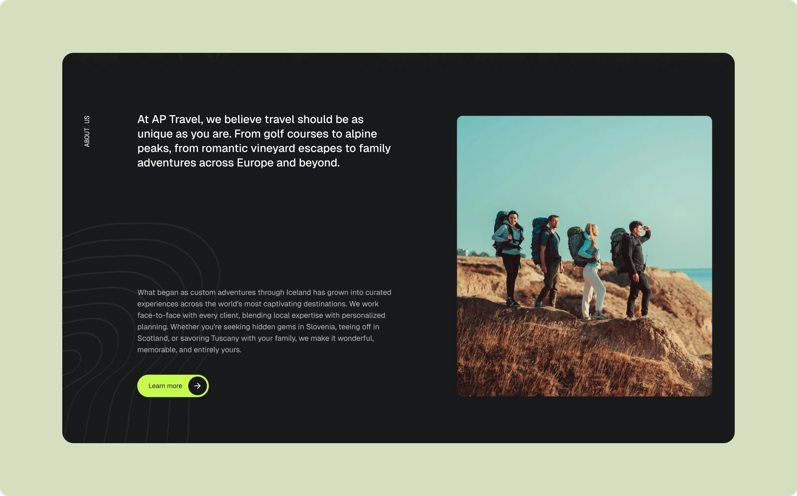 AP Travel is an Iceland-based travel agency offering curated European experiences. I designed the homepage to introduce the brand, highlight diverse travel themes, and inspire users to explore and customize their ideal trip.