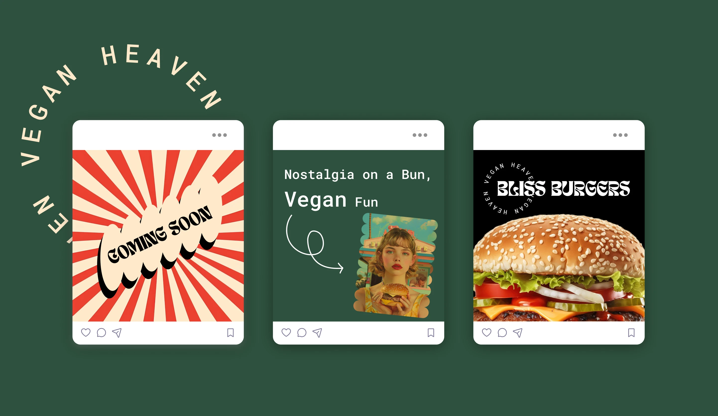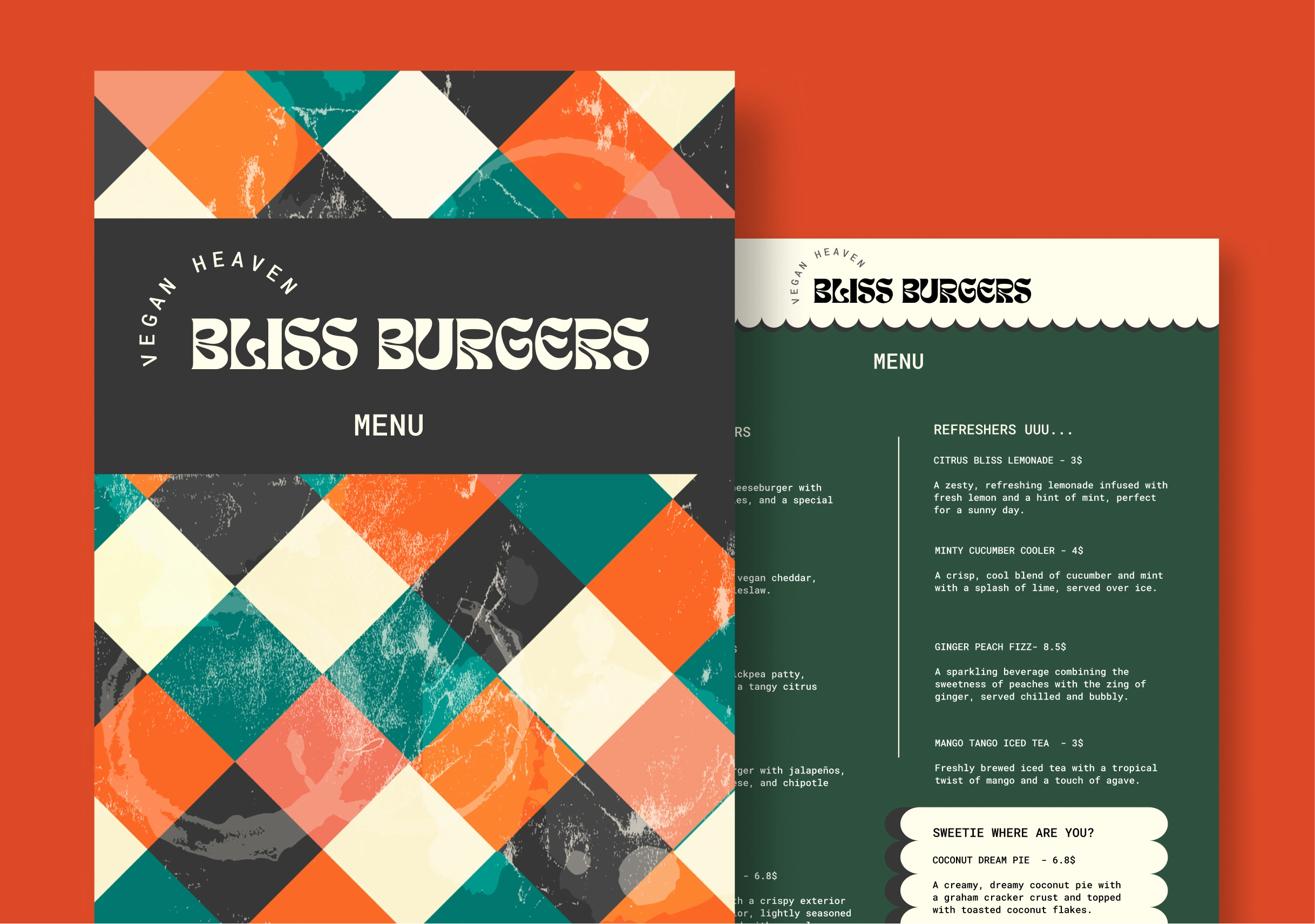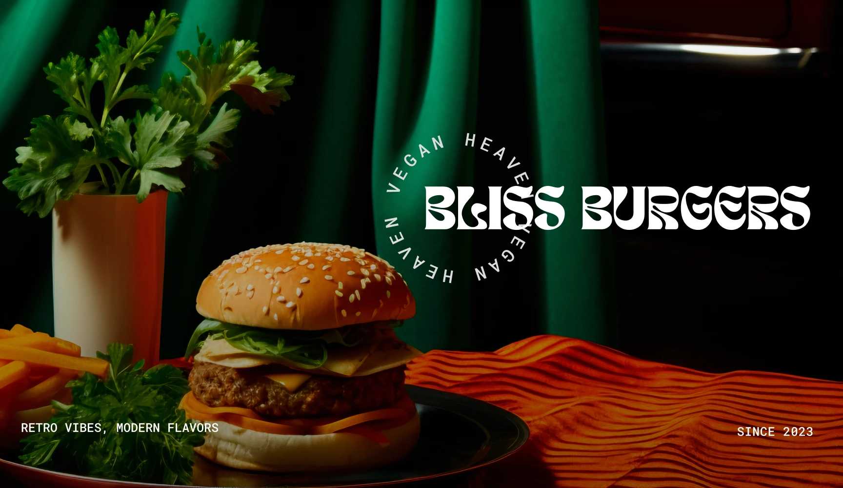Bliss Burgers needed a distinctive identity that felt nostalgic yet fresh—capturing classic diner warmth while signaling premium, modern, plant‑based food. The brand had to translate seamlessly from signage and interiors to packaging, menus, and social.