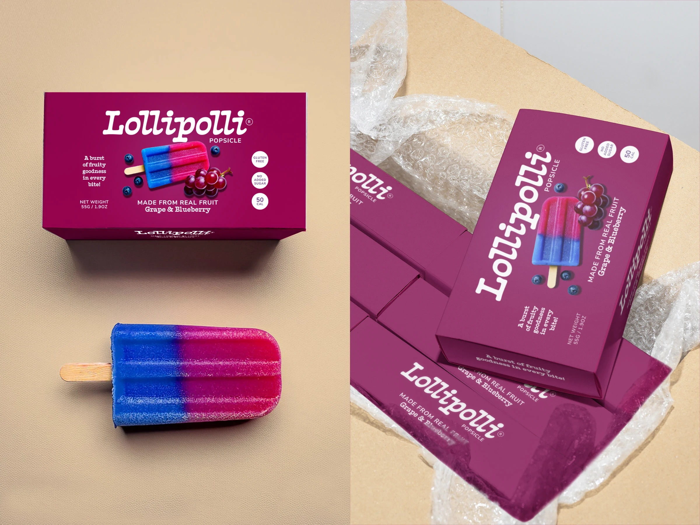 Lollipolli is a vibrant popsicle brand designed for teens and young adults who crave fun, flavor, and spontaneity. With bold, colorful packaging and playful typography, it captures the energy of youthful indulgence while remaining modern and stylish. The brand’s visual identity blends sun-soaked lifestyle imagery with dynamic branding, making Lollipolli more than just a frozen treat—it’s a statement of joy and individuality. Whether enjoyed on the go or shared with friends, Lollipolli brings a burst of fruity freshness to every moment, embodying the carefree spirit of summer all year round.
