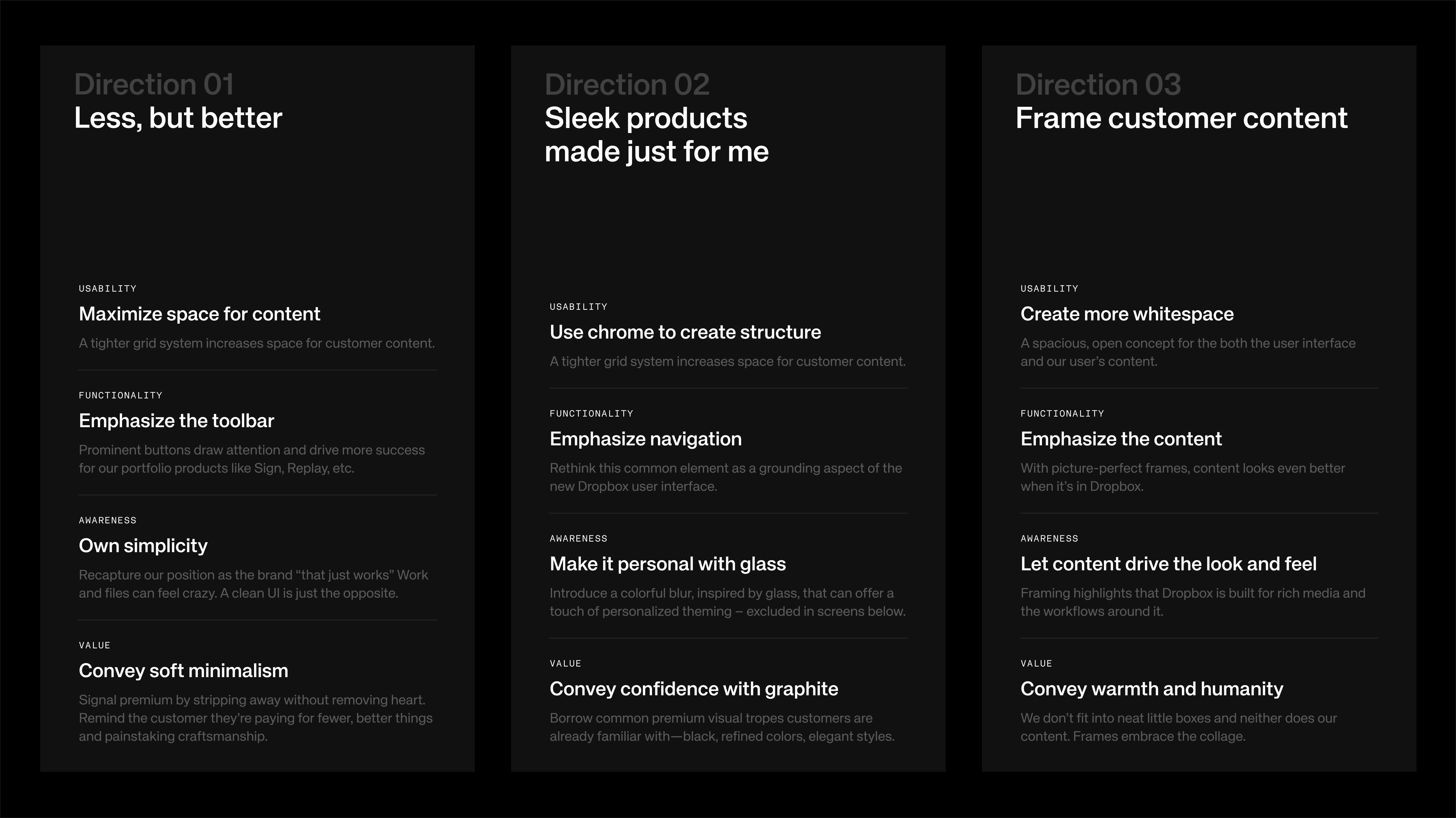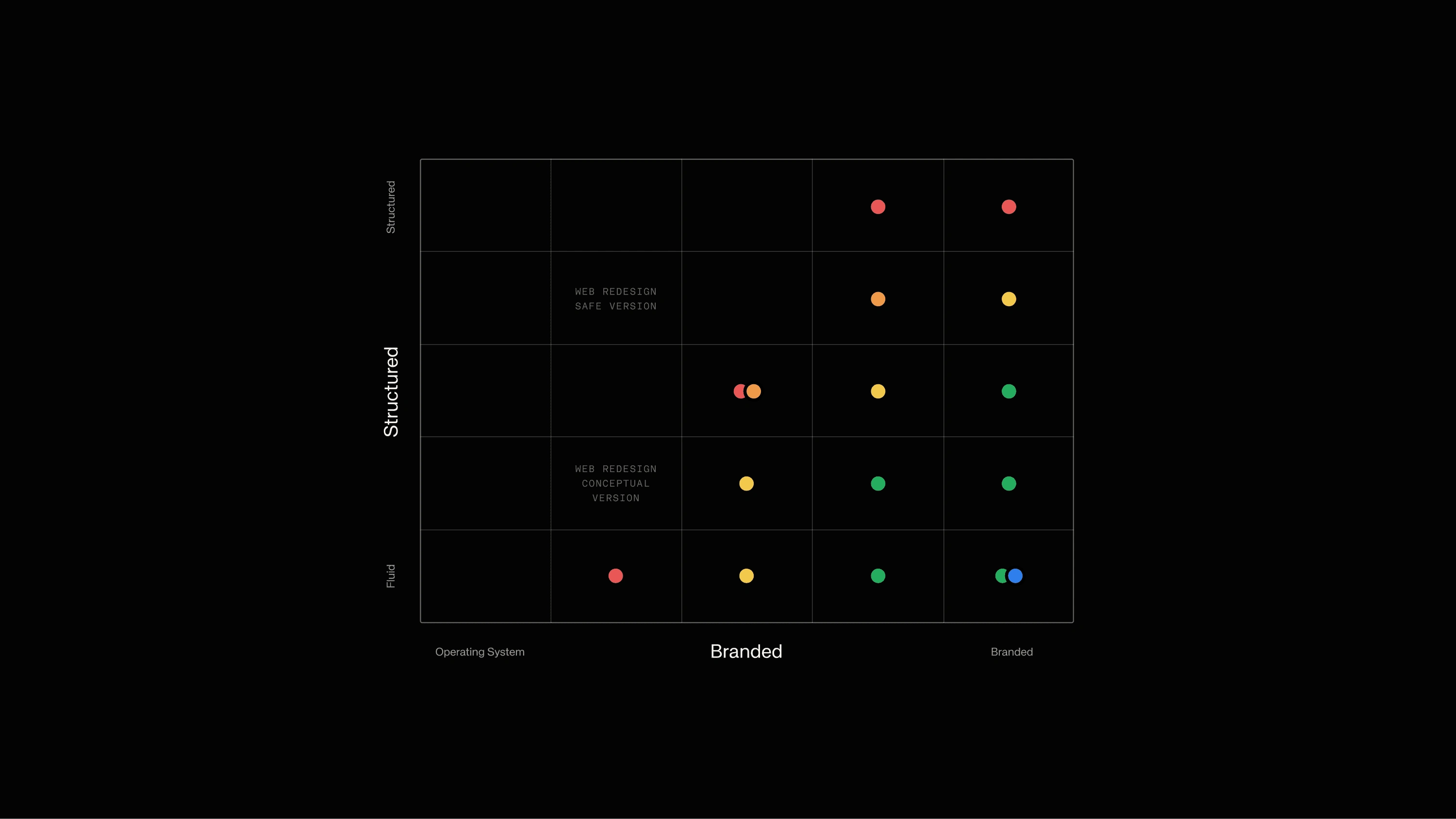 This project kicked off by assembling a team of 10 contributing designers with backgrounds in Brand Design, Product Design, Design Systems, and Portfolio Design. Over a two-week sprint, we focused on refining four core screens: Home, Browse, Preview, and Share, while making light UX modifications. Each dot in the visualization below represents a designer and the approach they took within their visual explorations.