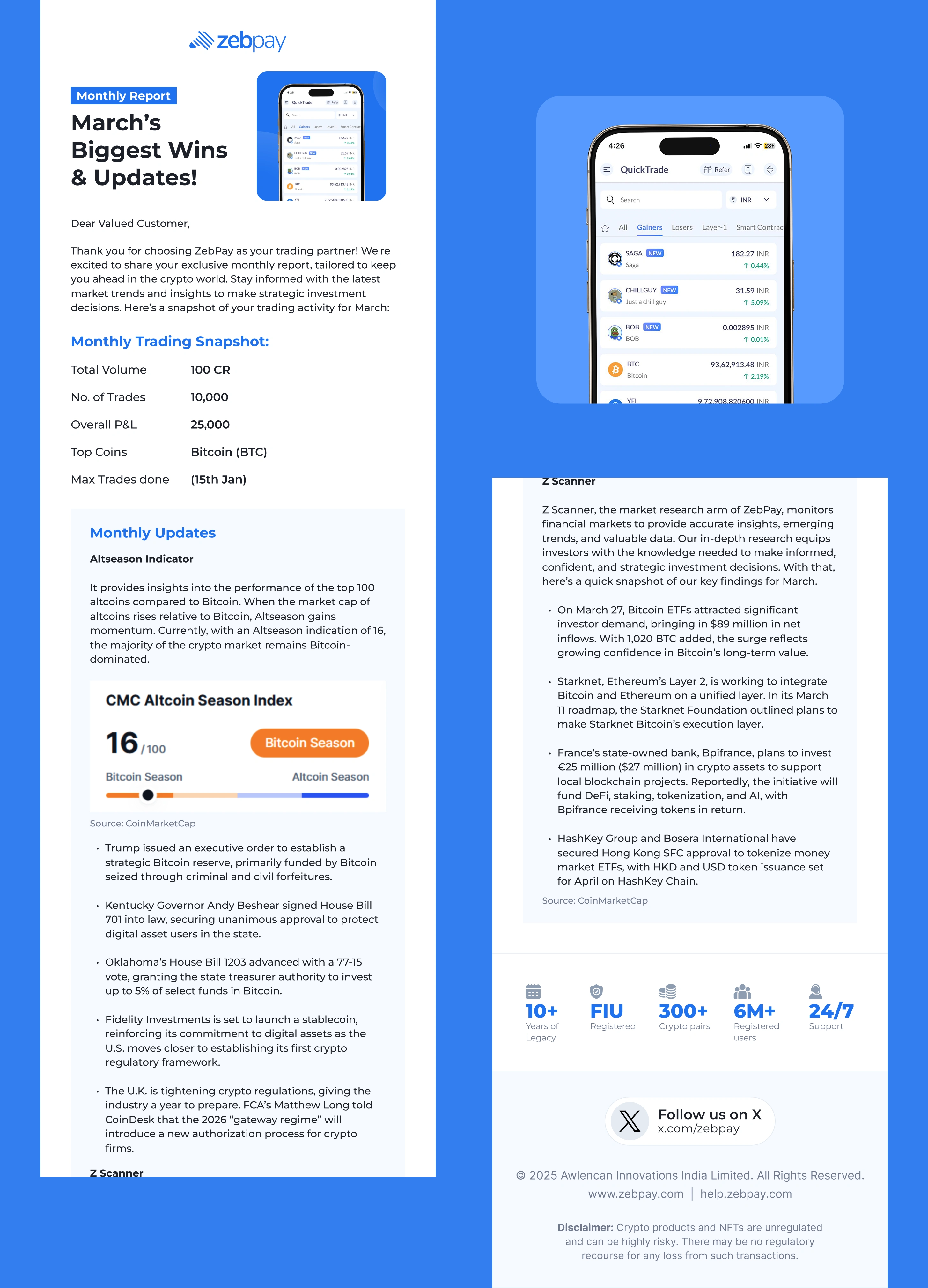 This project involved designing a monthly report email for ZebPay users, aimed at providing a concise overview of their trading activity along with key market insights.