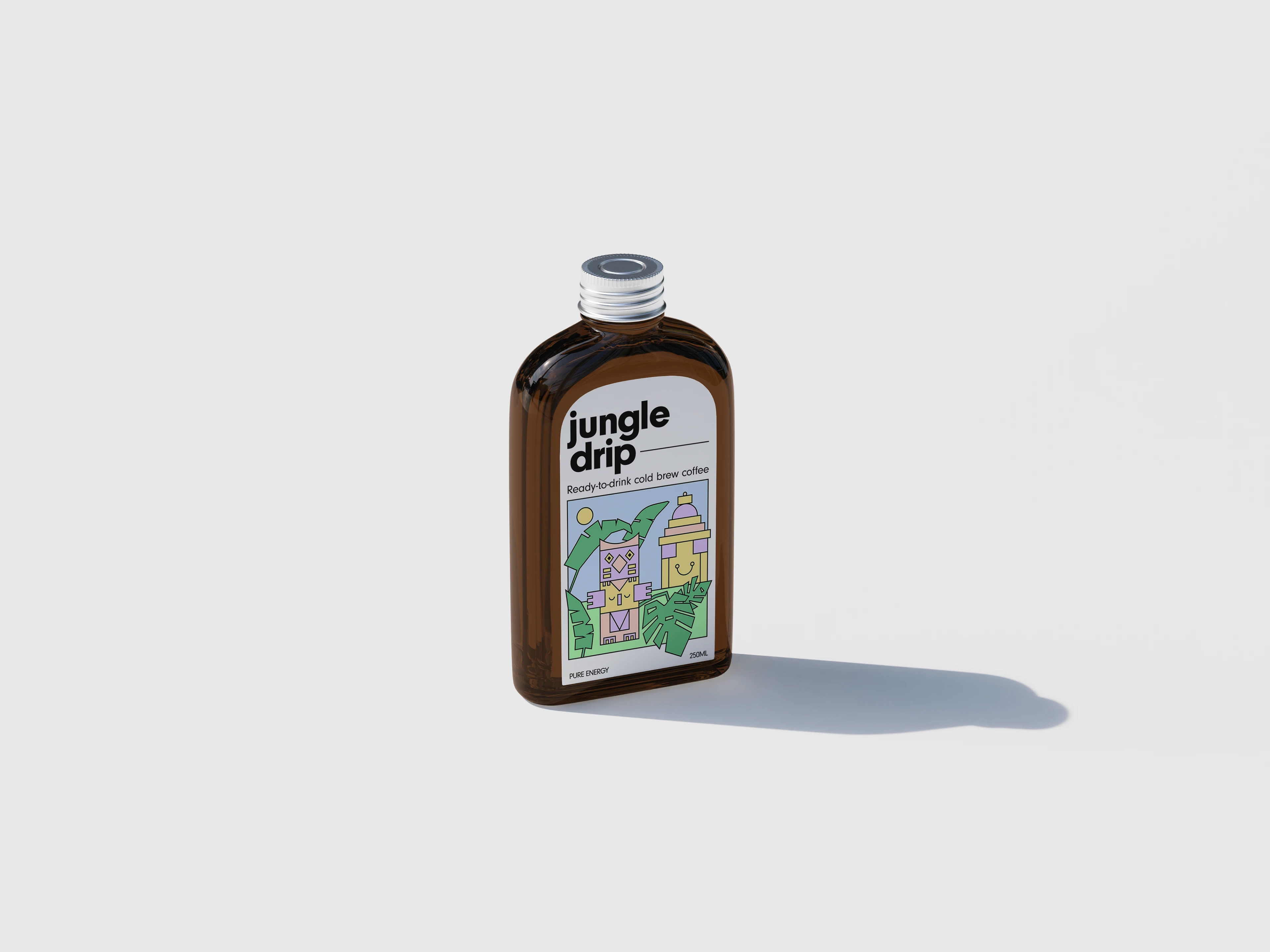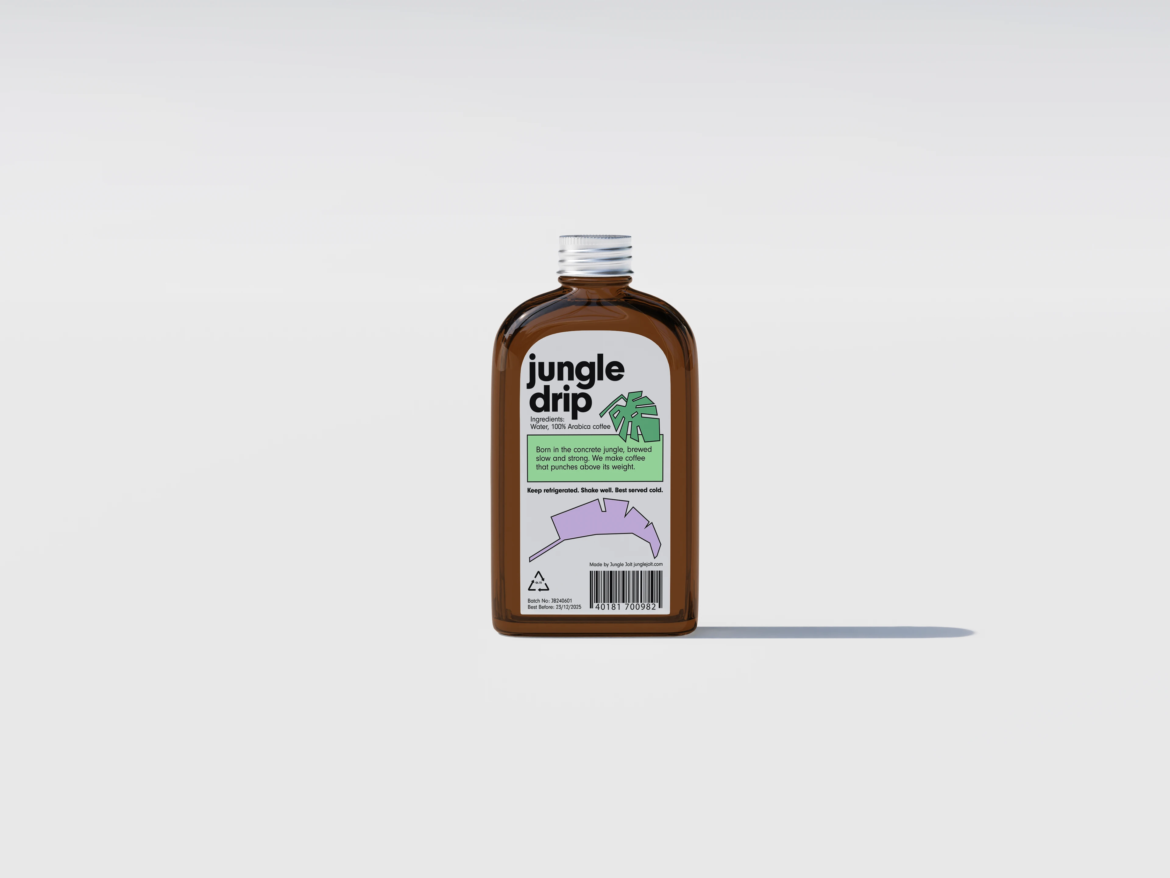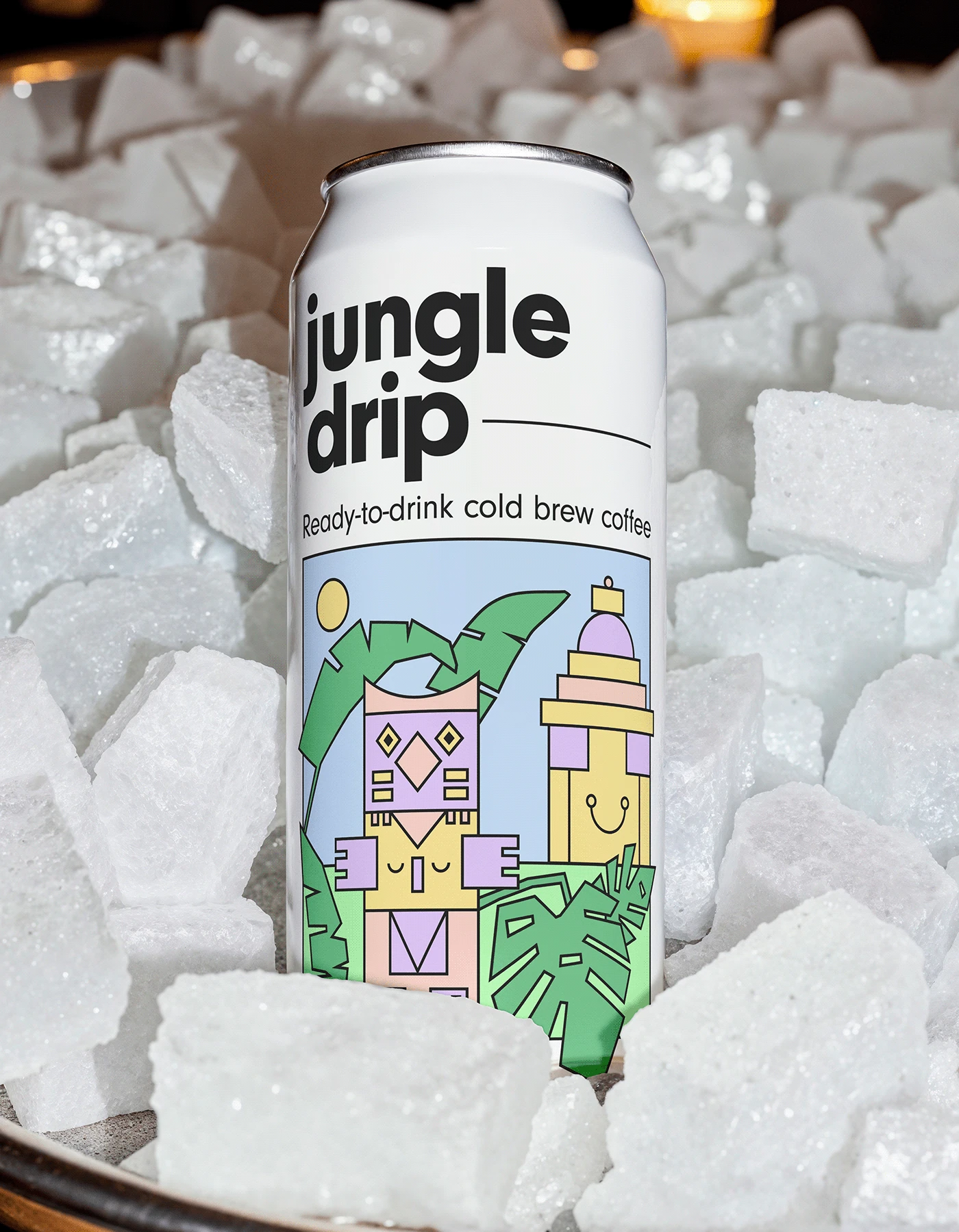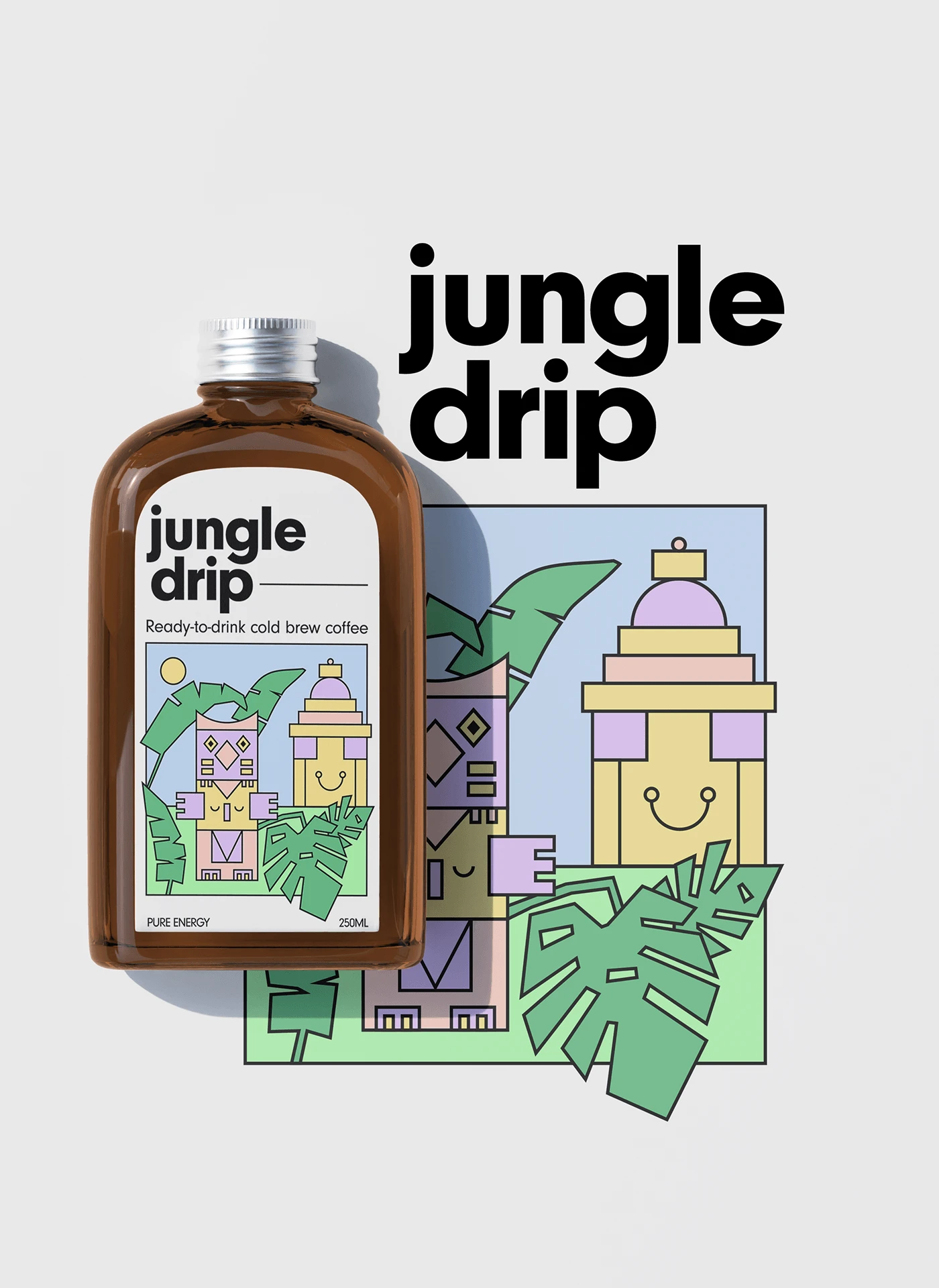 For the typography, a strong, clean font was used for "Jungle Drip" that’s highly legible and has a friendly yet confident presence. The supporting text like "Ready-to-drink cold brew coffee" is kept concise and clear, ensuring that the product's essence is immediately understood.
