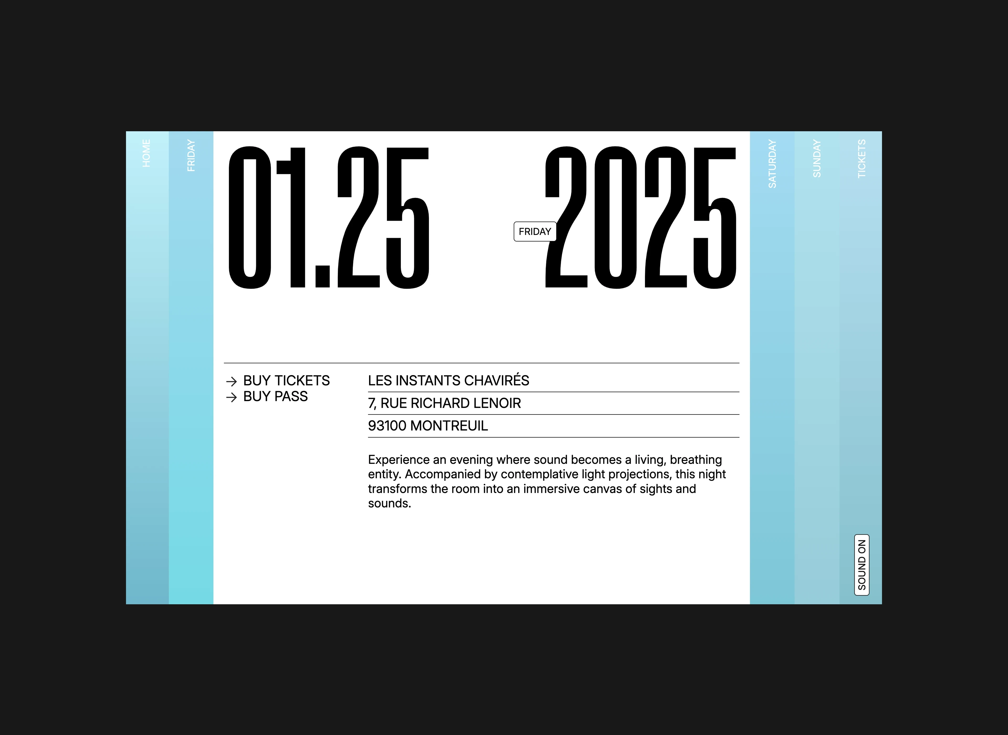 Every detail—from scrolling to sound-reactive animations—is crafted as an extension of the live experience: a visual and sonic journey that’s both raw and immersive, inviting users to explore the festival through the screen.