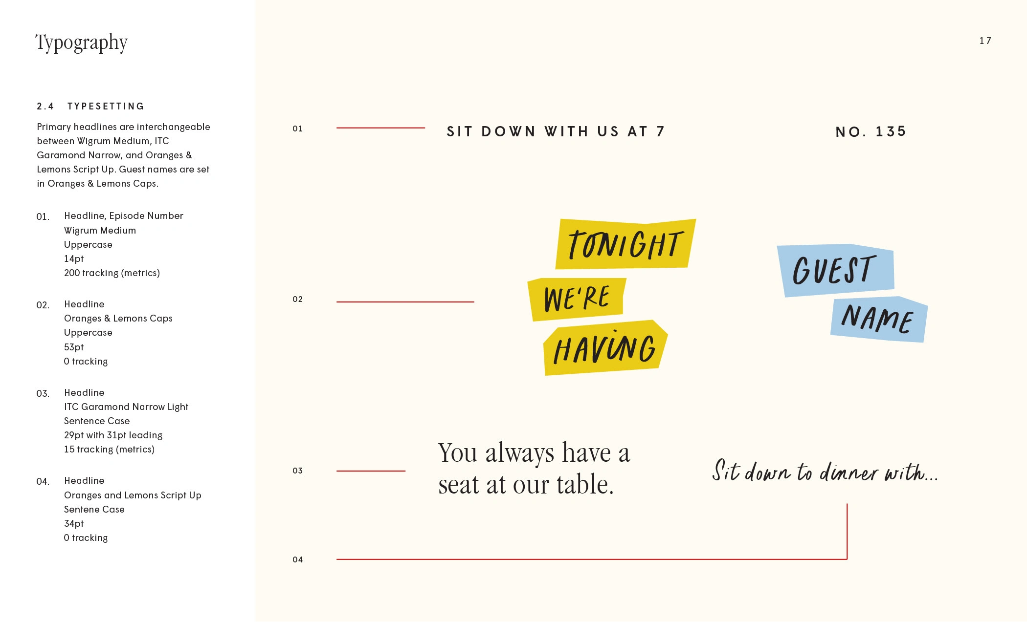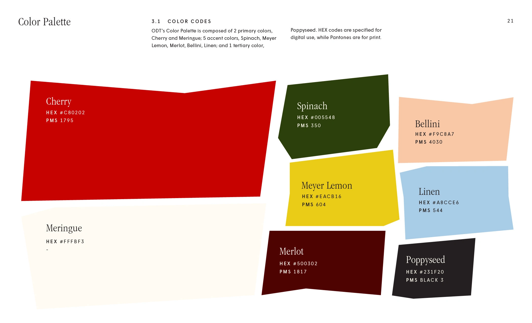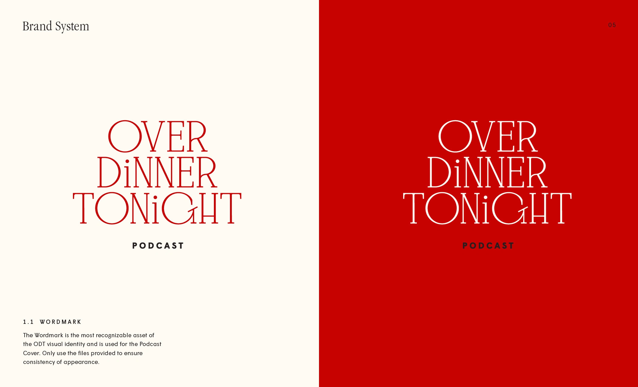 The solution draws inspiration from the bold, energetic aesthetic of 1990s New York editorial design—think New York Magazine meets downtown dining culture. The custom monogram interlocks "ODT" within overlapping circles, echoing both dinner plates and the intimacy of table conversation. The typography system pairs the elegant ITC Garamond Narrow Light with the approachable Wigrum and playful Oranges and Lemons script, creating hierarchy that feels both refined and inviting.