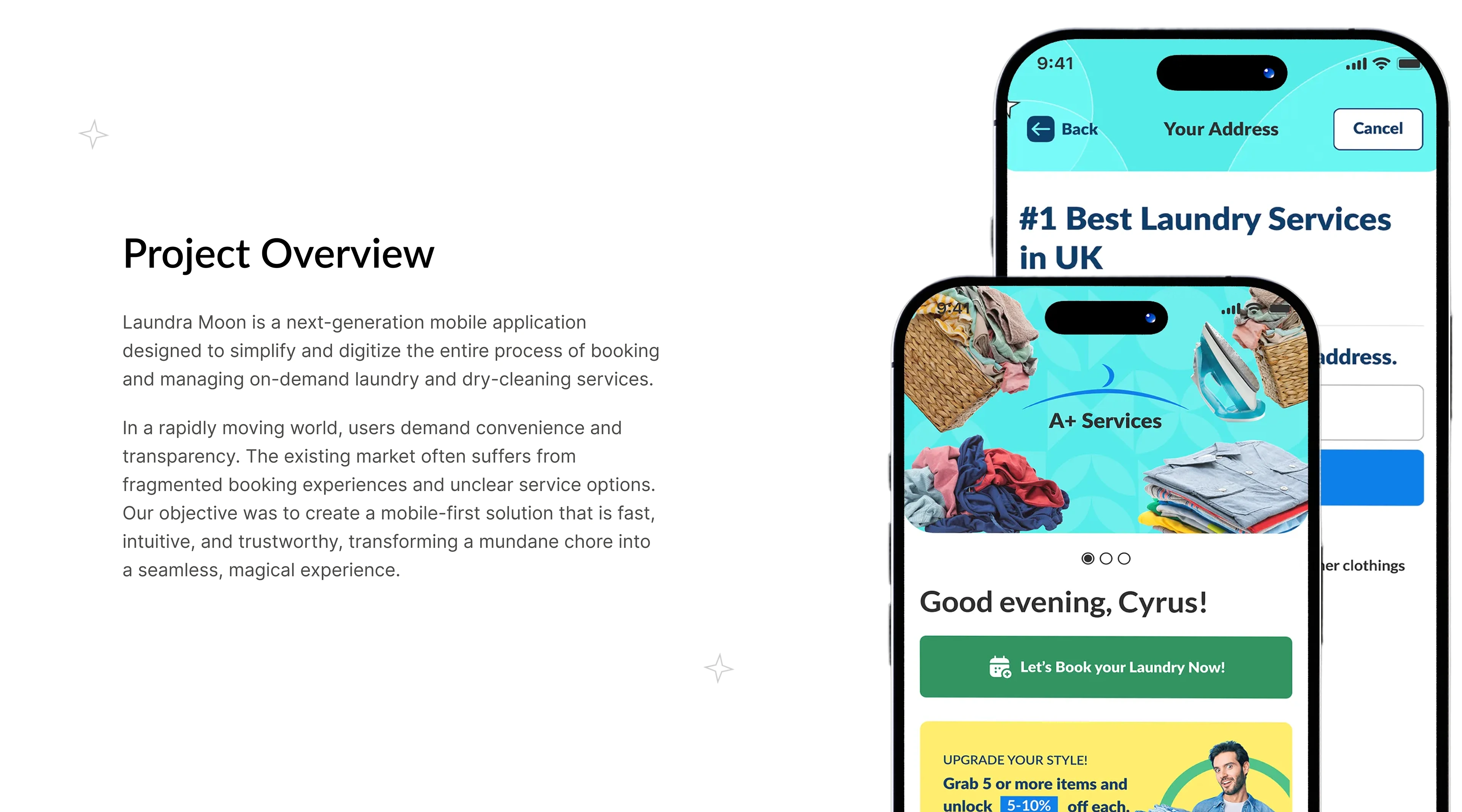 Laundra Moon is a next gen mobile app designed to simplify and digitize the entire process of booking and managing laundry and dry cleaning services.