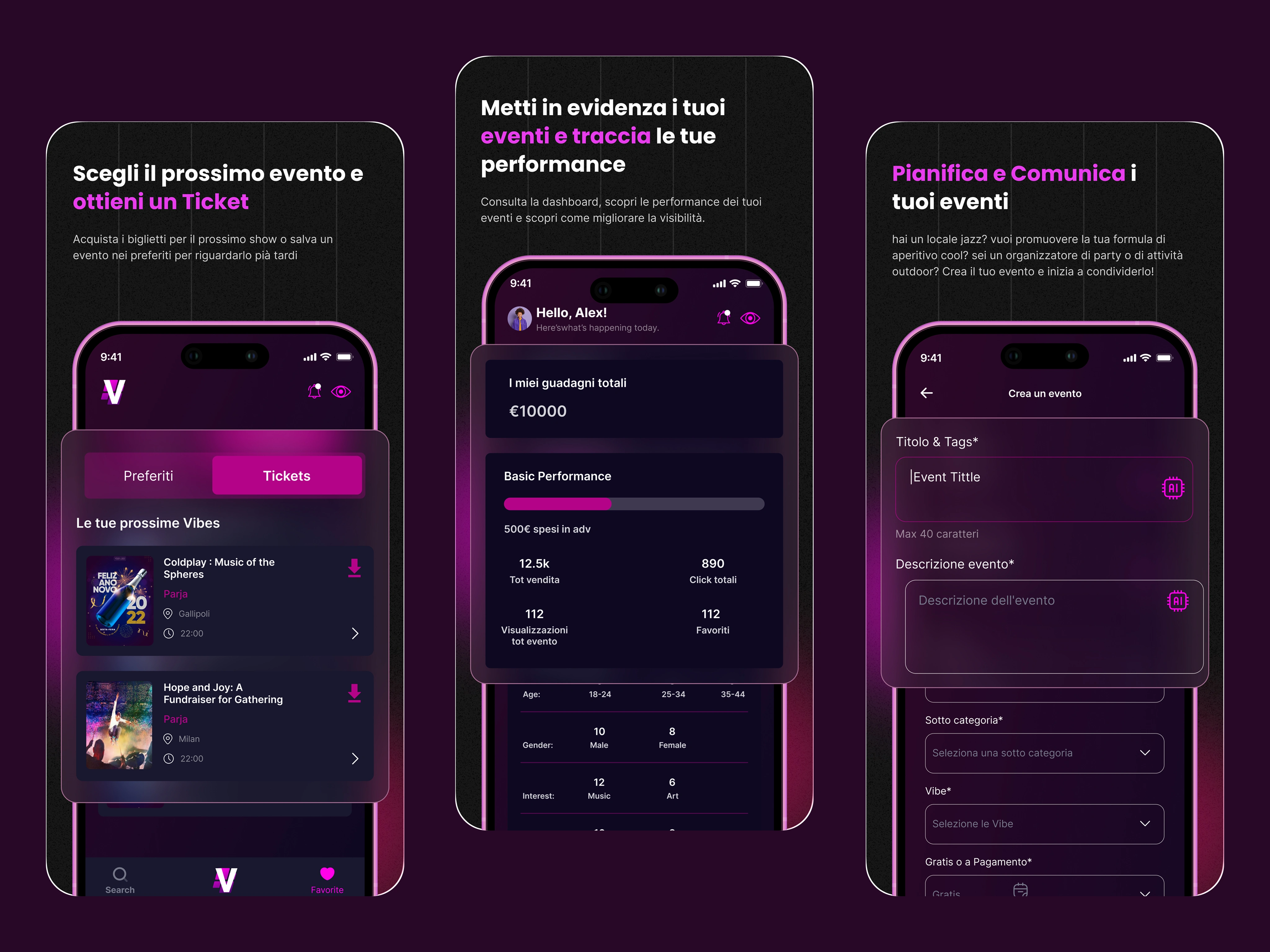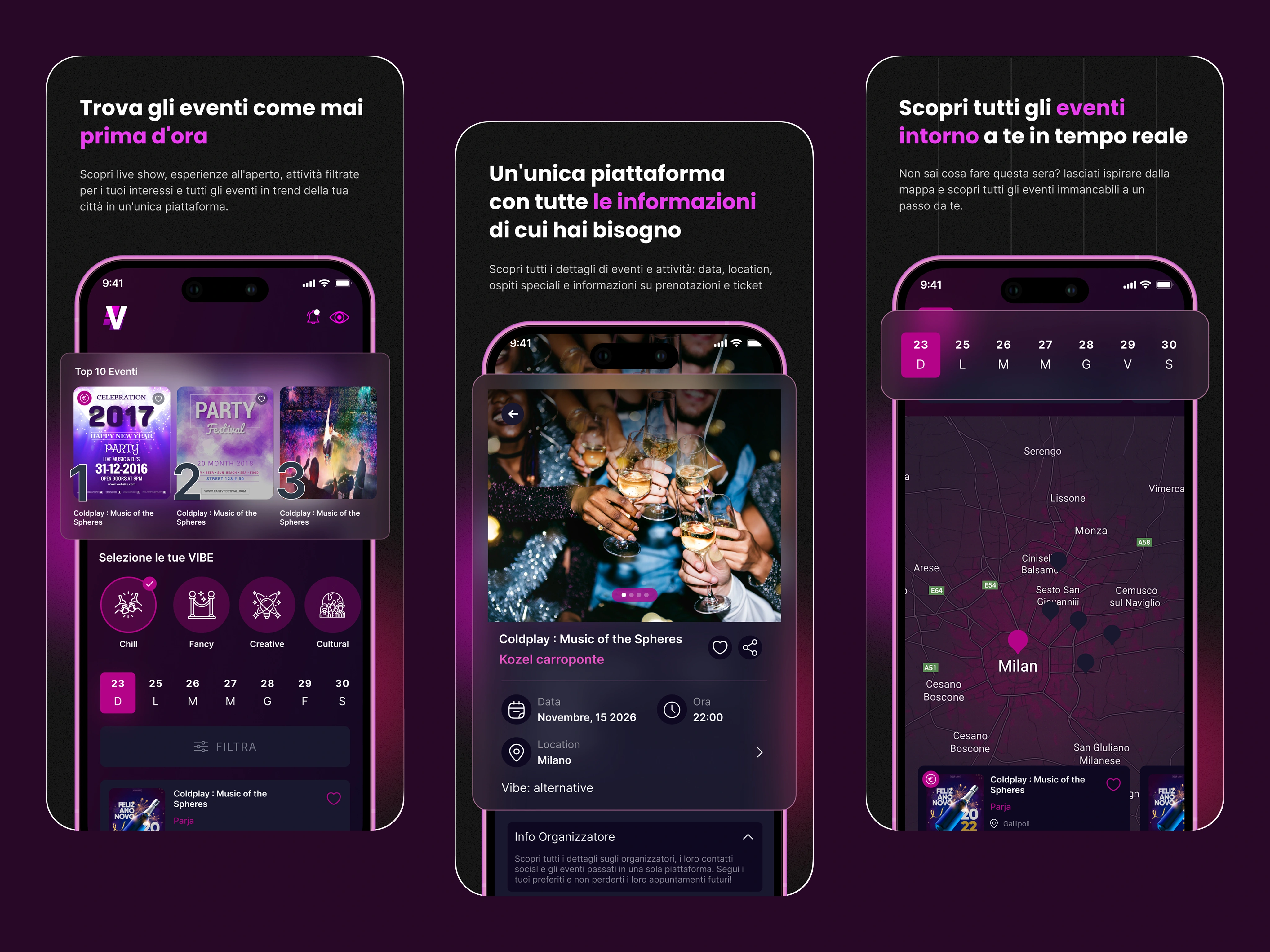 Currently in development and launching soon on iOS, Android, and Web, Vibe is designed for the Italian market with scalability in mind, combining intuitive design, cultural curation, and data-driven discovery to create meaningful urban experiences.