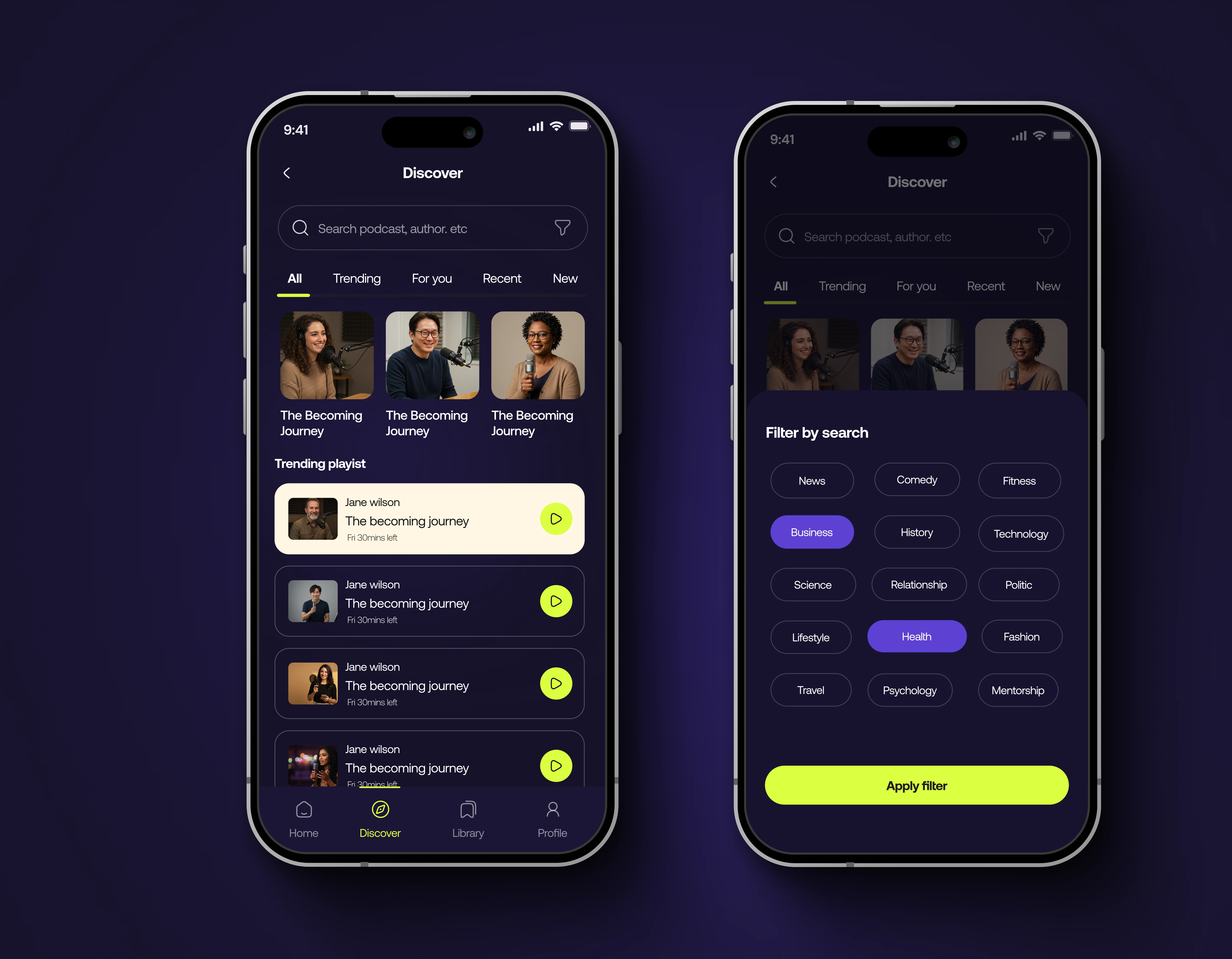 Smart filtering and a clean layout guide users without overwhelming them, turning exploration into a smooth experience and encouraging users to keep discovering new voices and episodes