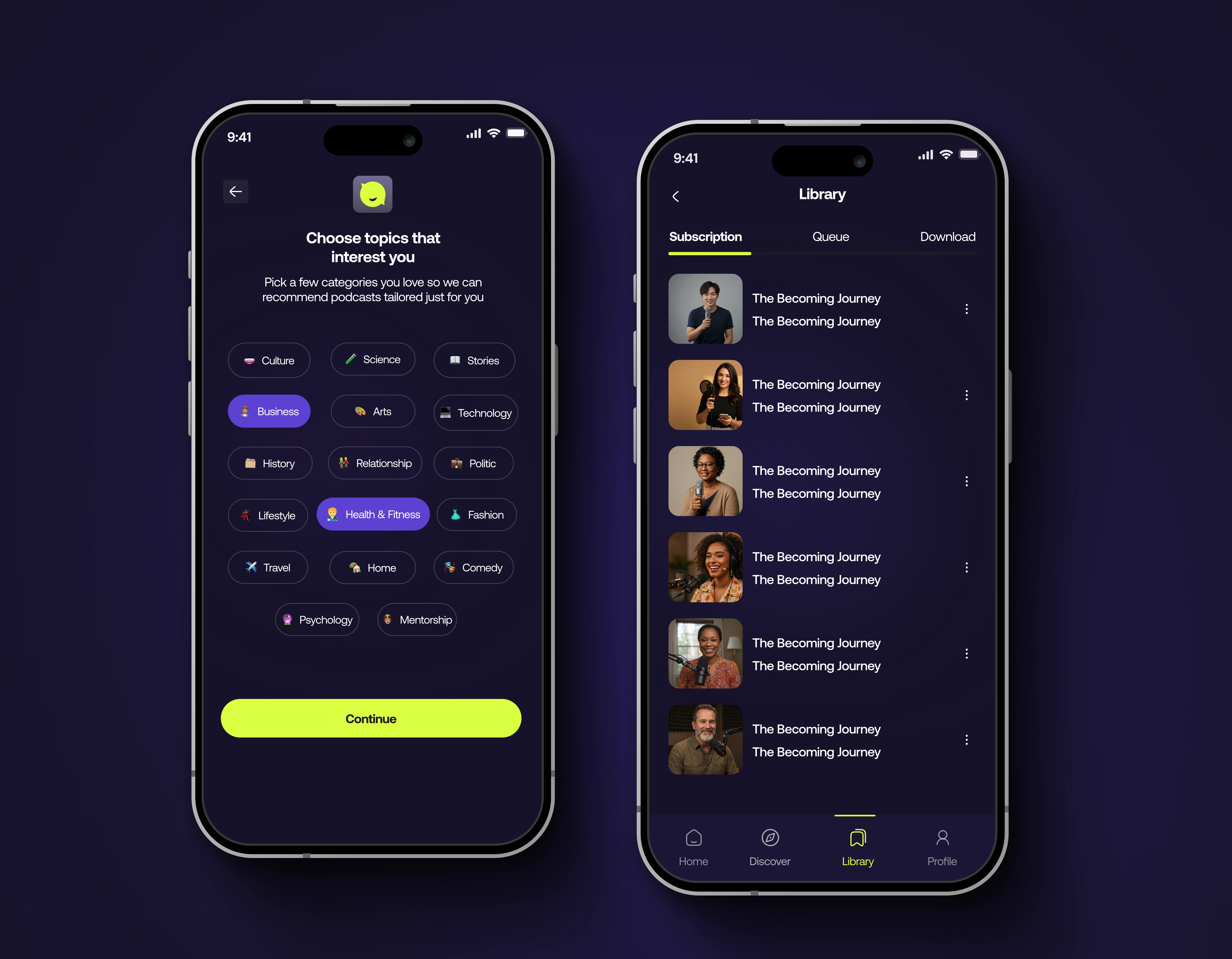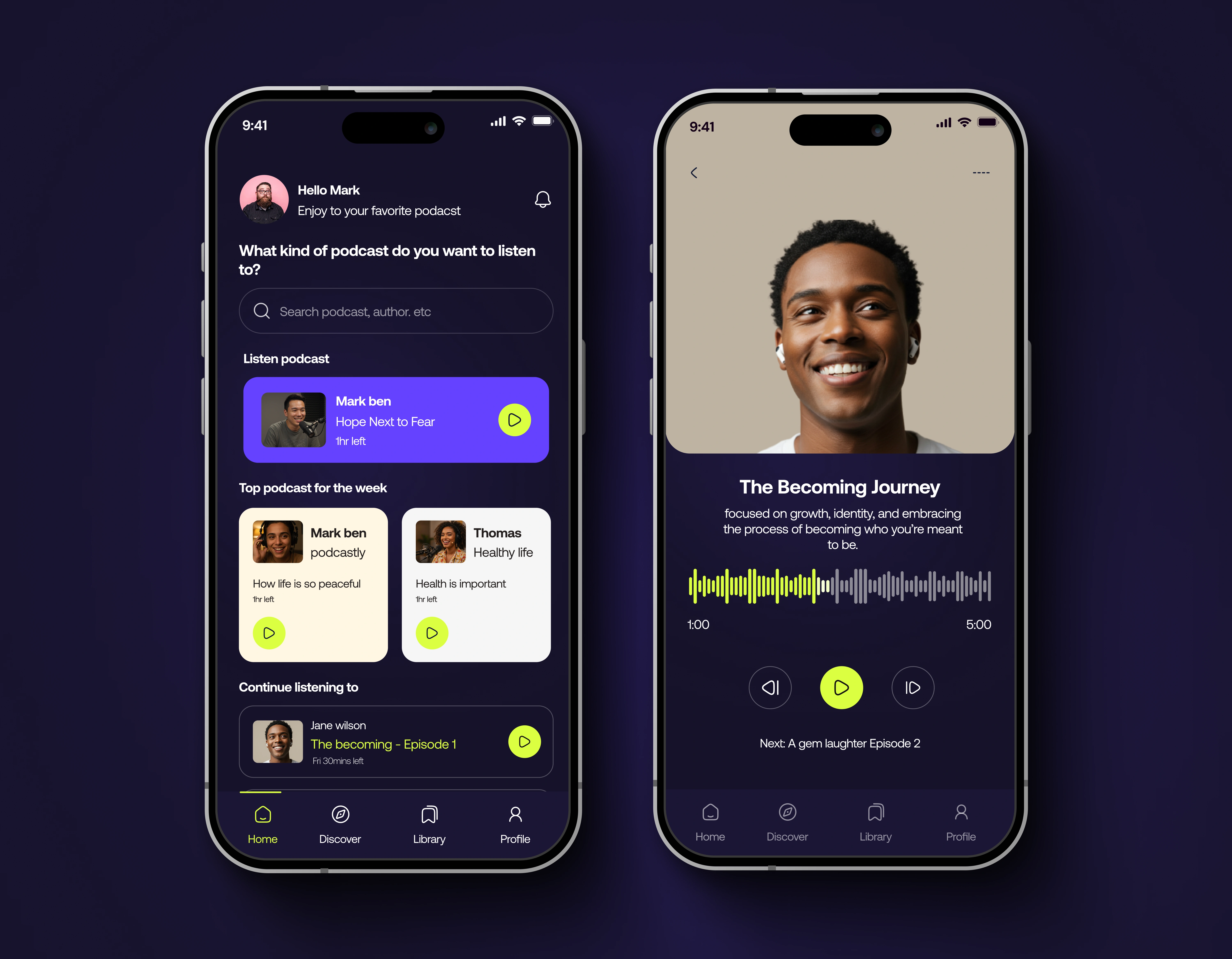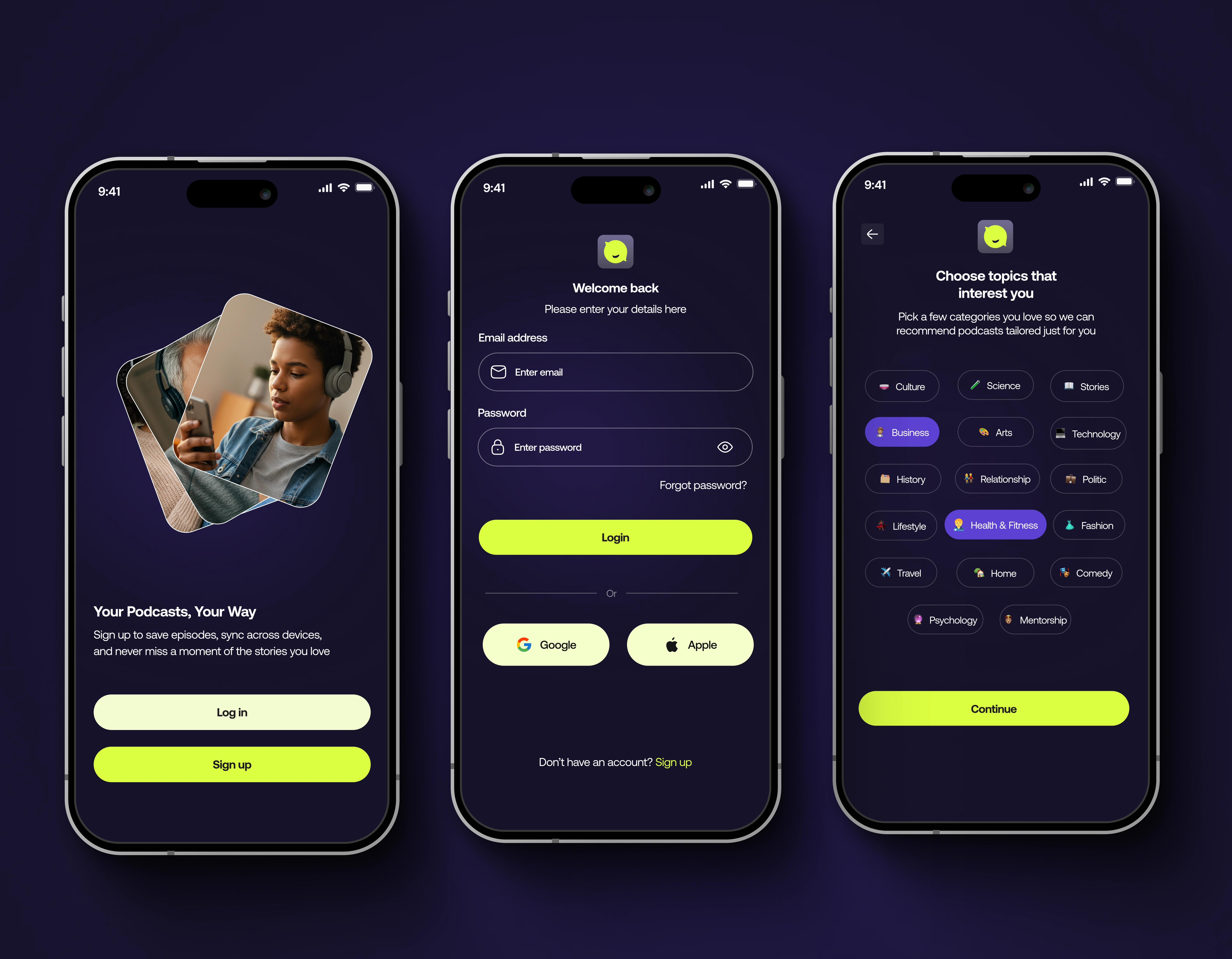 This podcast app was designed to create a seamless and personalized listening experience for people who love discovering and following their favorite voices. The idea was to bring everything users need exploring new podcasts, listening, and managing their favorites into one clean, engaging, and easy-to-use space.