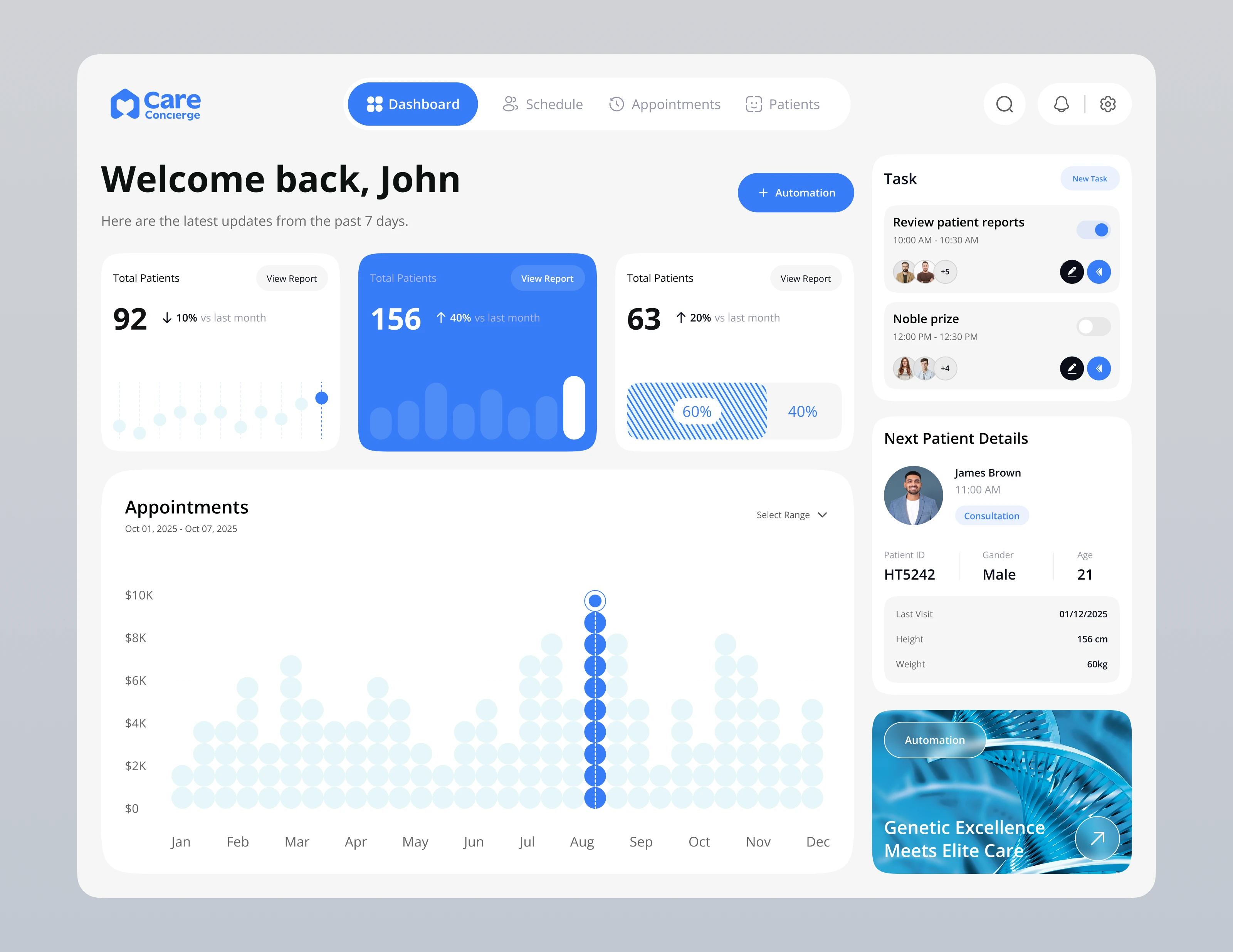 This dashboard provides a complete overview of patients, appointments, tasks, and analytics in one unified interface. The layout focuses on quick decision-making with clear KPIs, visual reports, and an intuitive workflow for healthcare professionals.
