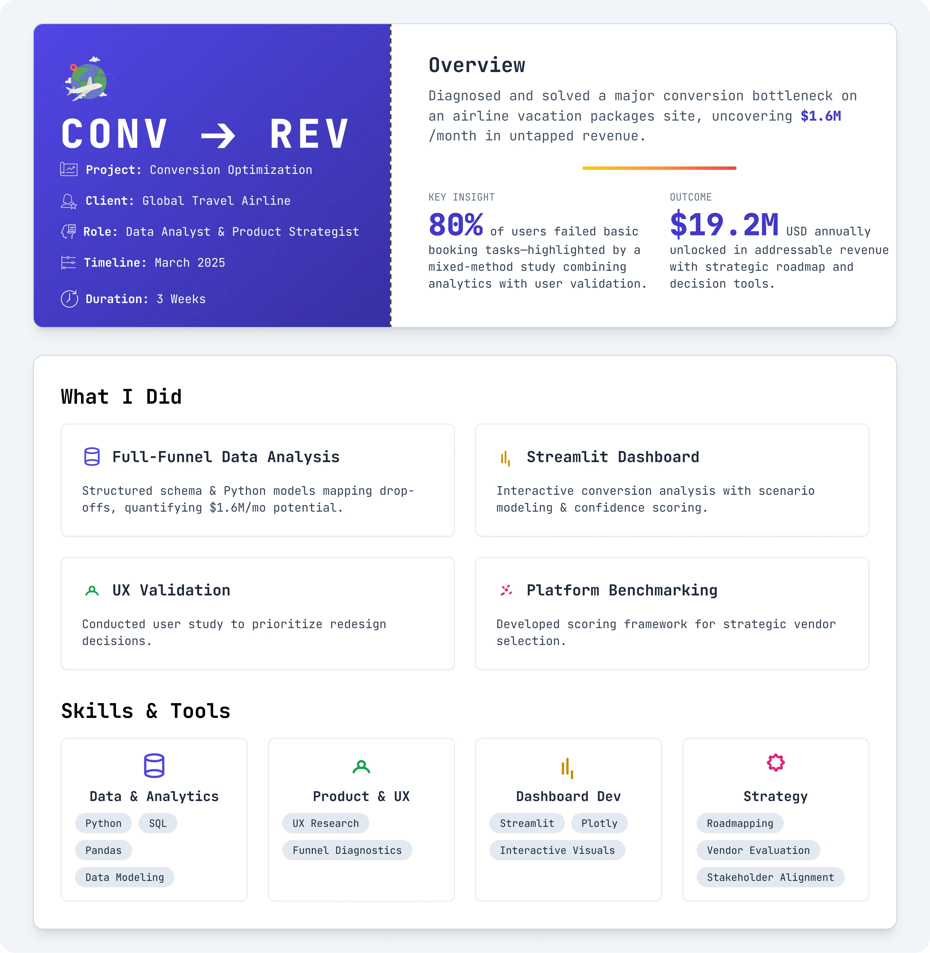 Led data + UX project for JAL: built Streamlit dashboard, Python models, and vendor scoring to uncover $1.6M/mo in conversion opportunities.