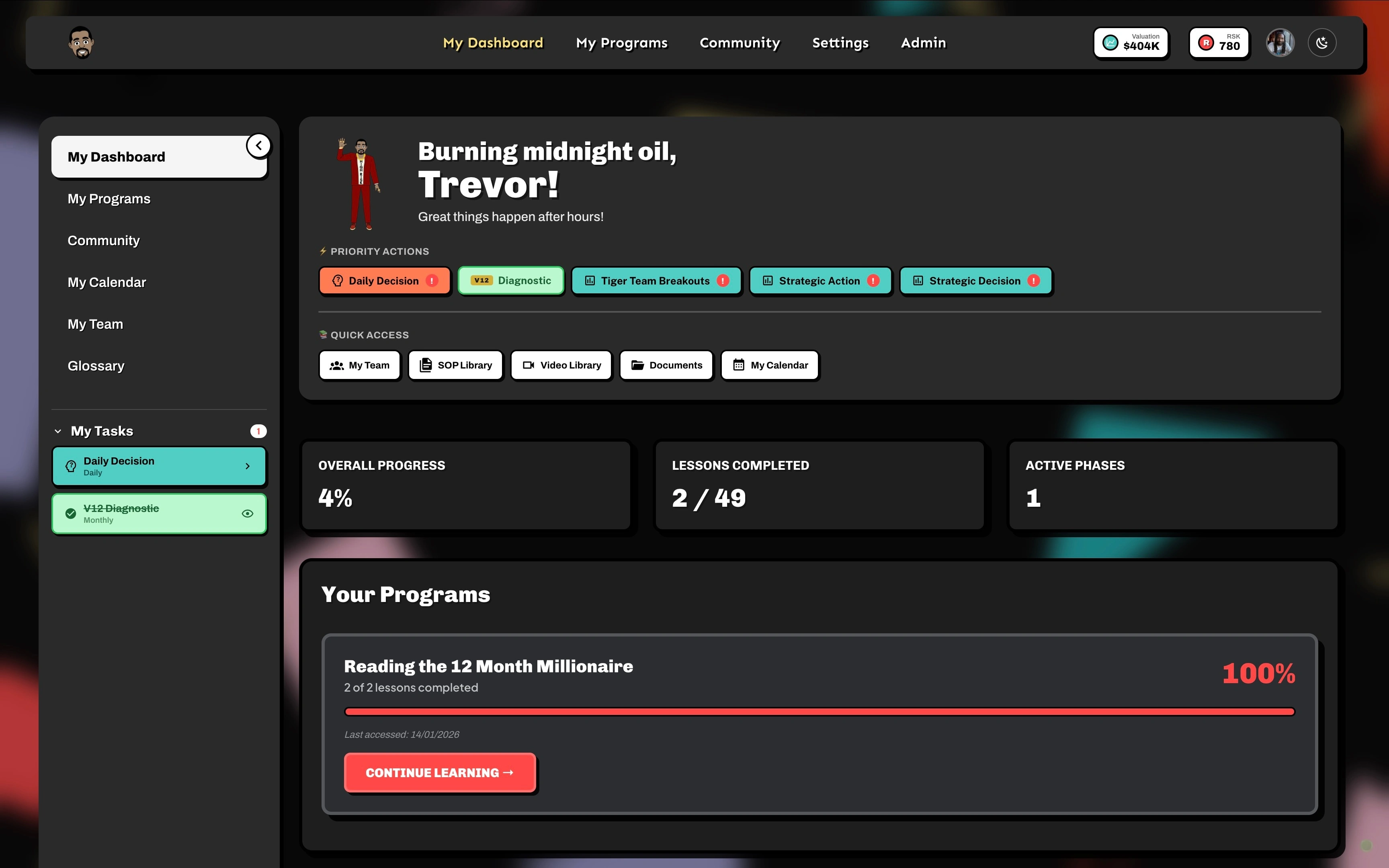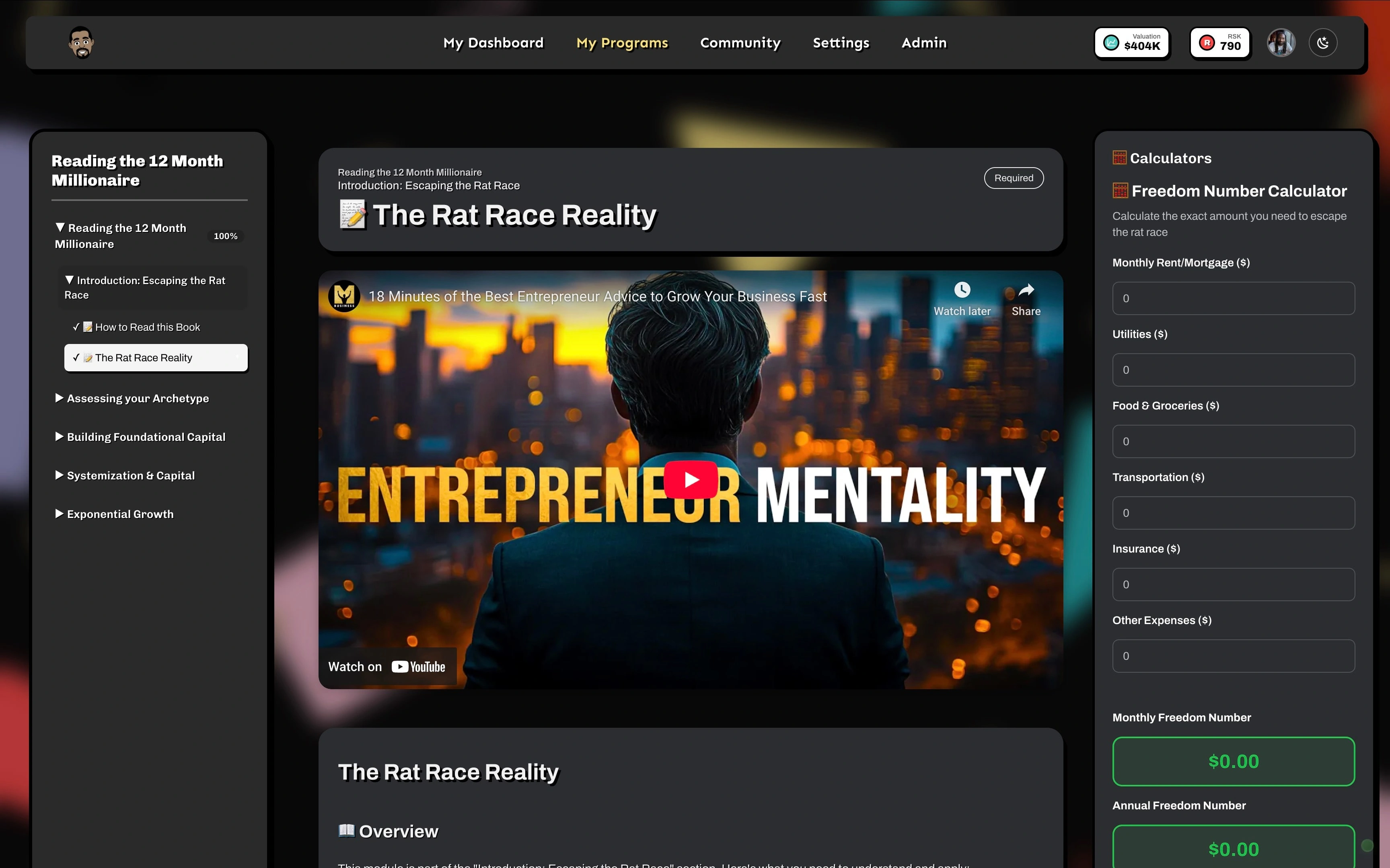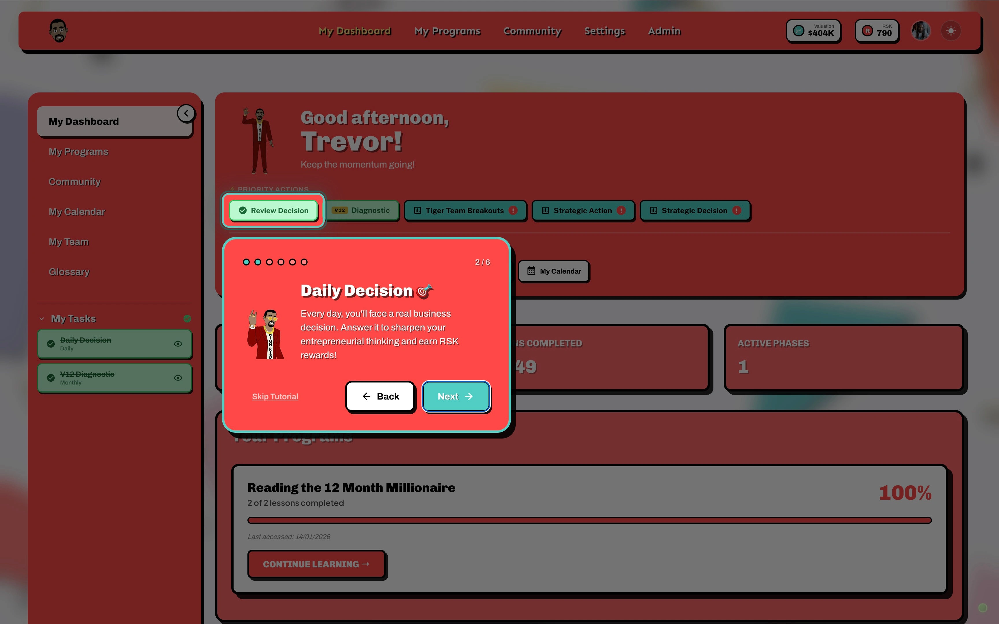 High Risk World: Twelve Month Millionaire transforms entrepreneurship education from passive consumption to active, personalized learning. By combining structured curriculum with interactive tools, AI-powered feedback, and gamification, the platform creates an engaging experience that drives completion and retention.