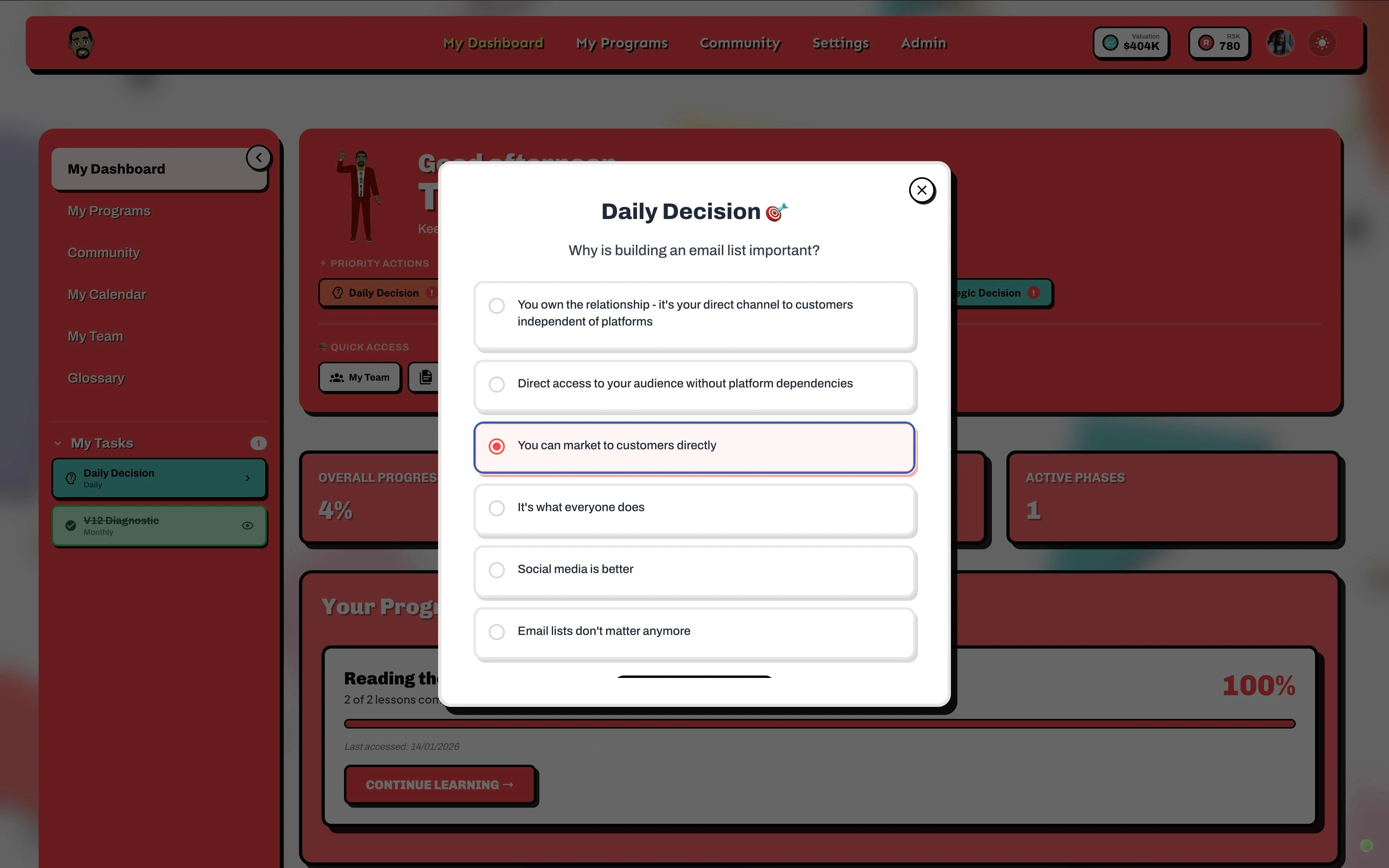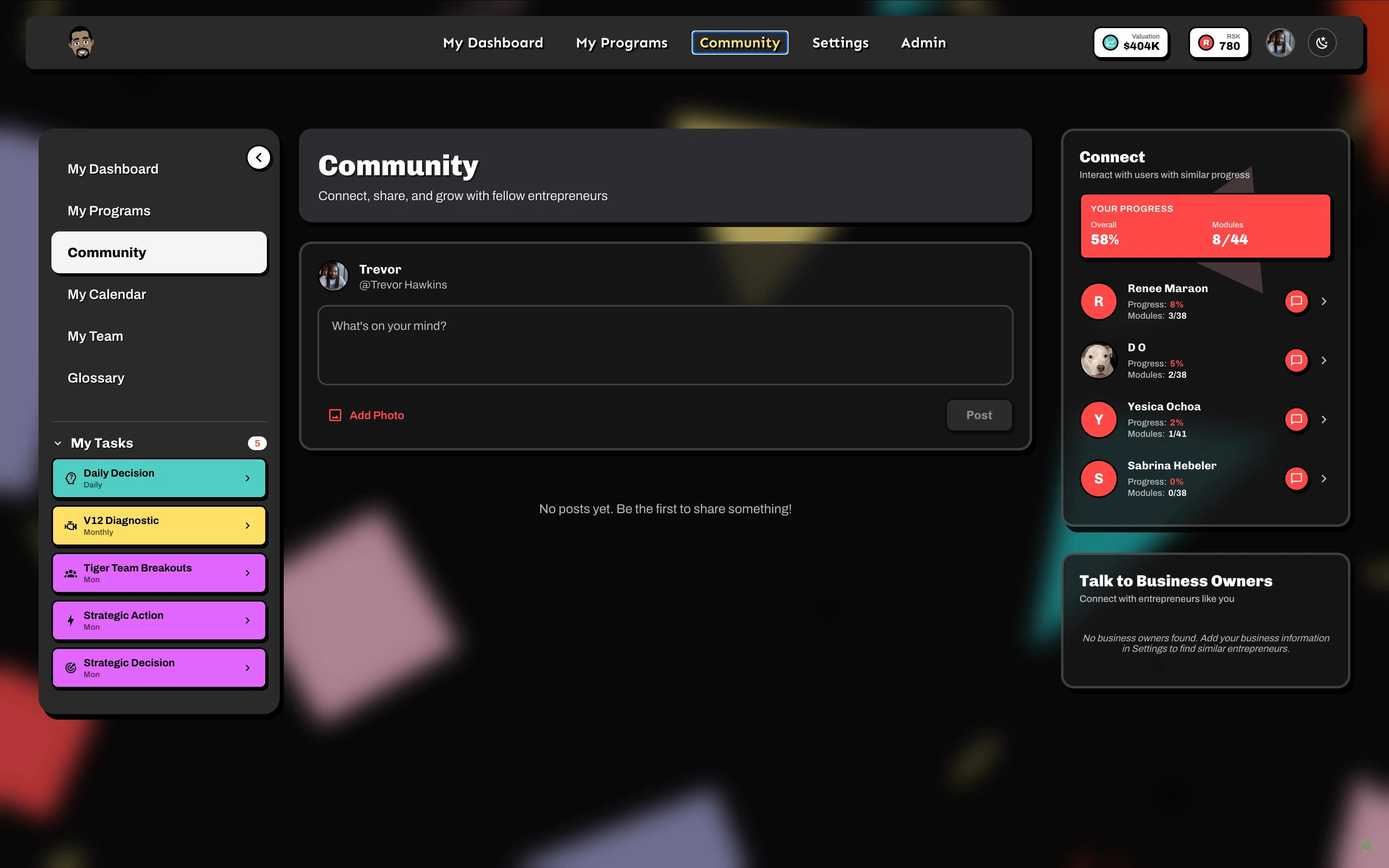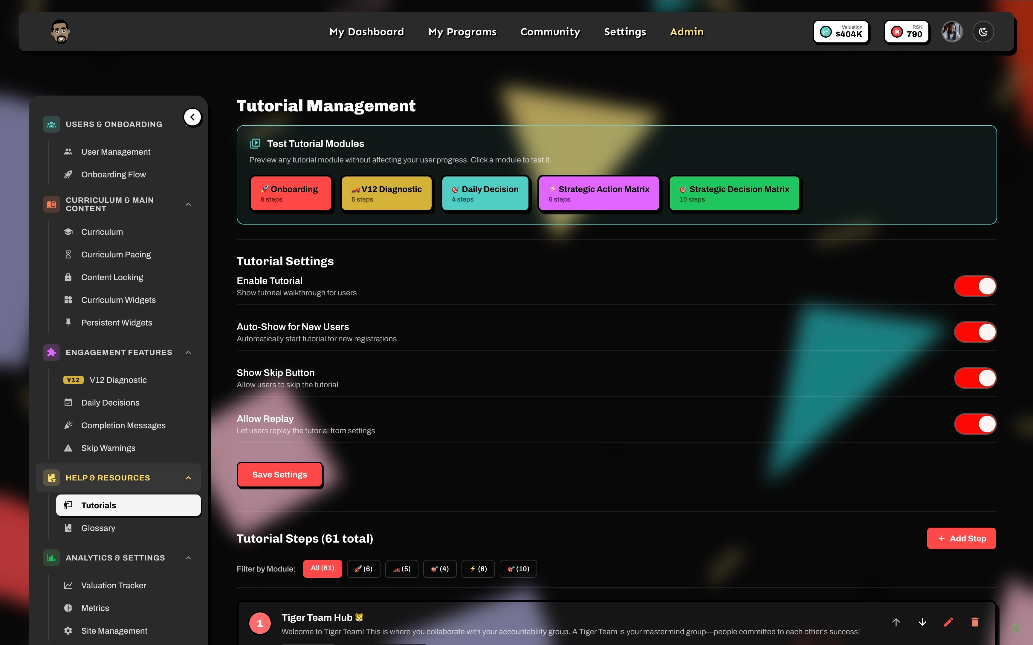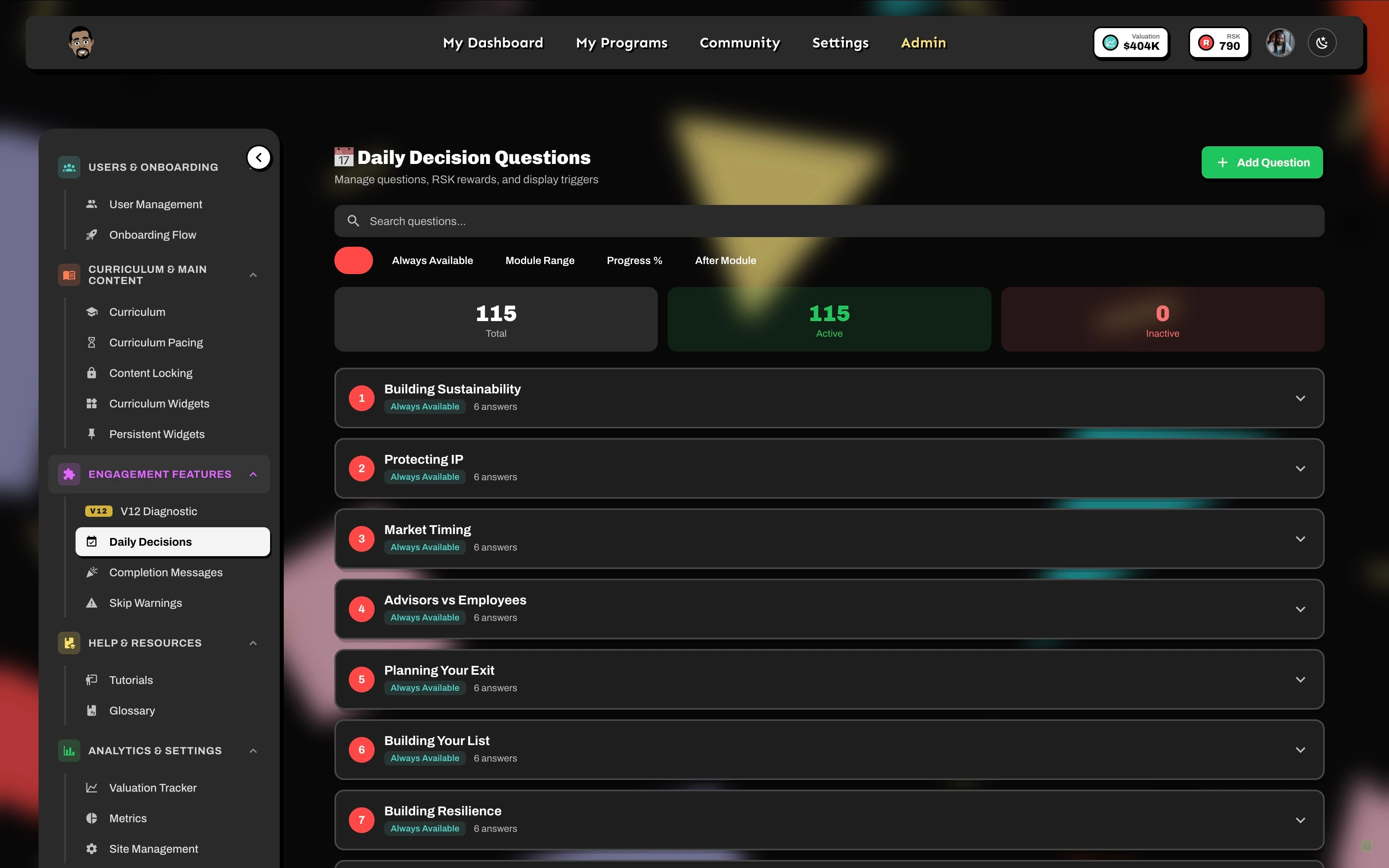 High Risk World: Twelve Month Millionaire transforms entrepreneurship education from passive consumption to active, personalized learning. By combining structured curriculum with interactive tools, AI-powered feedback, and gamification, the platform creates an engaging experience that drives completion and retention.