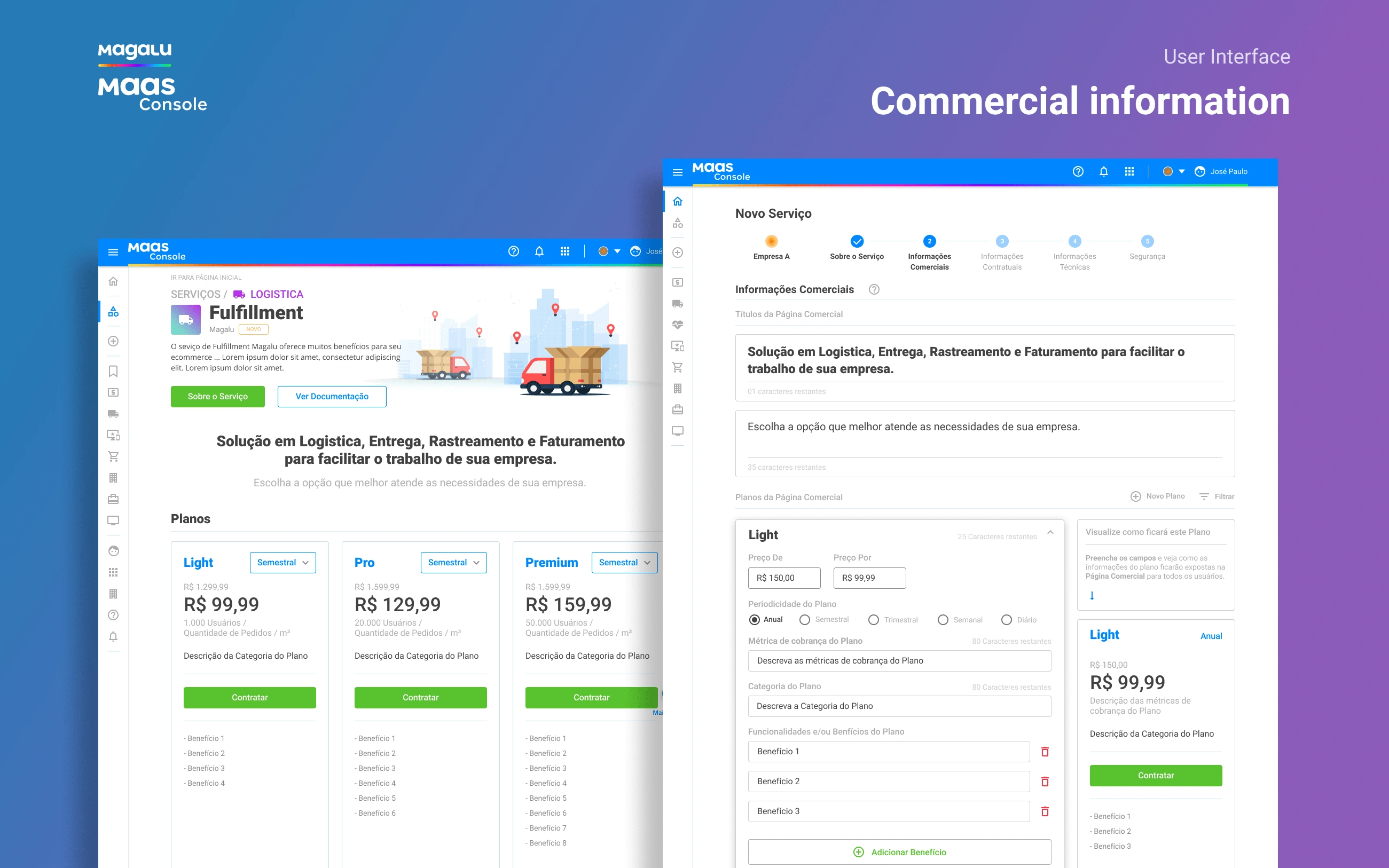 I worked at Magazine Luiza (One of the biggest retailer companies in Brazil) as UX/UI Designer, and my challenge there was to Design from scratch the ecosystem of the MaaS Platform (Magalu as a Service). The MaaS platform is formed by two applications: the MaaS Console and the Maas Account. The MaaS Console is a marketplace for retail services that will allow Magazine Luiza and other retail stores to sell digital or physical services online (free services too) to small retailers integrated on their own e-commerce, paying based on the demand used, like Firebase do it for back-end cloud services.
