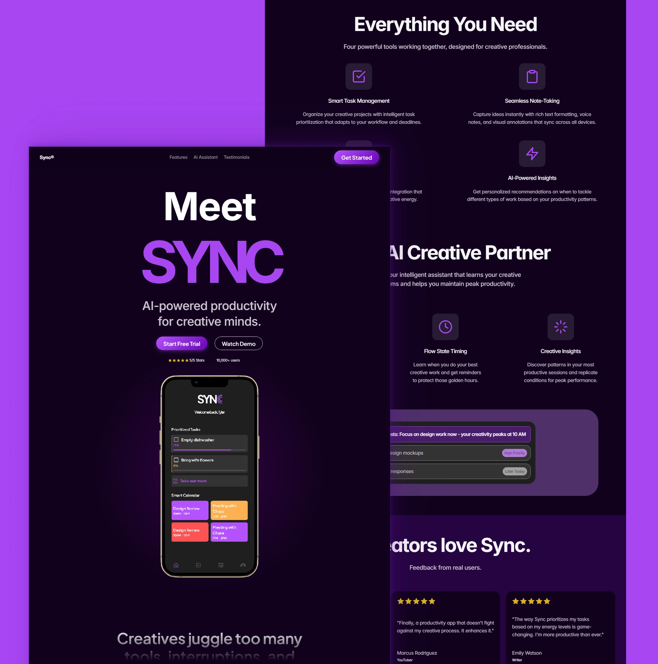 Interactive Framer landing page that shows Sync's features instead of just telling. Custom animations demonstrate the AI workflow in action. Every section leads visitors closer to the download button. Built entirely in Framer so updates are quick and deployment is seamless.