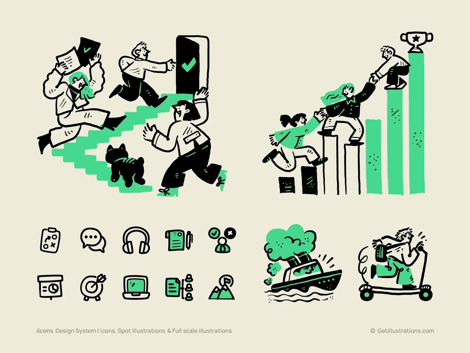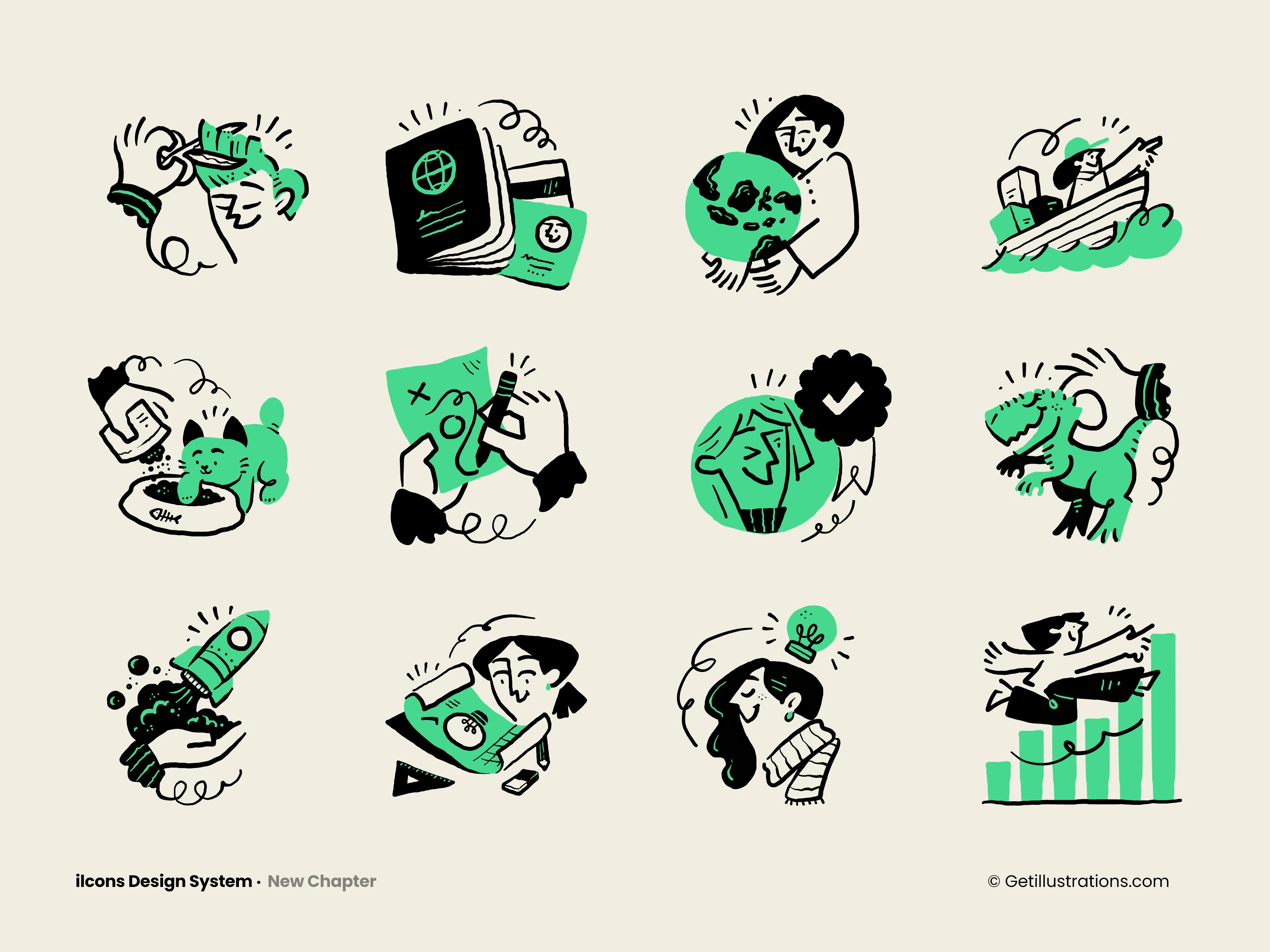 This style was created to bridge the gap between icons and illustrations, it focuses on small illustrations simple yet packed with details and energy.