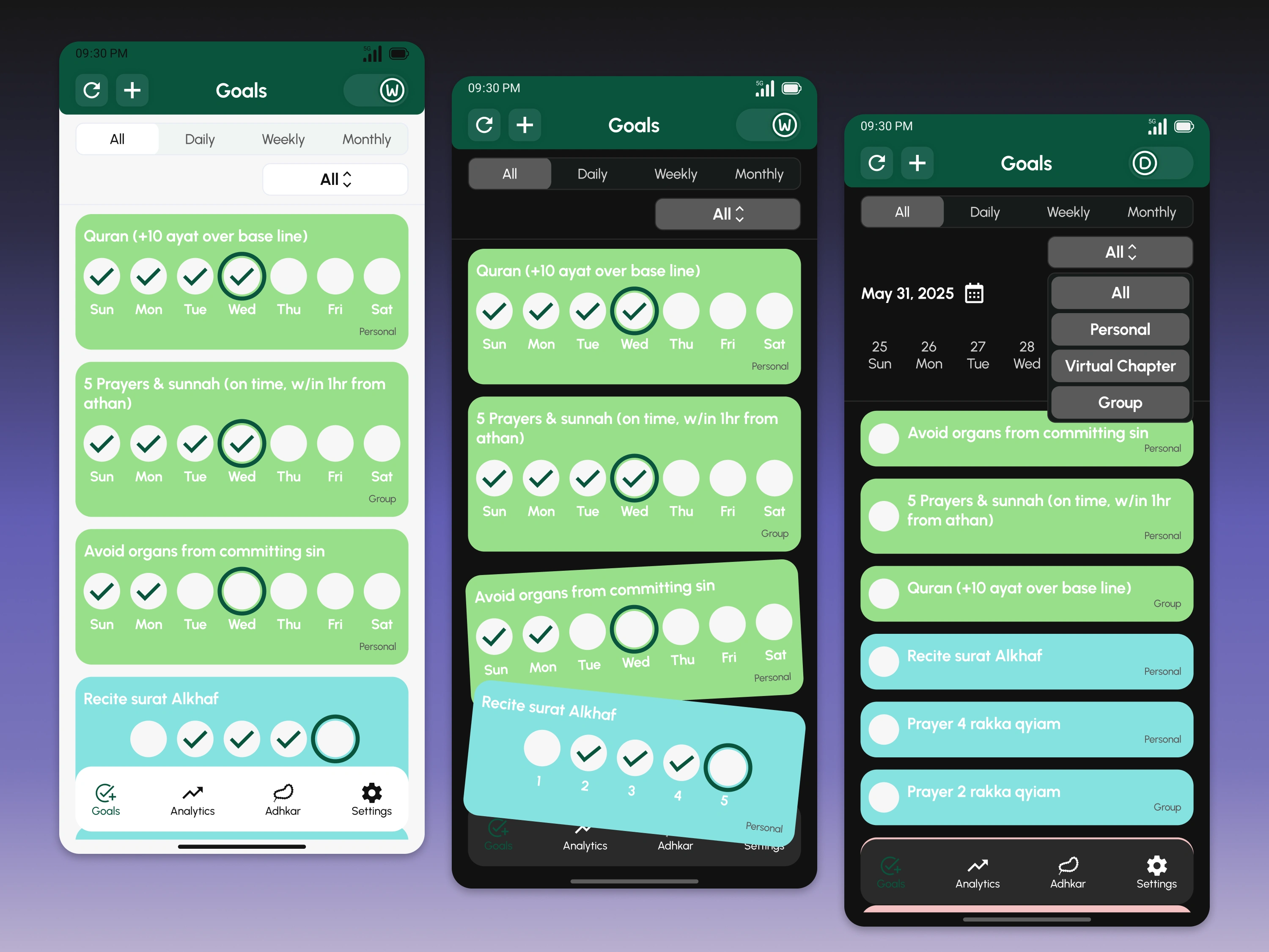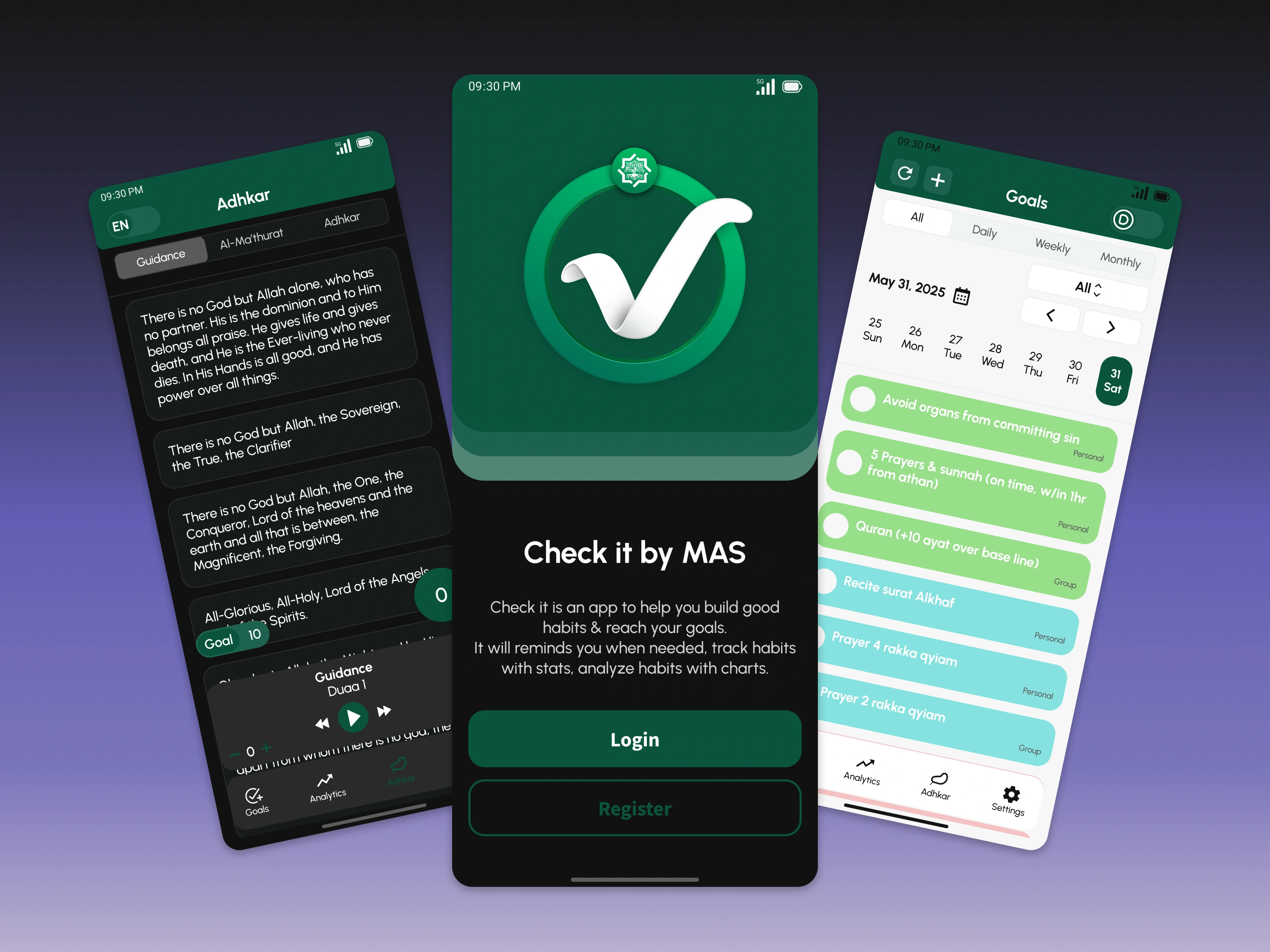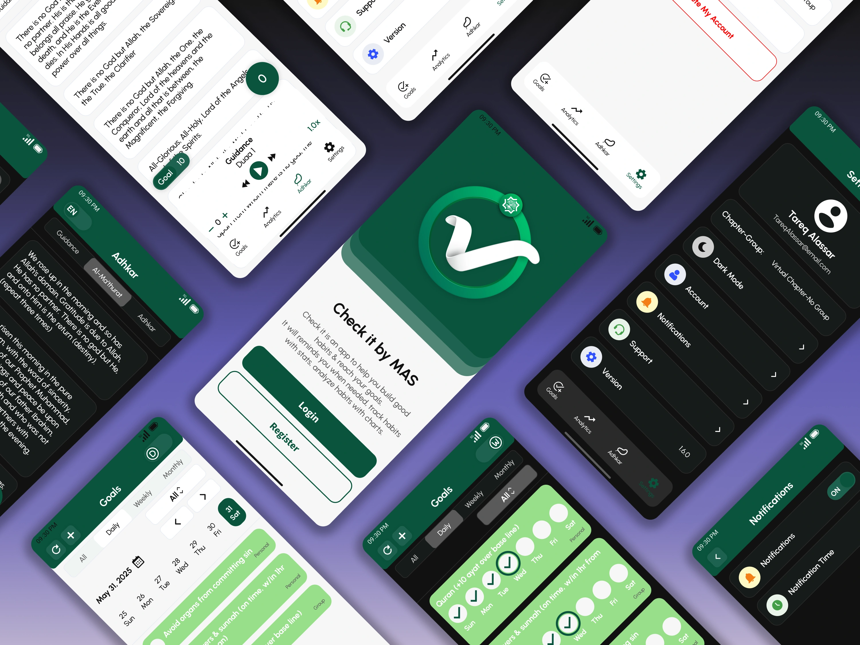 Redesigned the "Check it by MAS!" app and logo for a modern, intuitive experience in light and dark modes. Enhanced goal setting, progress tracking, and group collaboration. Created a new logo with clean typography and vibrant gradients, designed a splash screen, and ensured strong brand identity and seamless visual consistency across all platforms and themes. Paid special attention to unique typography and letter combinations, reflecting my passion for custom logo design and detail-focused branding.