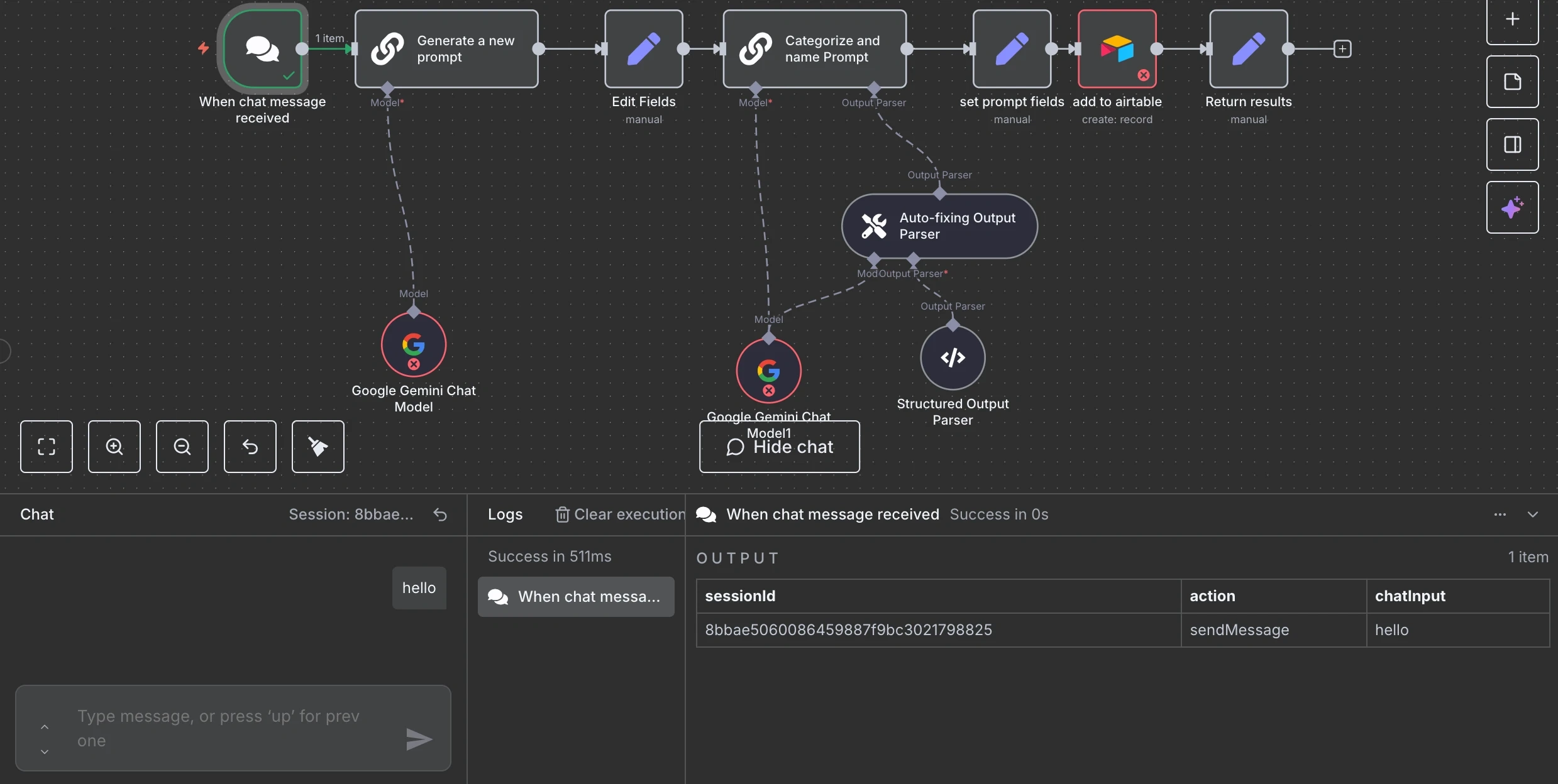 This workflow demonstrates how I design intelligent AI-driven automations that combine real-time chat, AI reasoning, and structured data logging for later analysis.