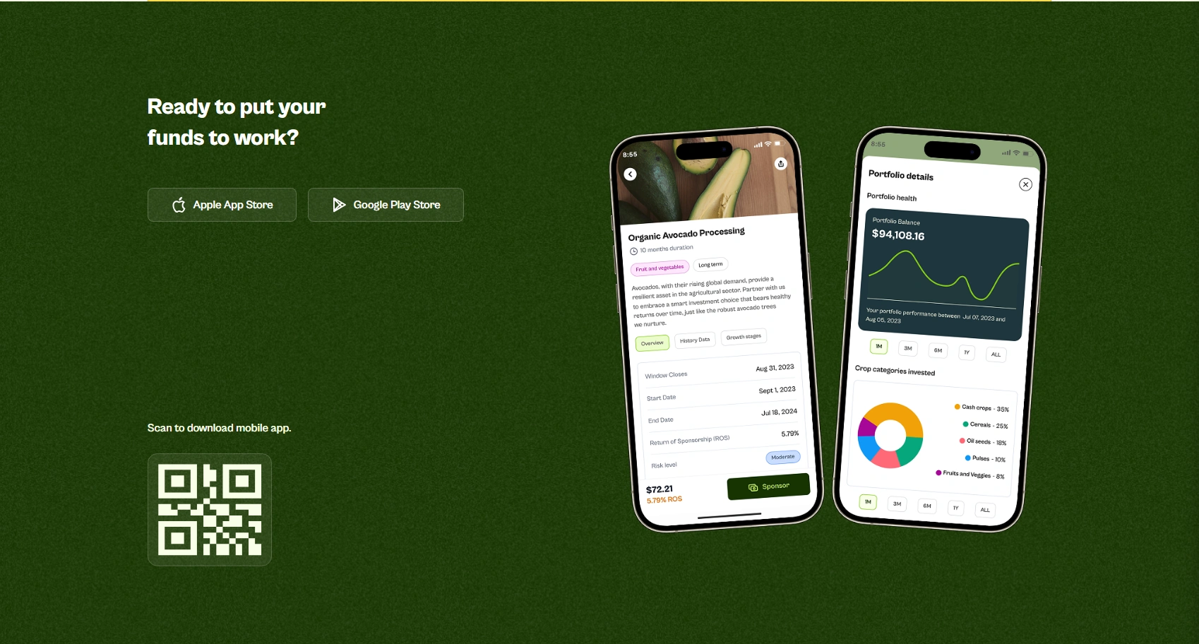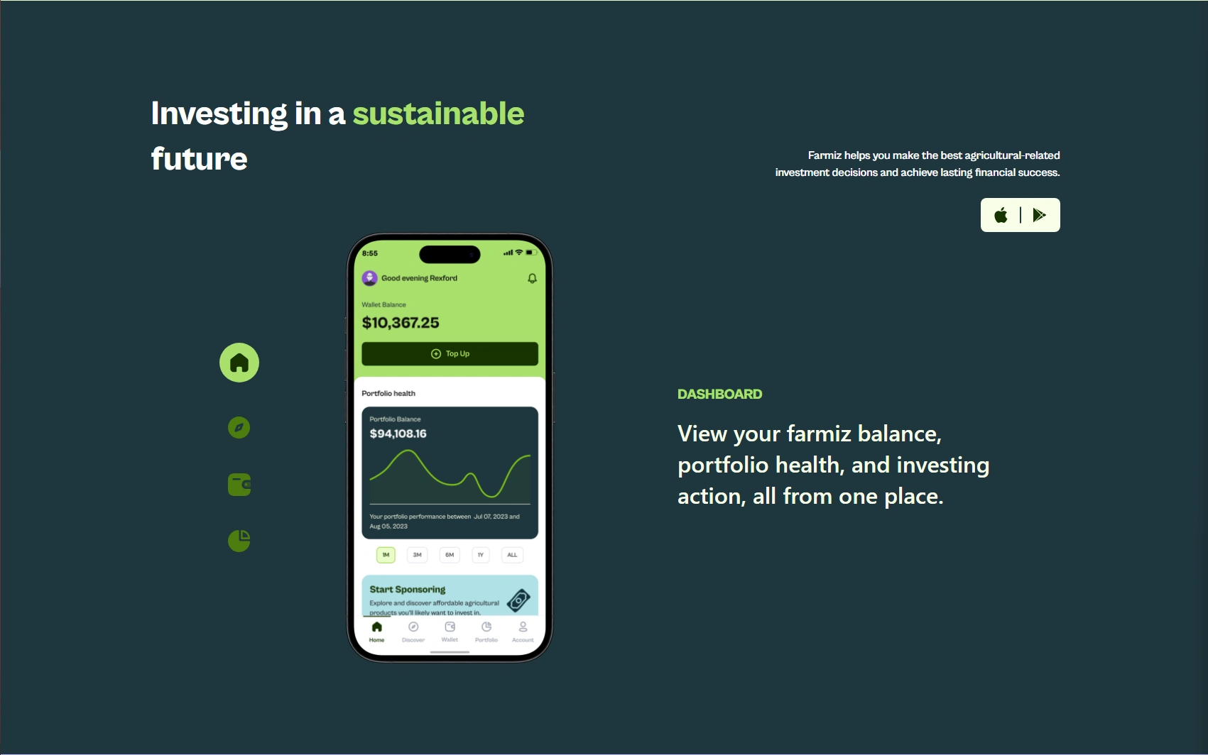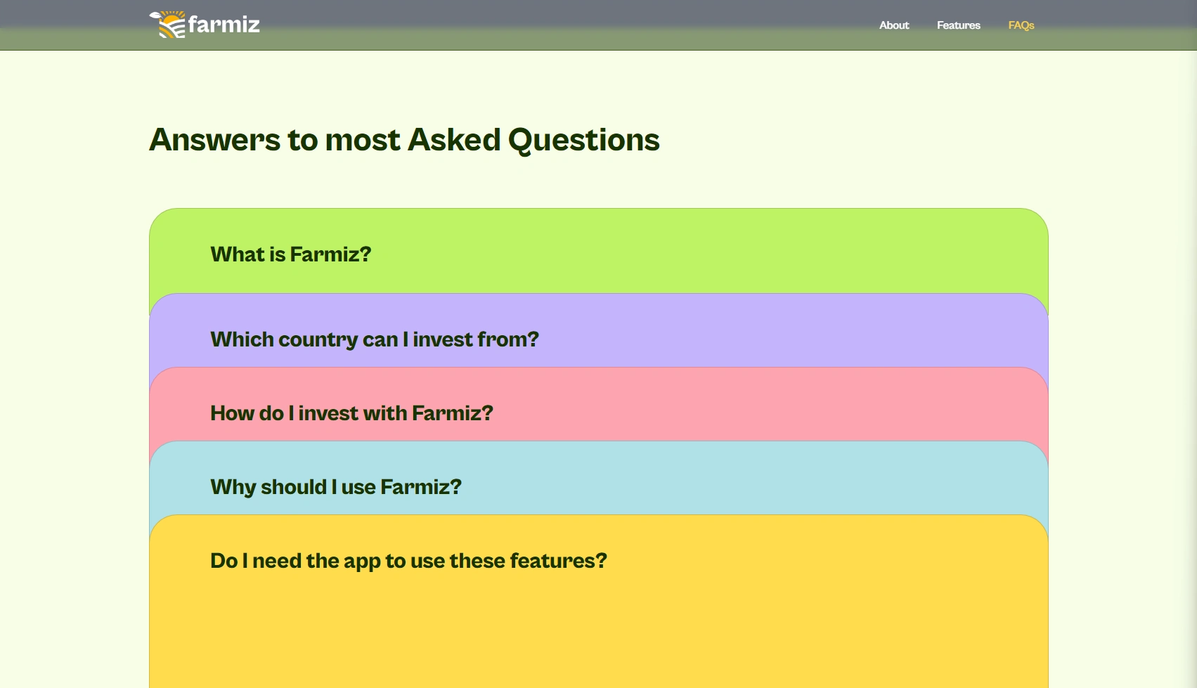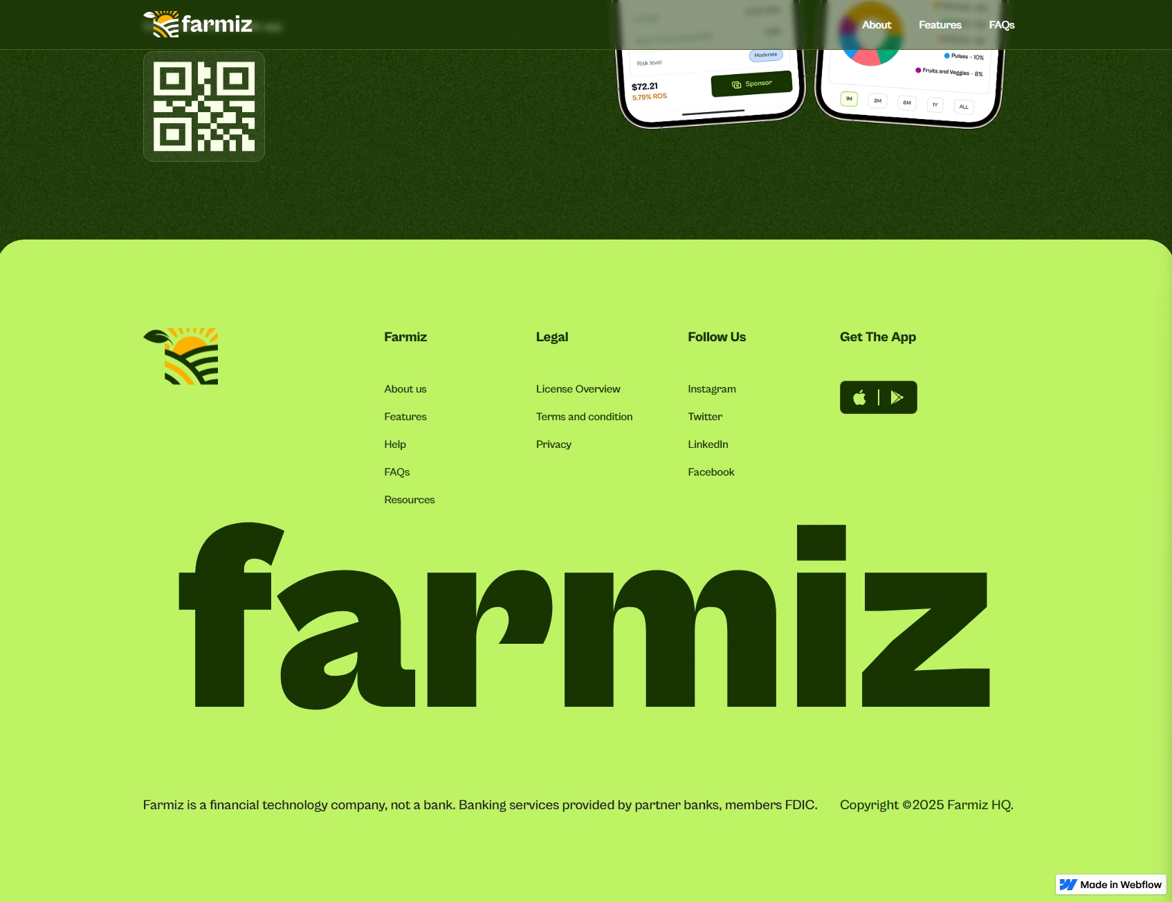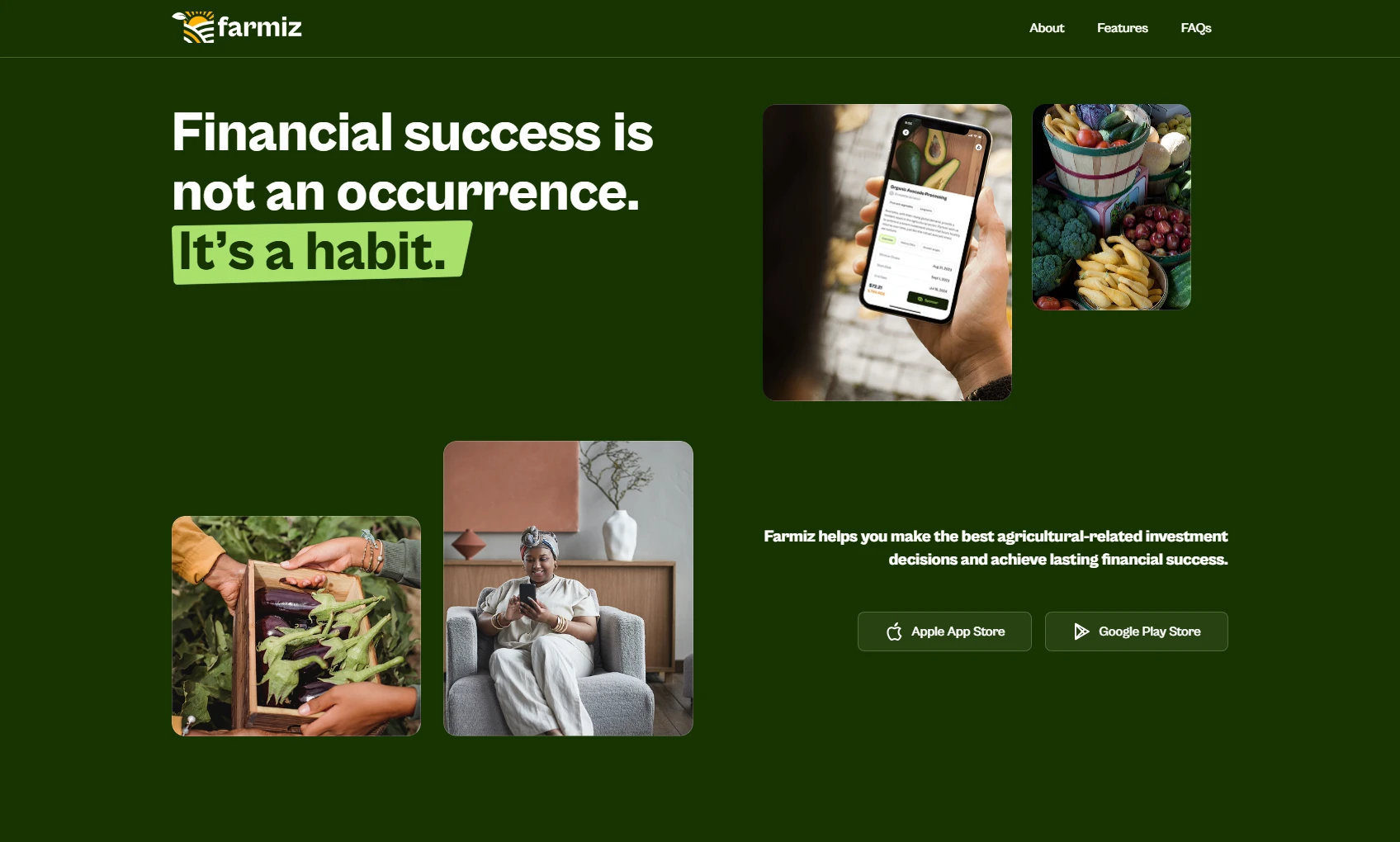 Farmi is a test exploration landing page for a brand focused on agricultural-related investment, emphasizing clarity and a funnel to allow users to download the app while telling the story of trust and accessibility.