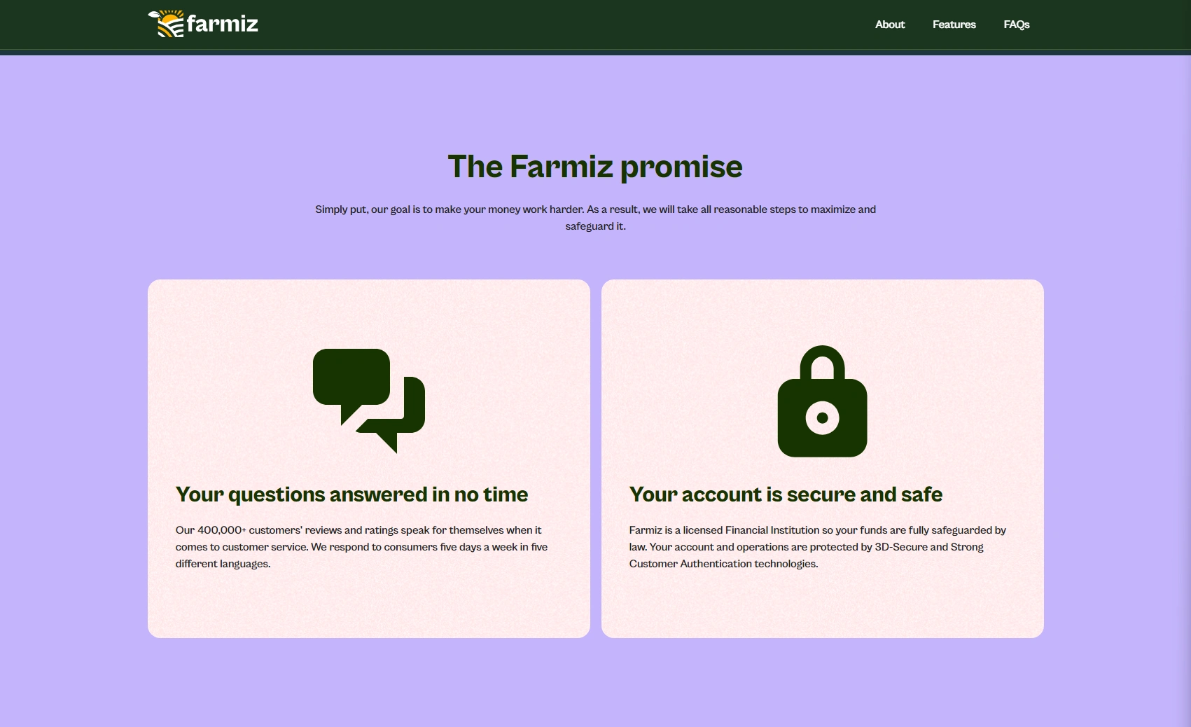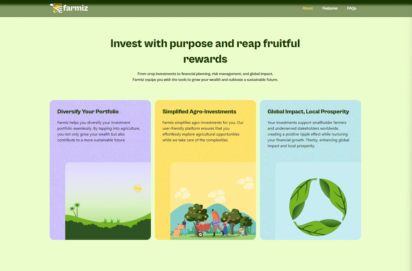 OUTPUT- create a simple, clear, agricultural-related investment and conversion website that defines FARMIZ as a trustworthy, credible, FDIC-protected investment brand, supporting early agriculture explorations and portfolios.