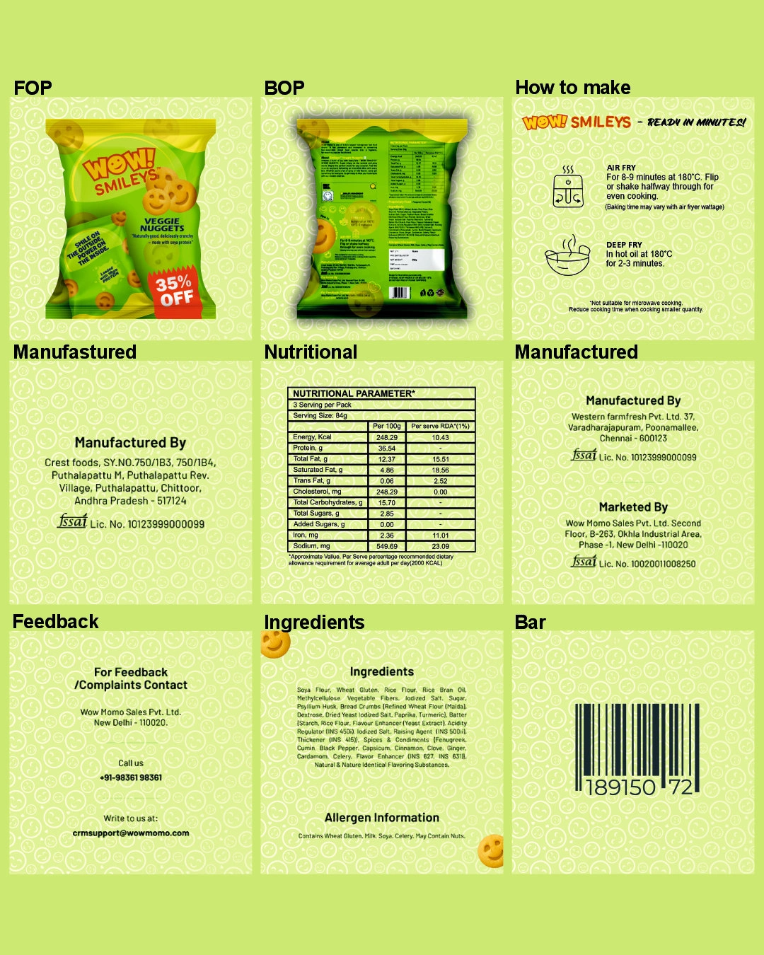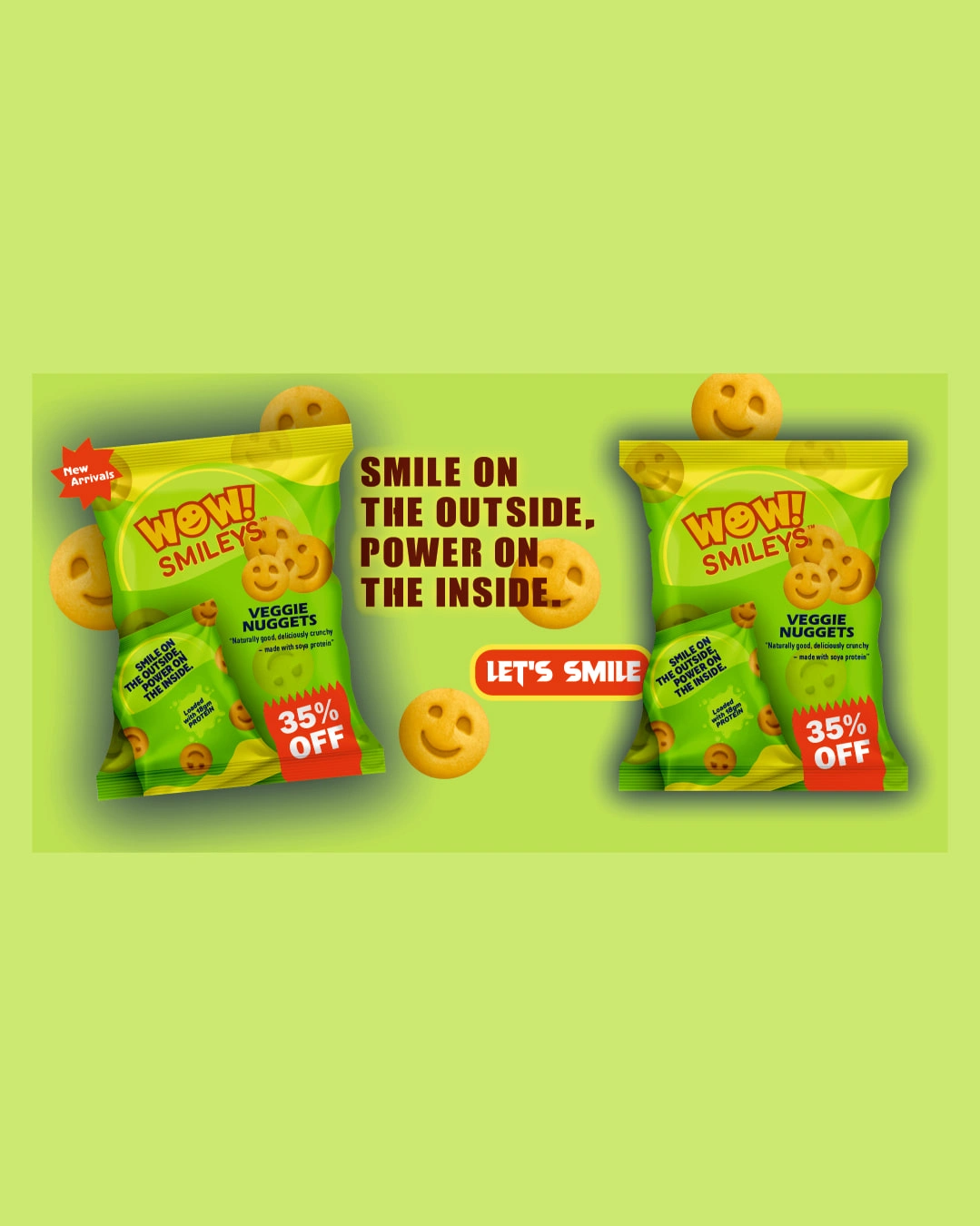 WOW! Smileys Veggie Nuggets is a plant-based snack brand that brings together taste, fun, and nutrition. The design concept highlights the tagline “Smiles on the Outside, Power on the Inside”, showcasing both the joyful, playful vibe of the product and its strong protein-packed benefits.